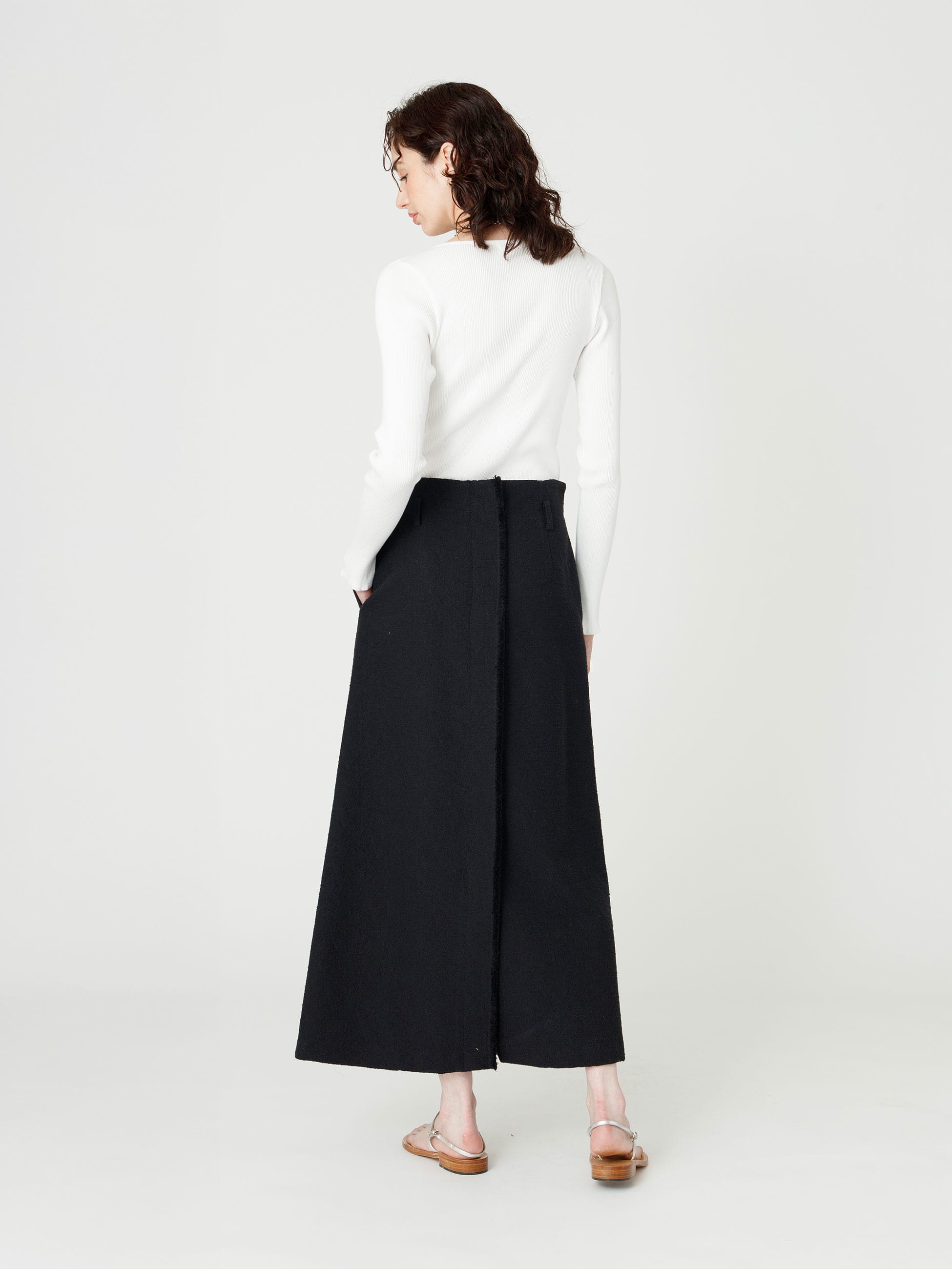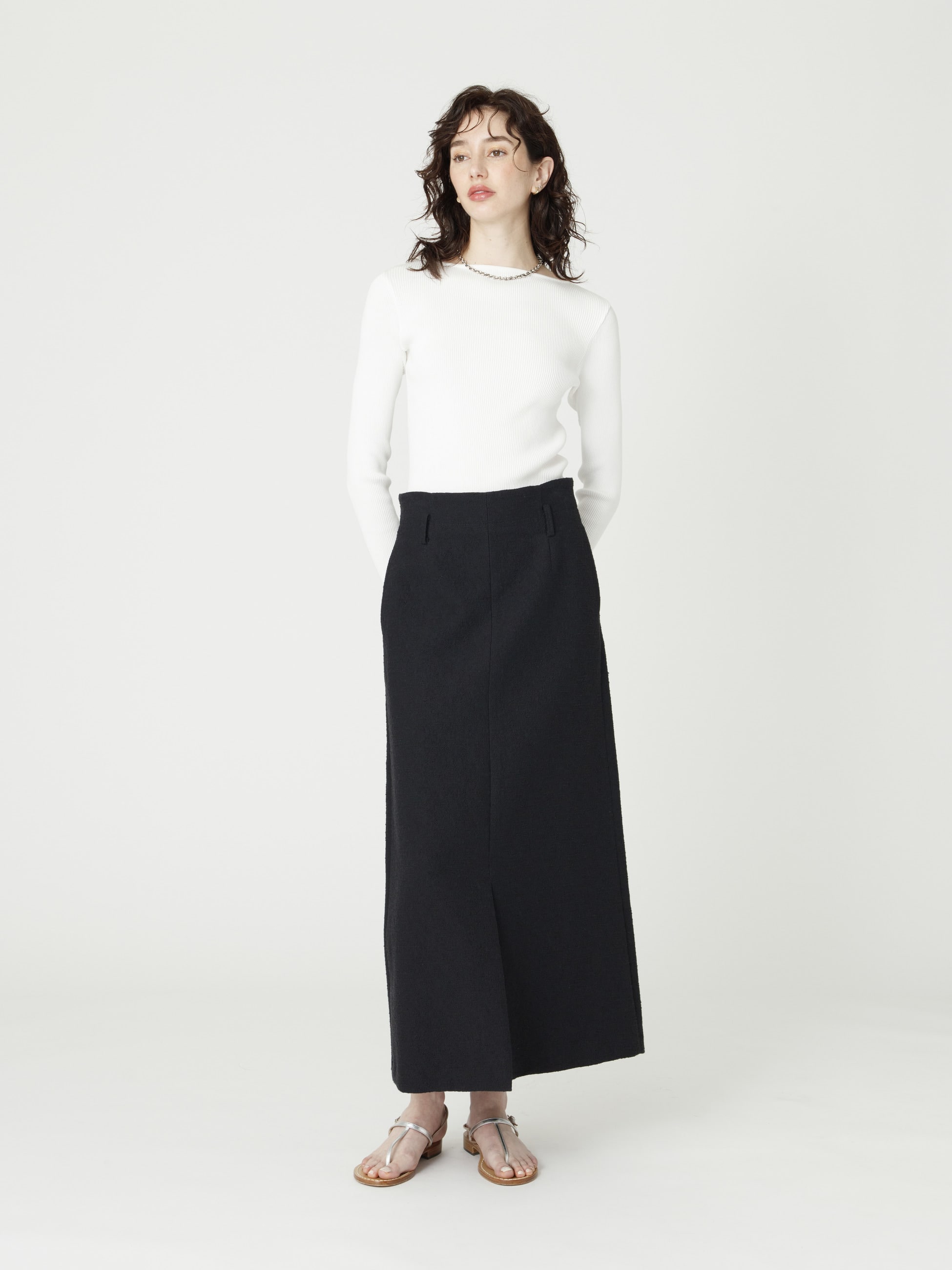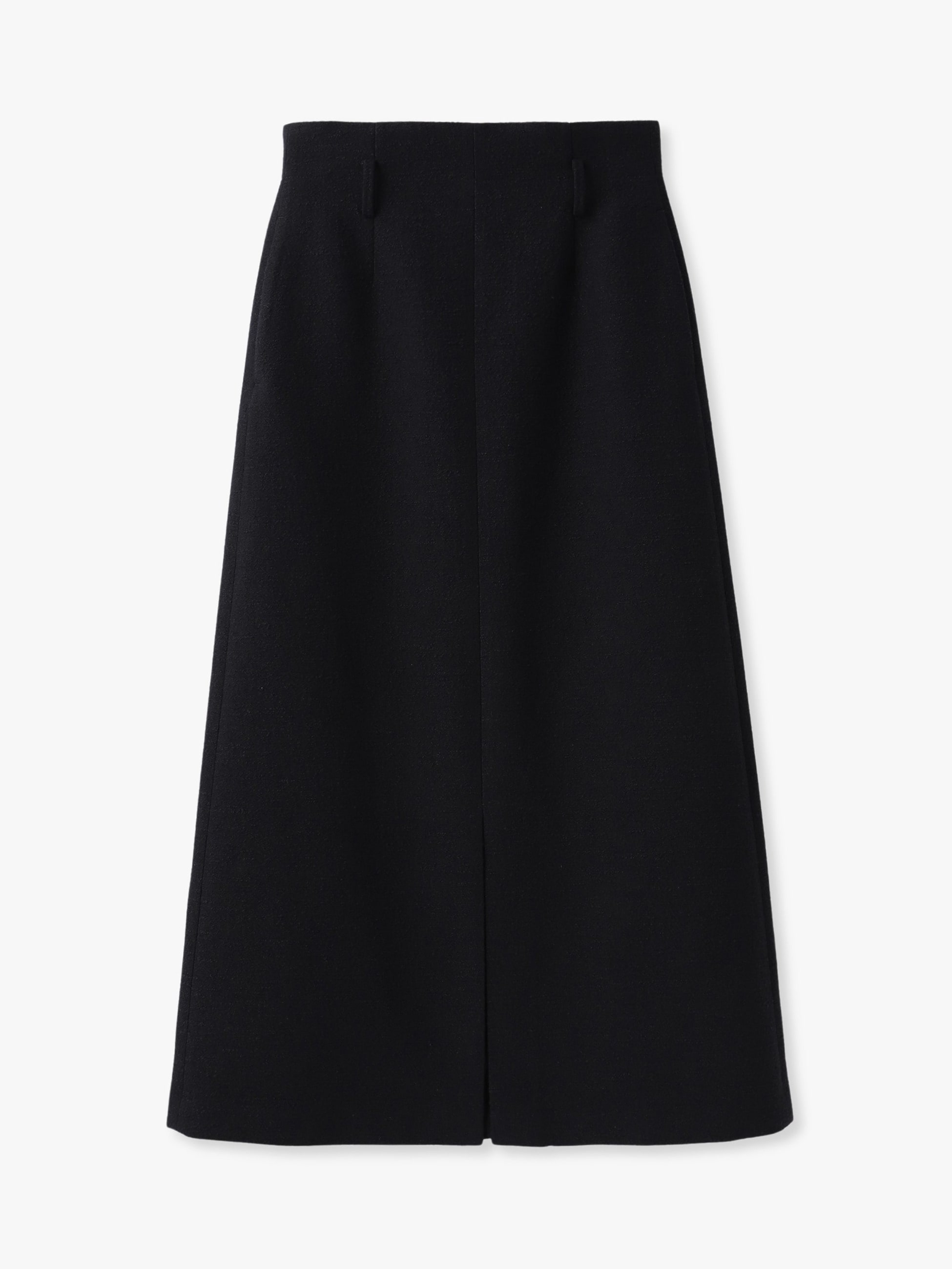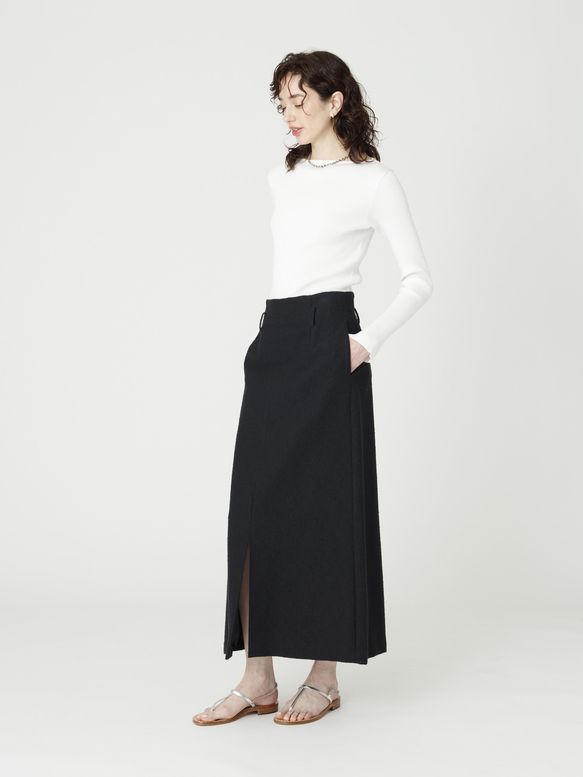 スッキリとしたIラインシルエットがしなやかで、フェミニンな印象を引き立てるタイトスカートです。独特な凹凸感や深みのある表面感が特徴で、洗練されたシンプルなデザインの中に、フロントスリットやバックのフリンジディテールが上品なアクセントに。ベルトをしてウエストマークしたスタイリングも素敵です。