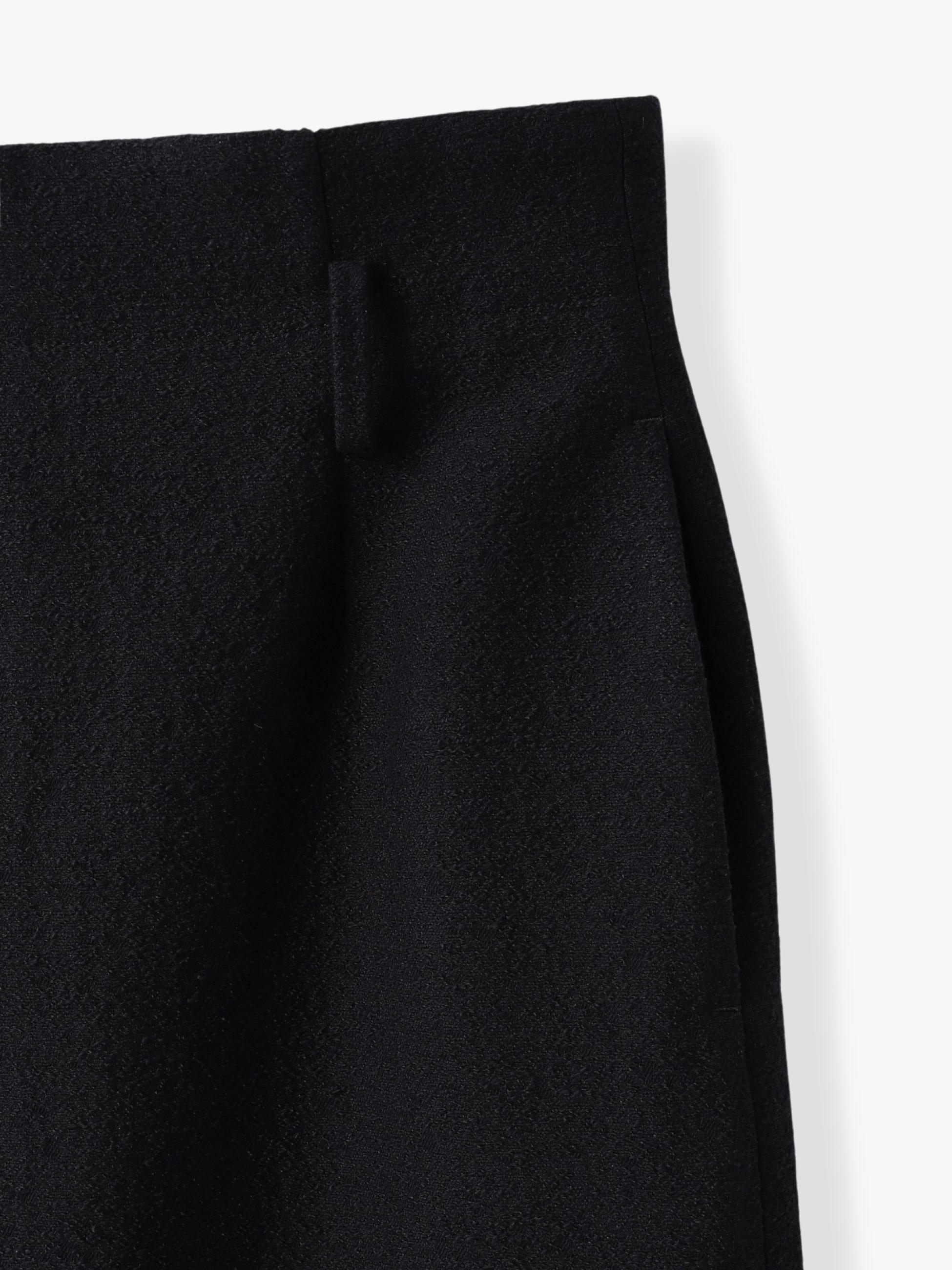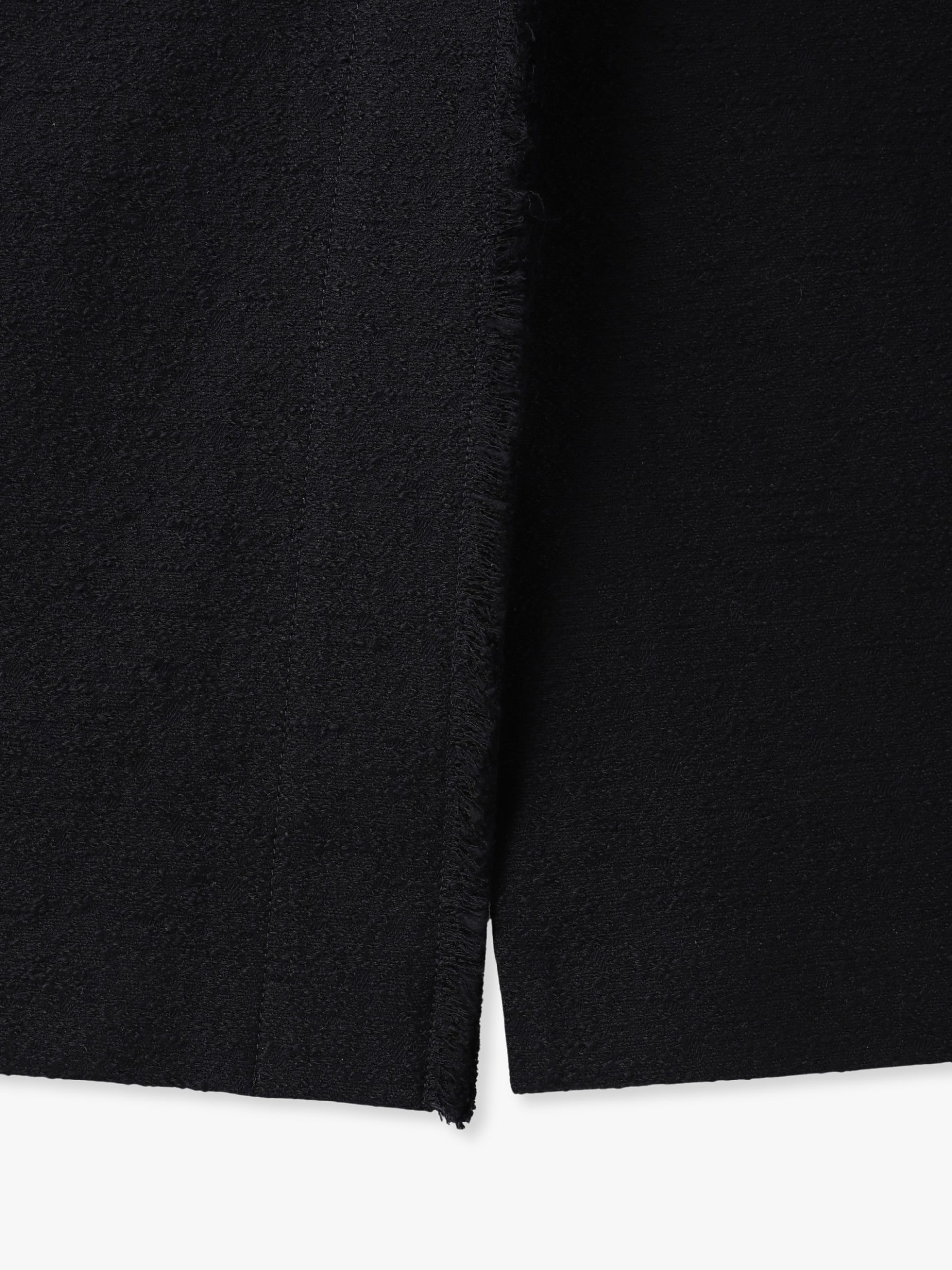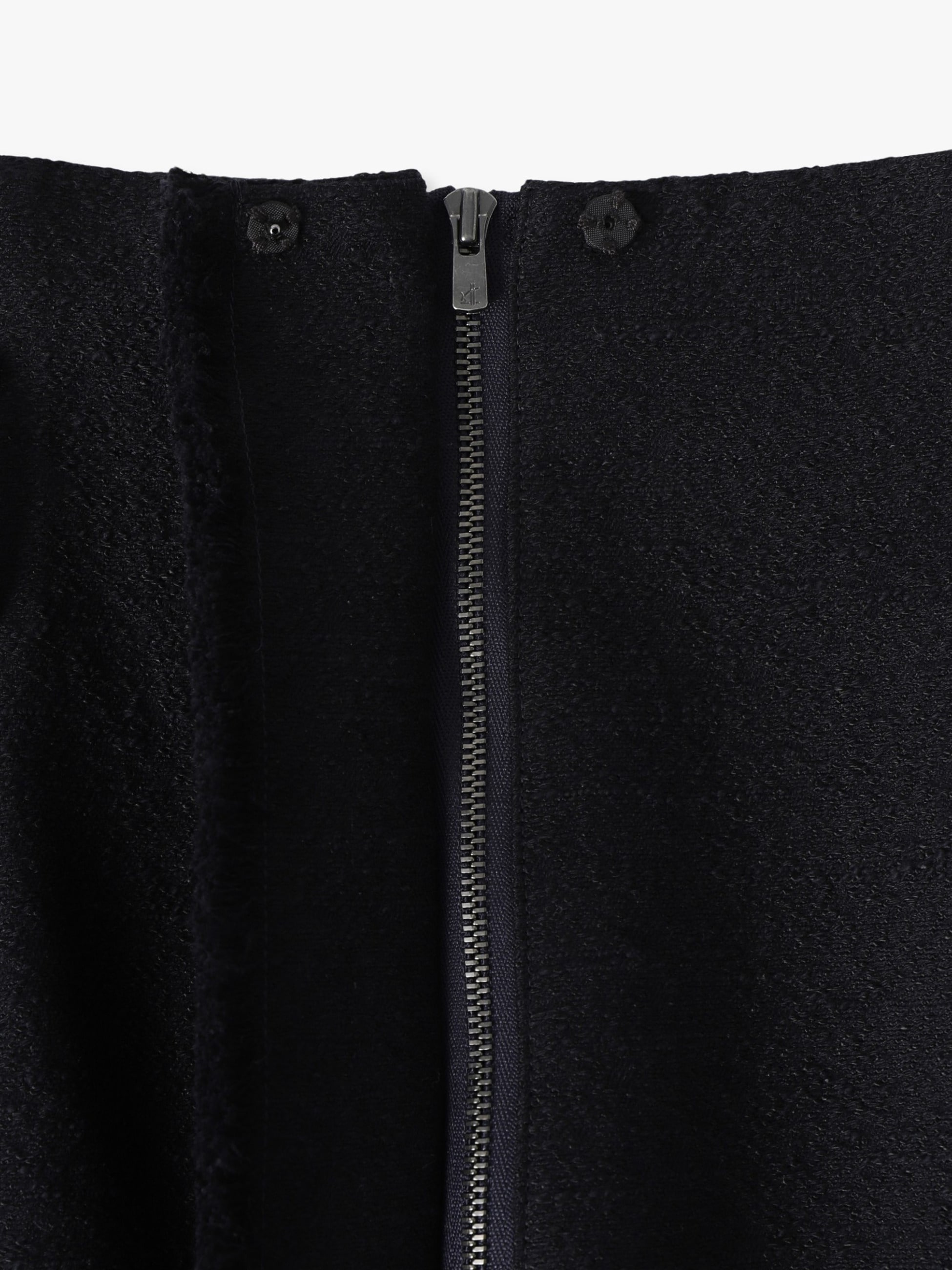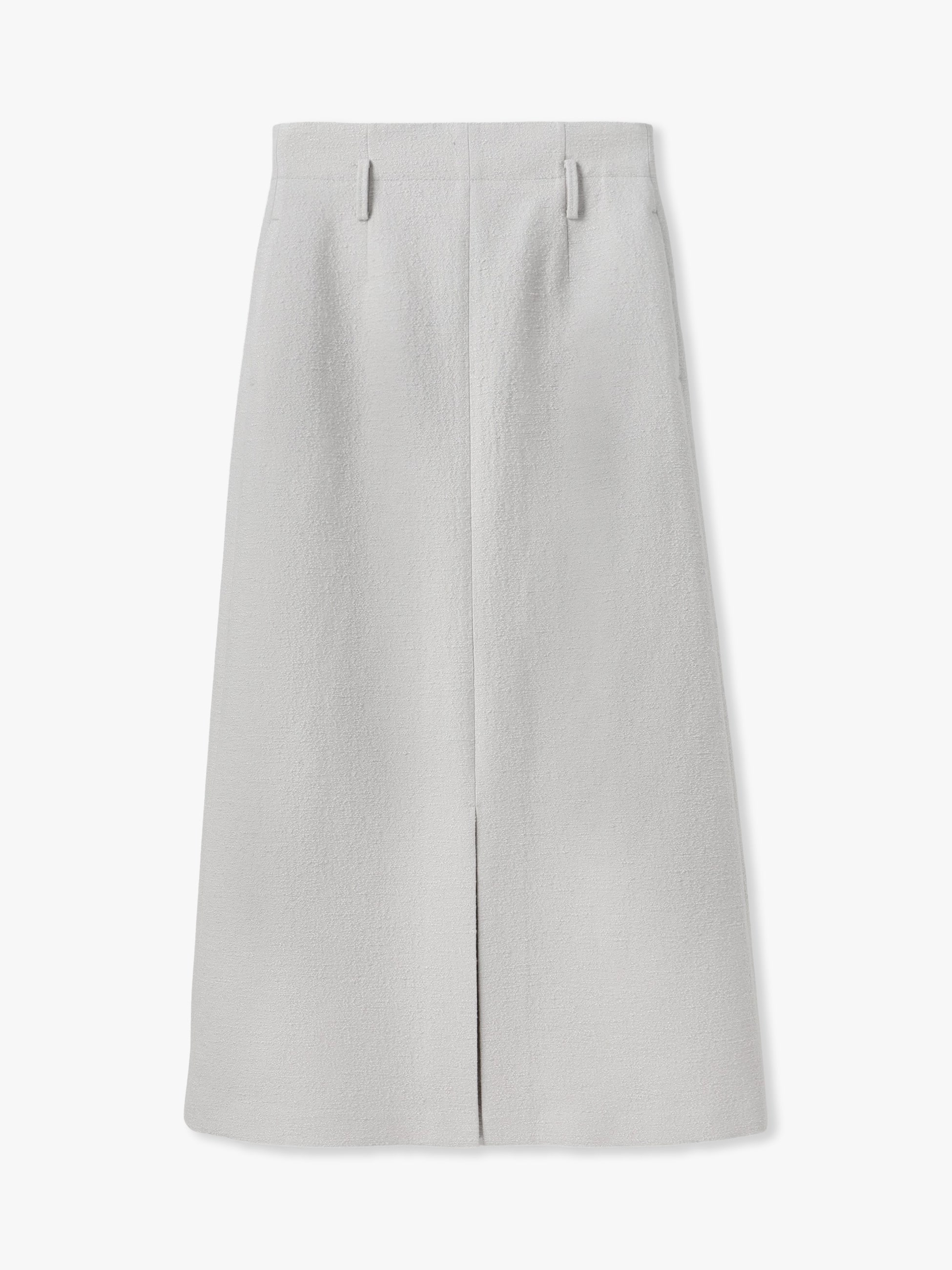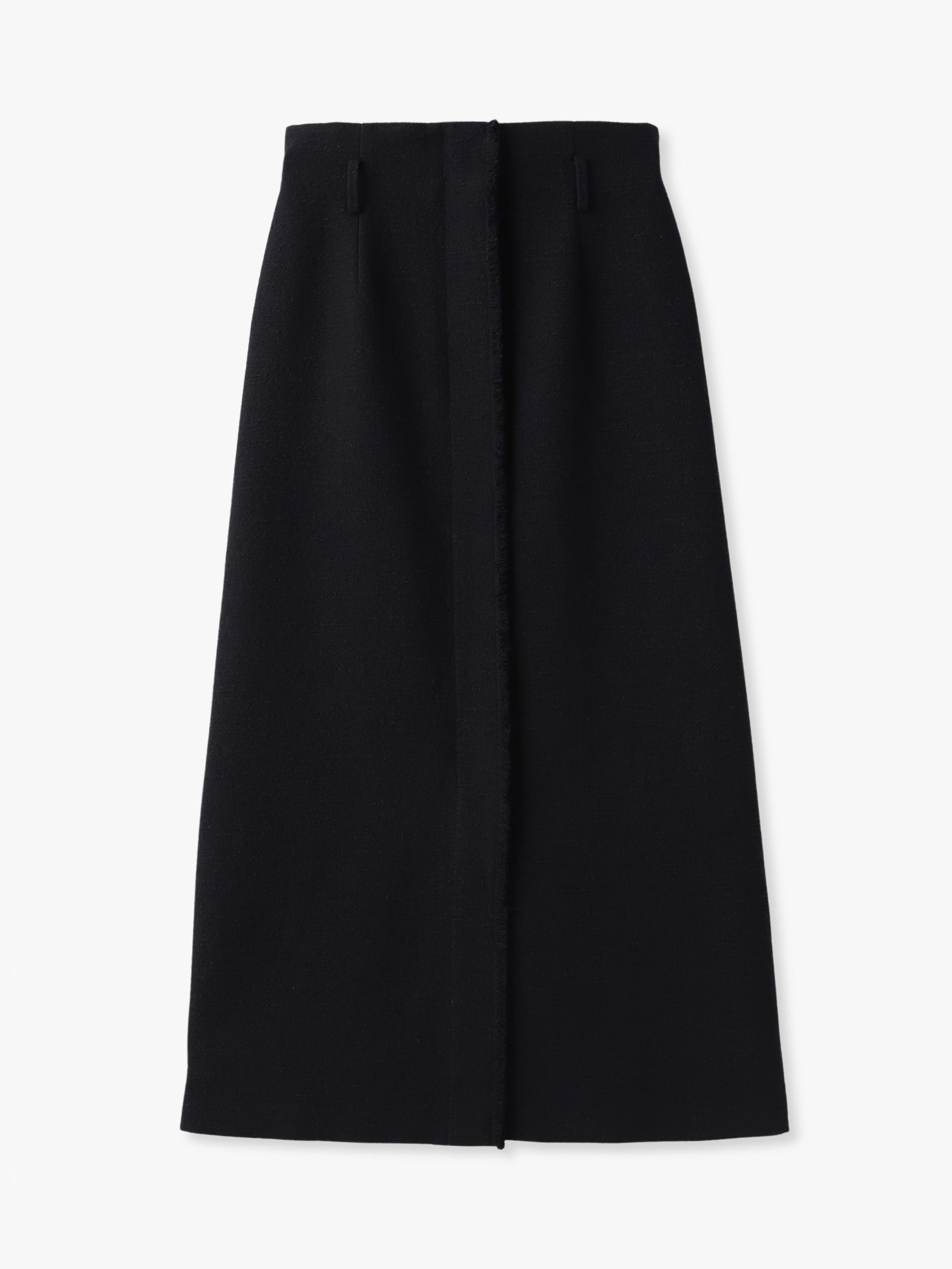 - スッキリとしたIラインシルエットがしなやかで、フェミニンな印象を引き立てるタイトスカートです。独特な凹凸感や深みのある表面感が特徴で、洗練されたシンプルなデザインの中に、フロントスリットやバックのフリンジディテールが上品なアクセントに。ベルトをしてウエストマークしたスタイリングも素敵です。