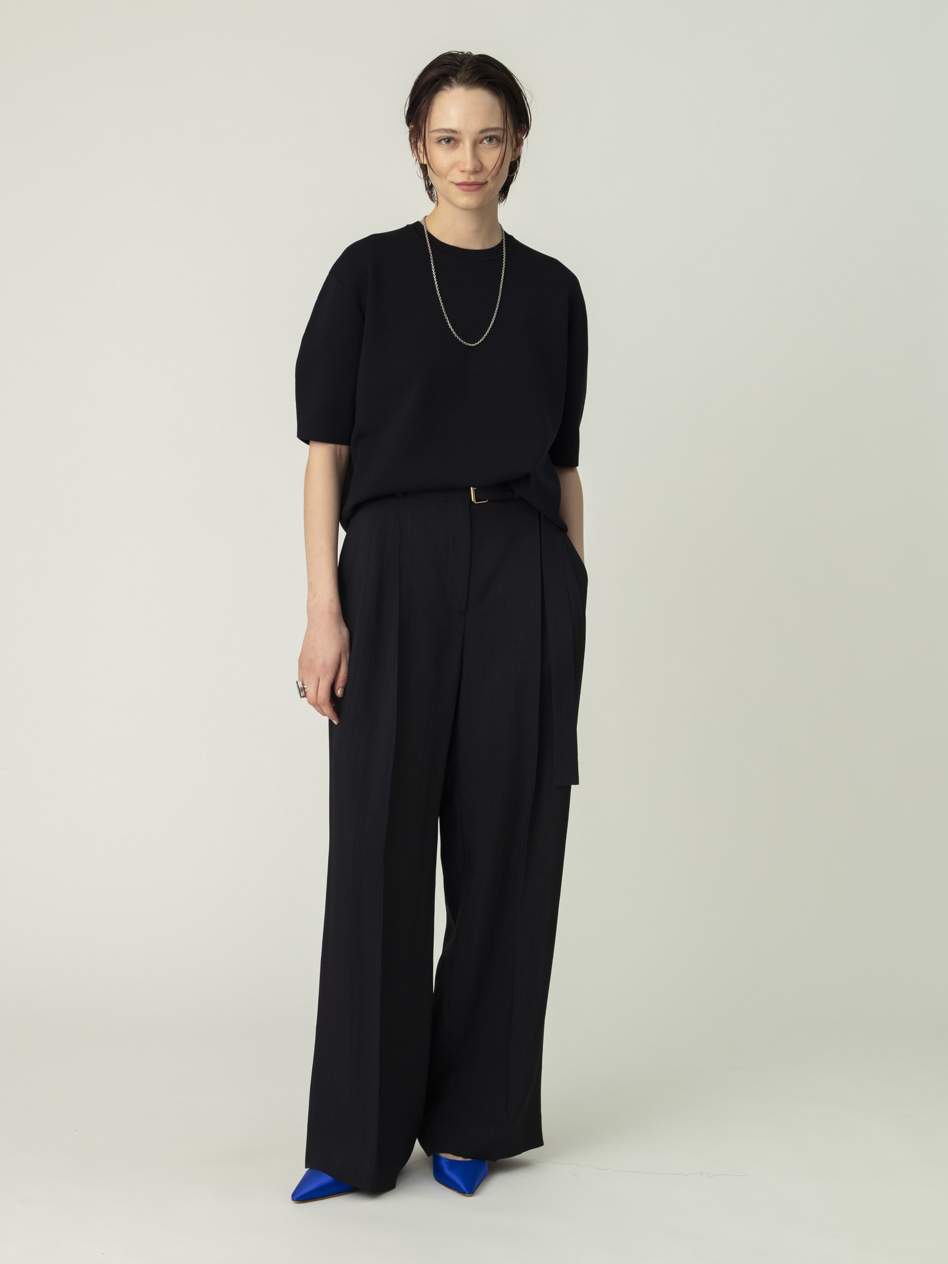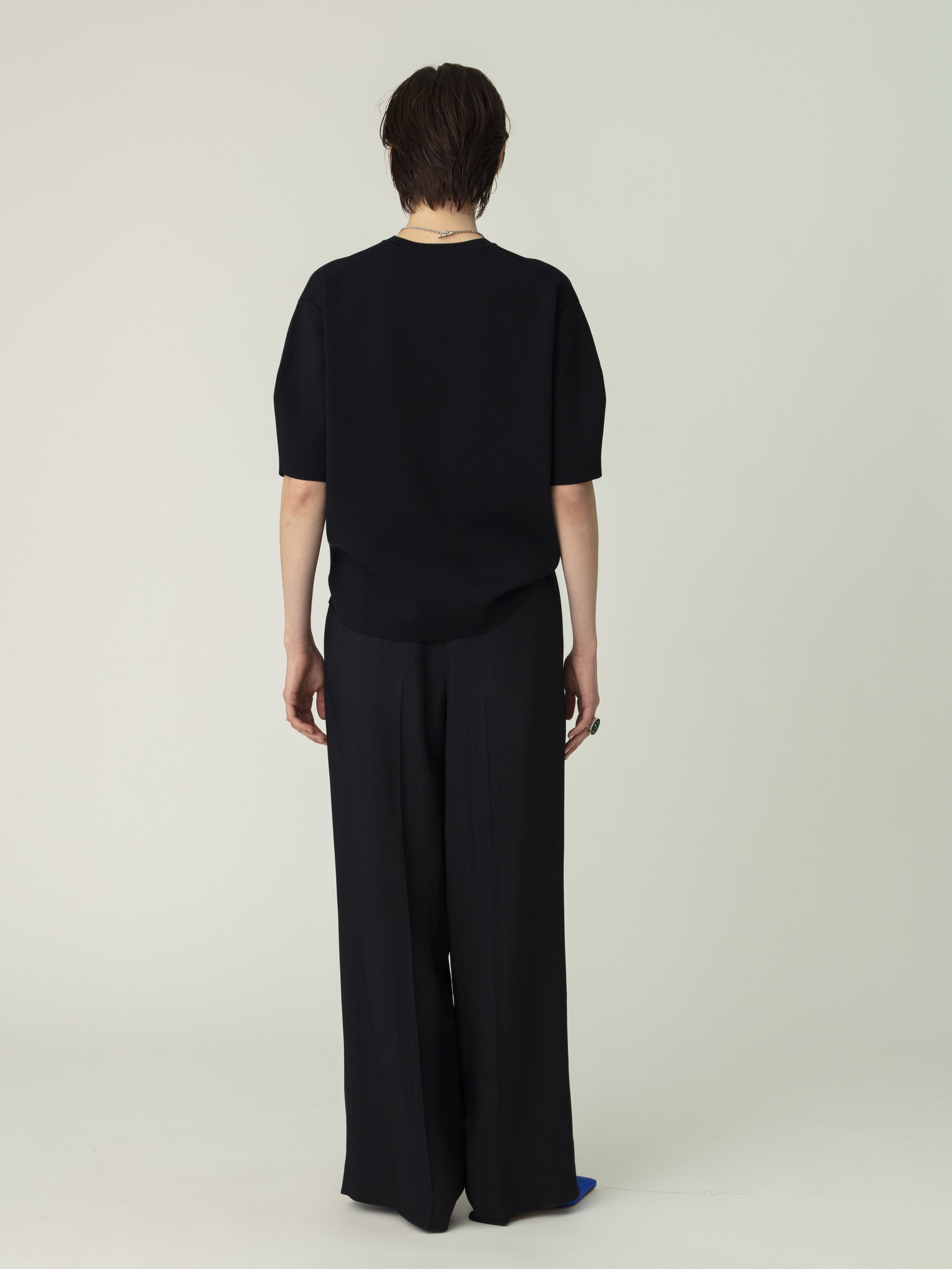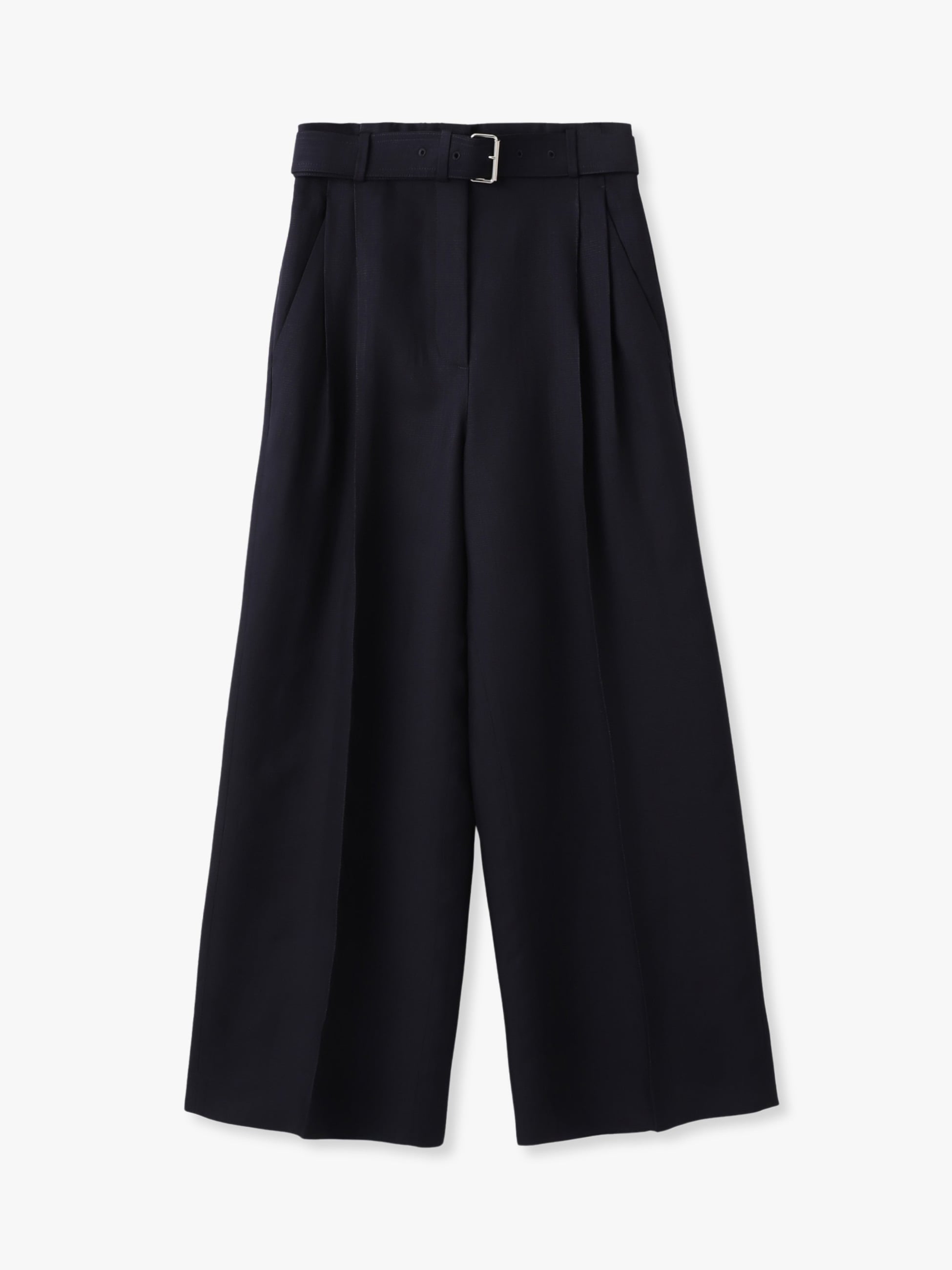 - ビスコース100%のスラブ糸で仕立てたブッチャー素材のワイドパンツは、弾力があり艶感のある生地が上品な印象で、カジュアルからオフィスまで幅広く着こなしをカバーします。後ろウエストはゴムで、ストレスフリーな着心地なのも嬉しいポイント。白金のバックルが付いた共地ベルトでウエストマークしていただくのも素敵です。