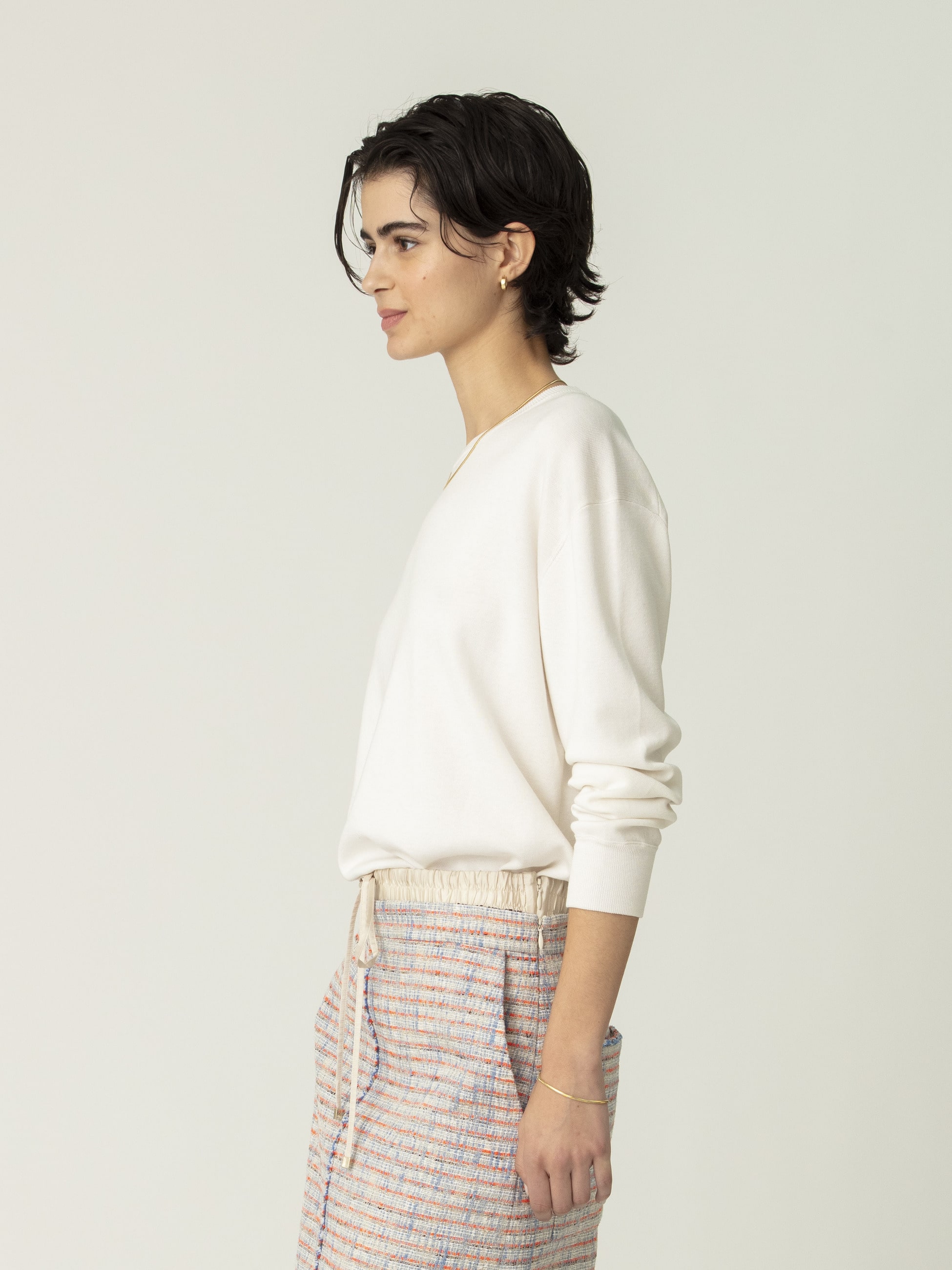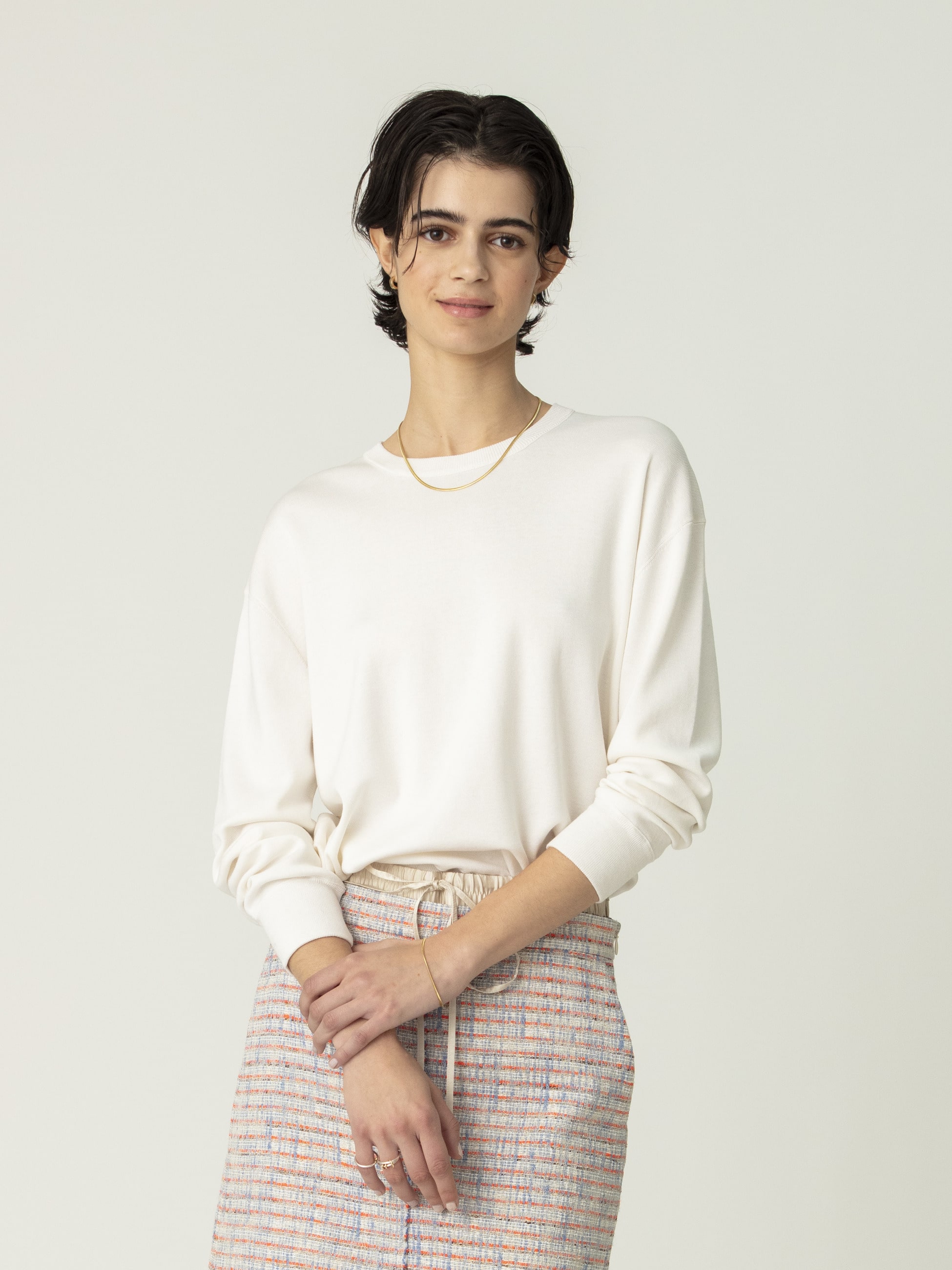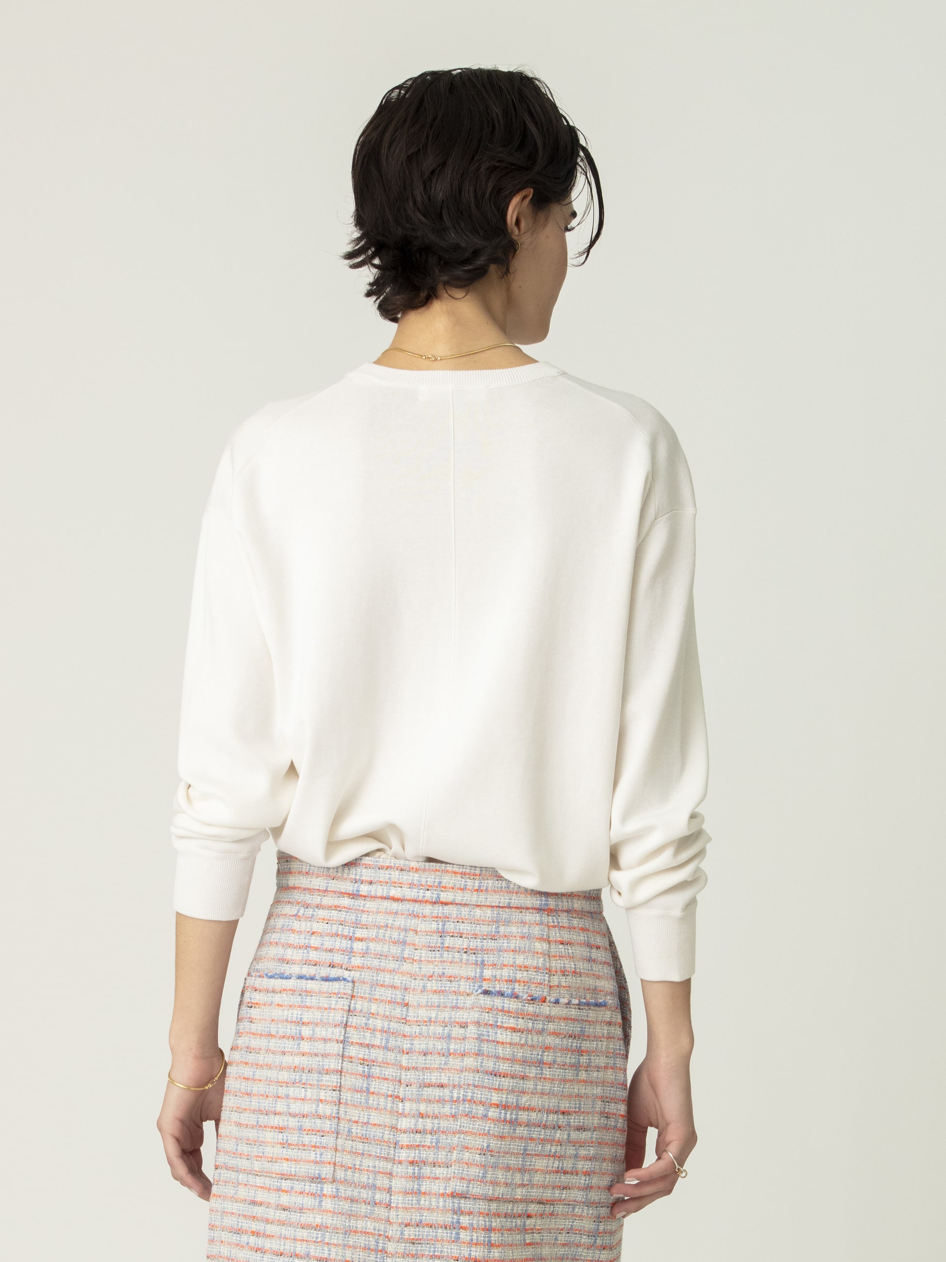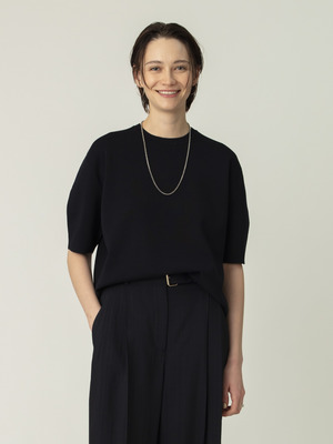 - シルクの上品な光沢と柔らかさに、コットンの程よいハリと耐久性を加えた人気のハイゲージニットシリーズです。オーバーサイズのニットプルオーバーは、総針で丁寧に編み立てることで素材の落ち感とふくらみを引き出し、袖口や裾に厚みを持たせカジュアルな雰囲気もプラス。シンプルなカラーと上質感のある表情が、シンプルなスタイリングに華を添えます。