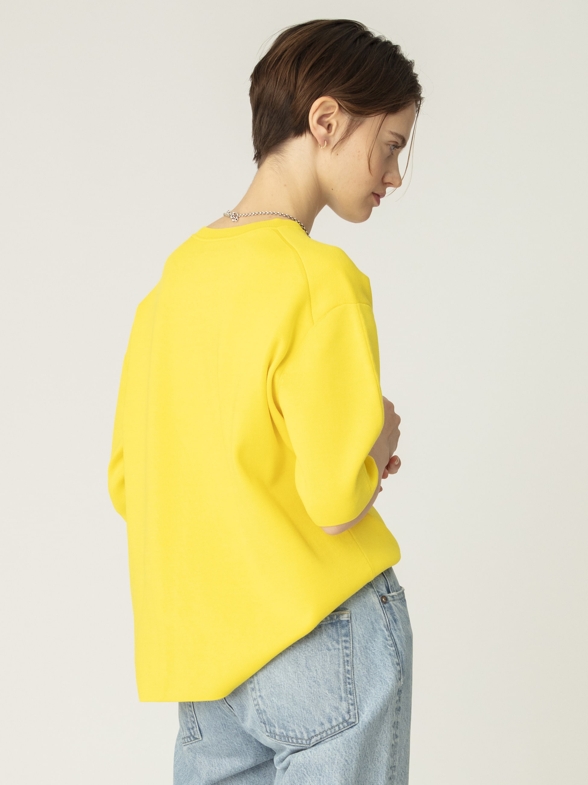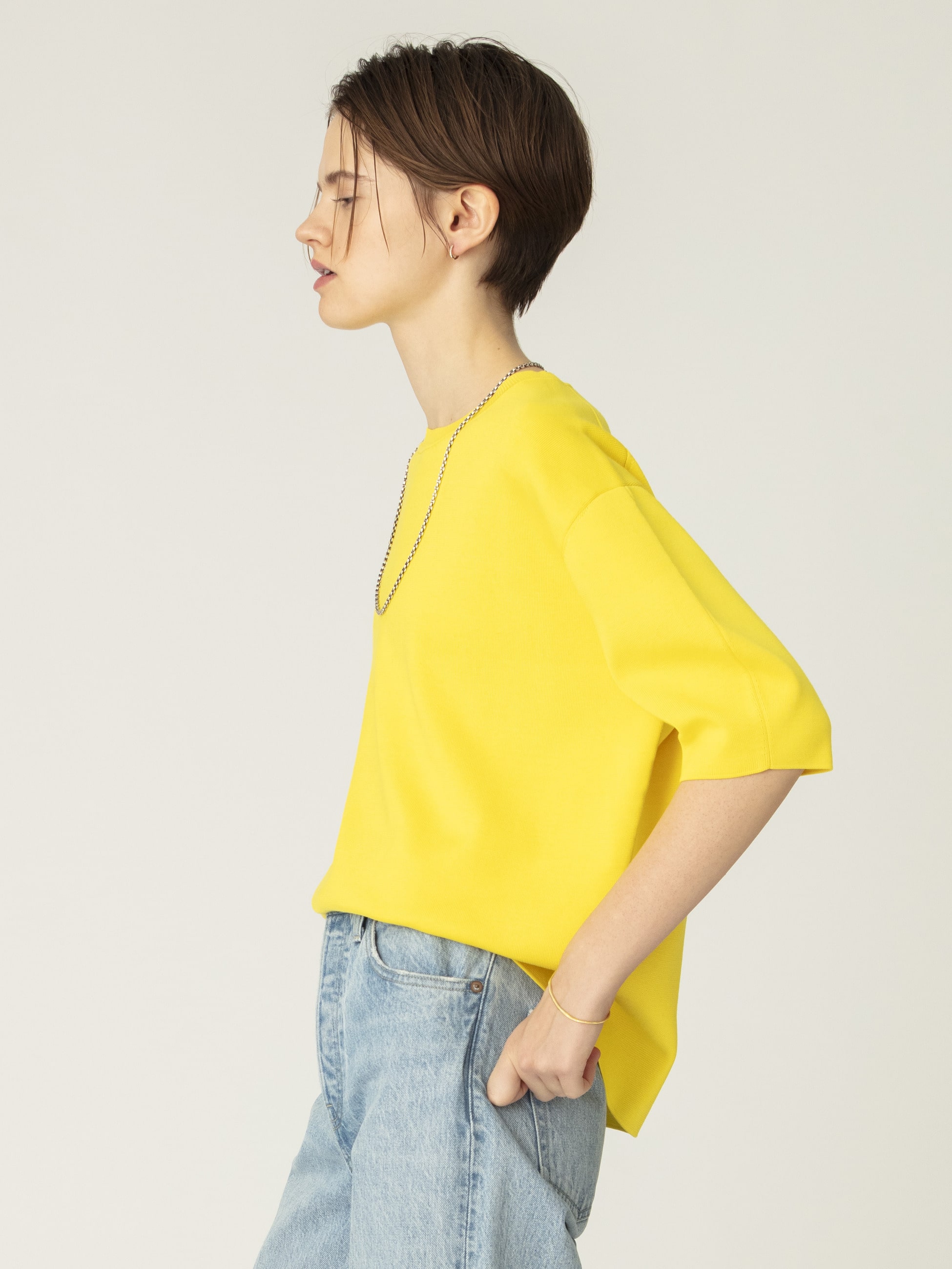 シルクの上品な光沢と柔らかさに、コットンの程よいハリと耐久性を加えた人気のハイゲージニットシリーズから、26SSシーズンは鮮やかなイエローと美しいブルーでカラー別注しました。ハーフスリーブのニットトップは、袖口に細やかな編みテクニックを施し、自然な立体感と美しいバランスを演出しています。爽やかで気分の上がるカラーと上質感のある表情が、シンプルなスタイリングに華を添えます。