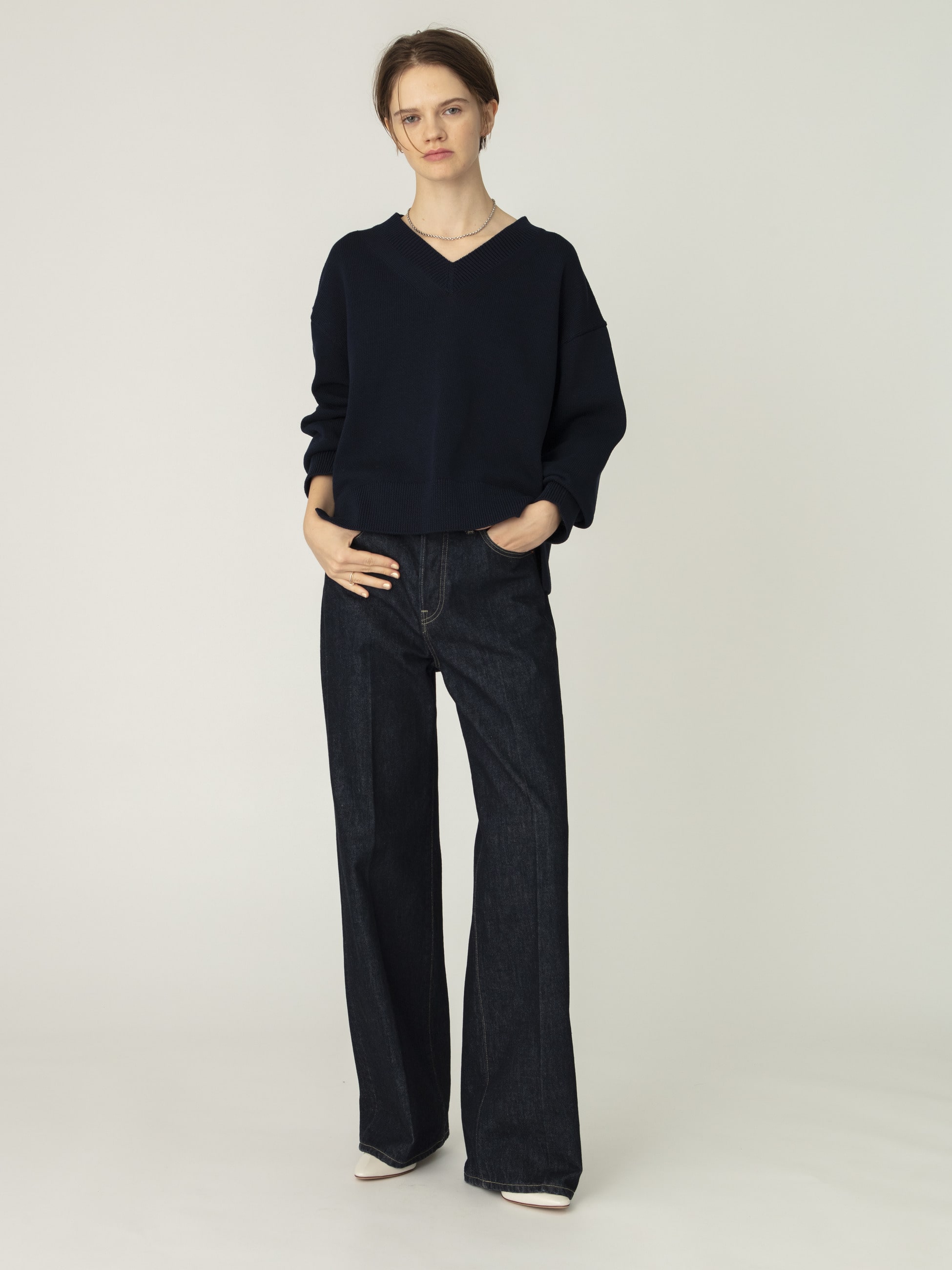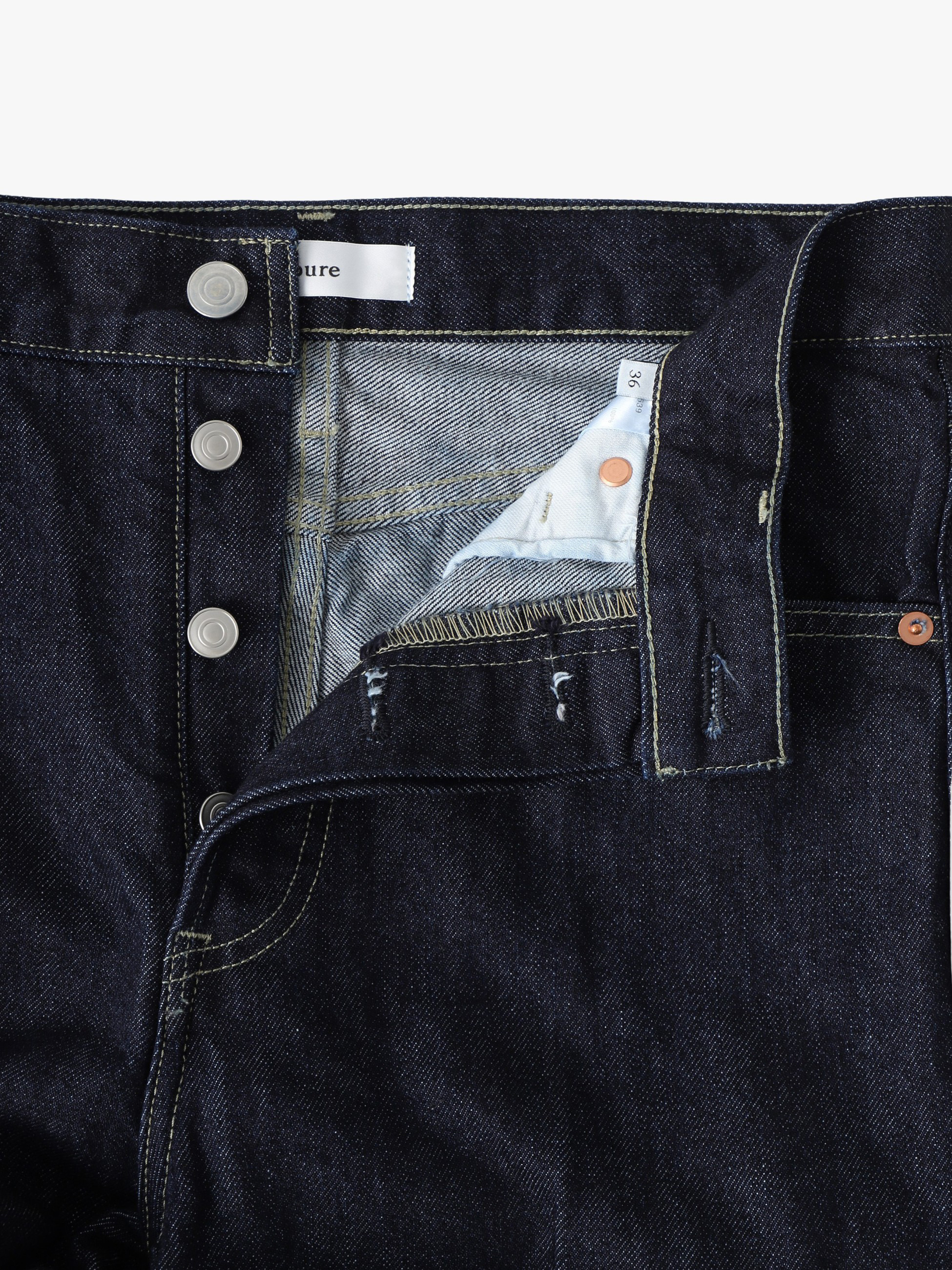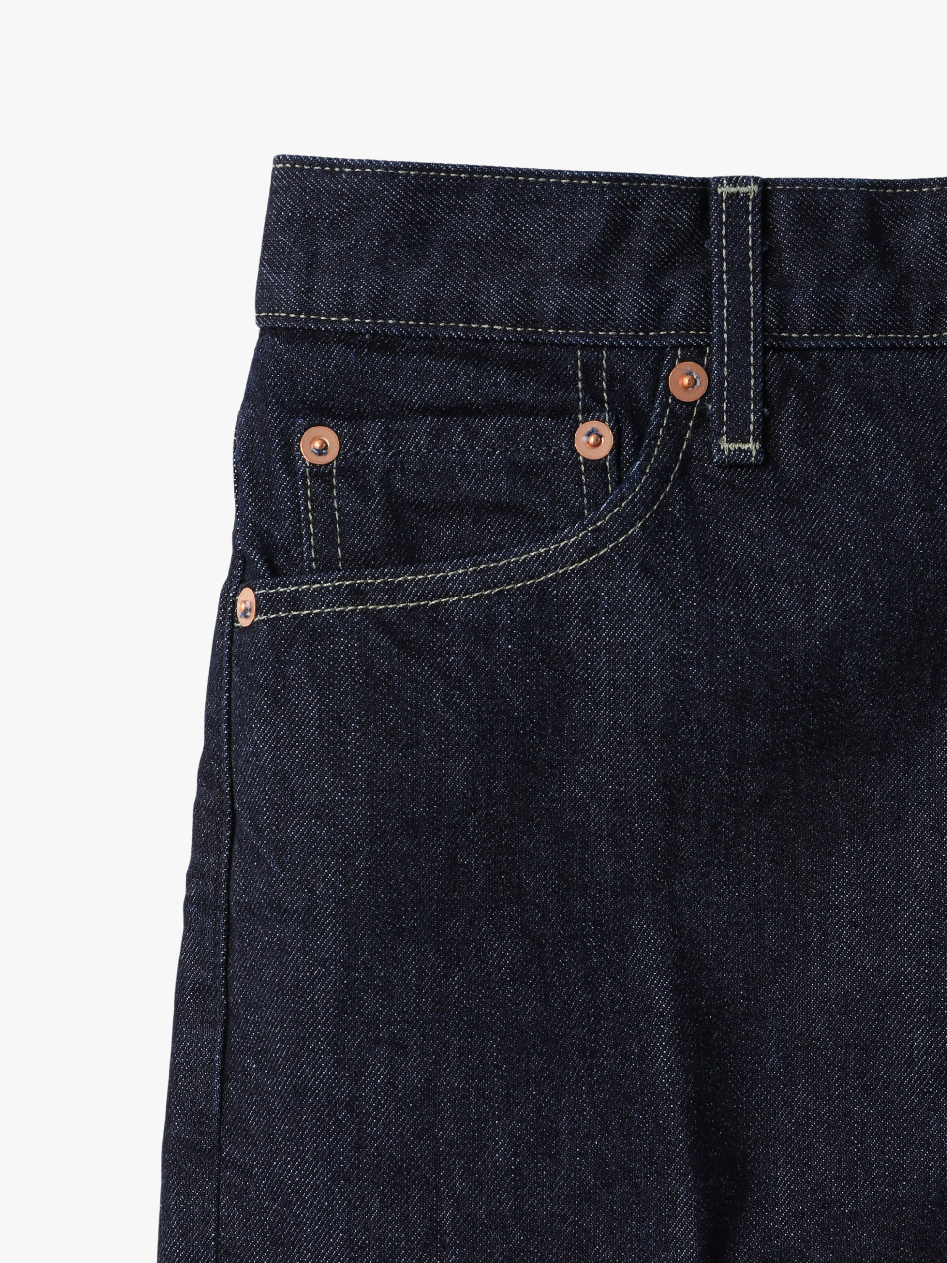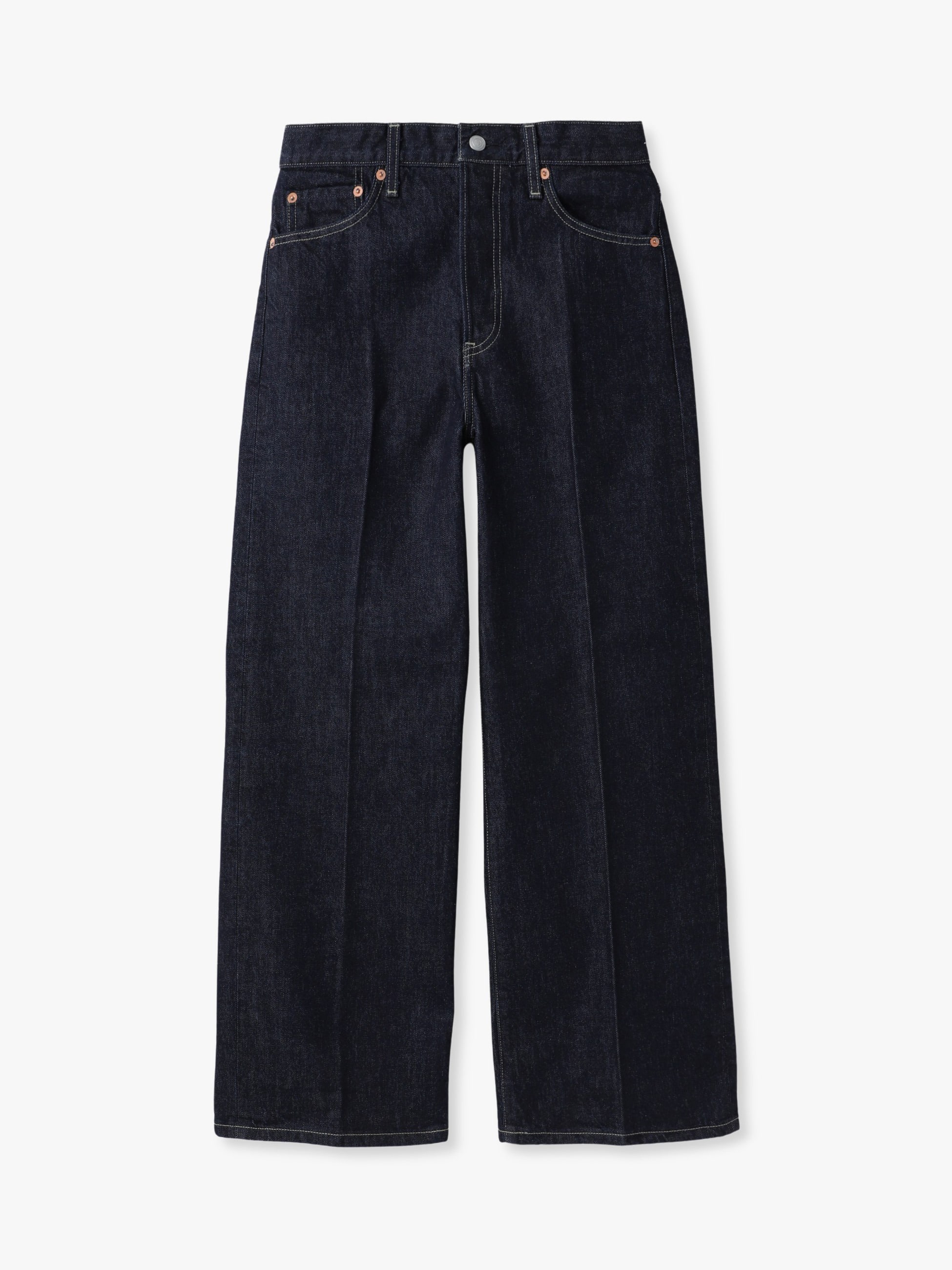 ワイドストレートシルエットのデニムパンツは、やや深めな股上がウエストやミドルヒップ周りをすっきりと見せ、後ろはヒップが高く見えるようなパターンが秀逸な銘品です。センタープレス部分にはさりげなくラインが入っており、洗ったあとも見た目のシャープさをキープ。トップスをウエストインした着こなしもバランス良く様になり、大人の品の良いカジュアルスタイルを演出します。