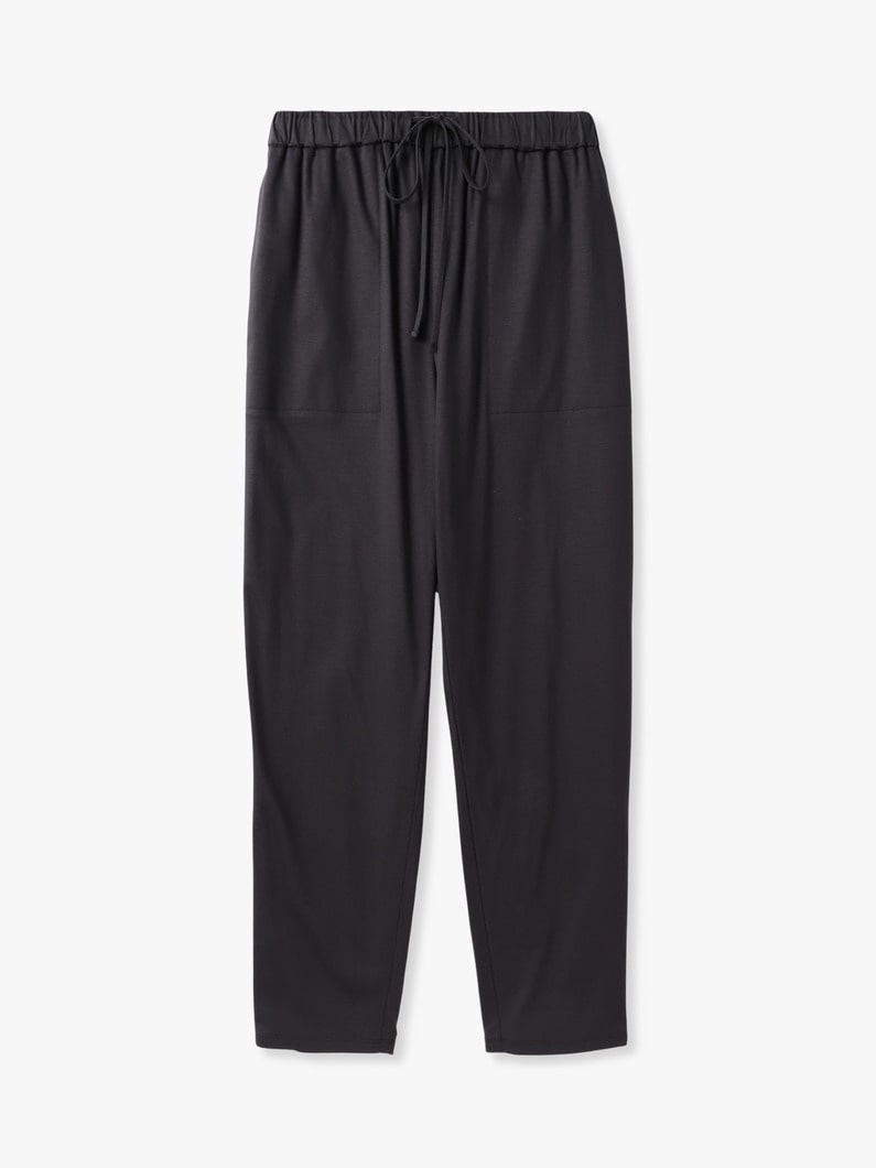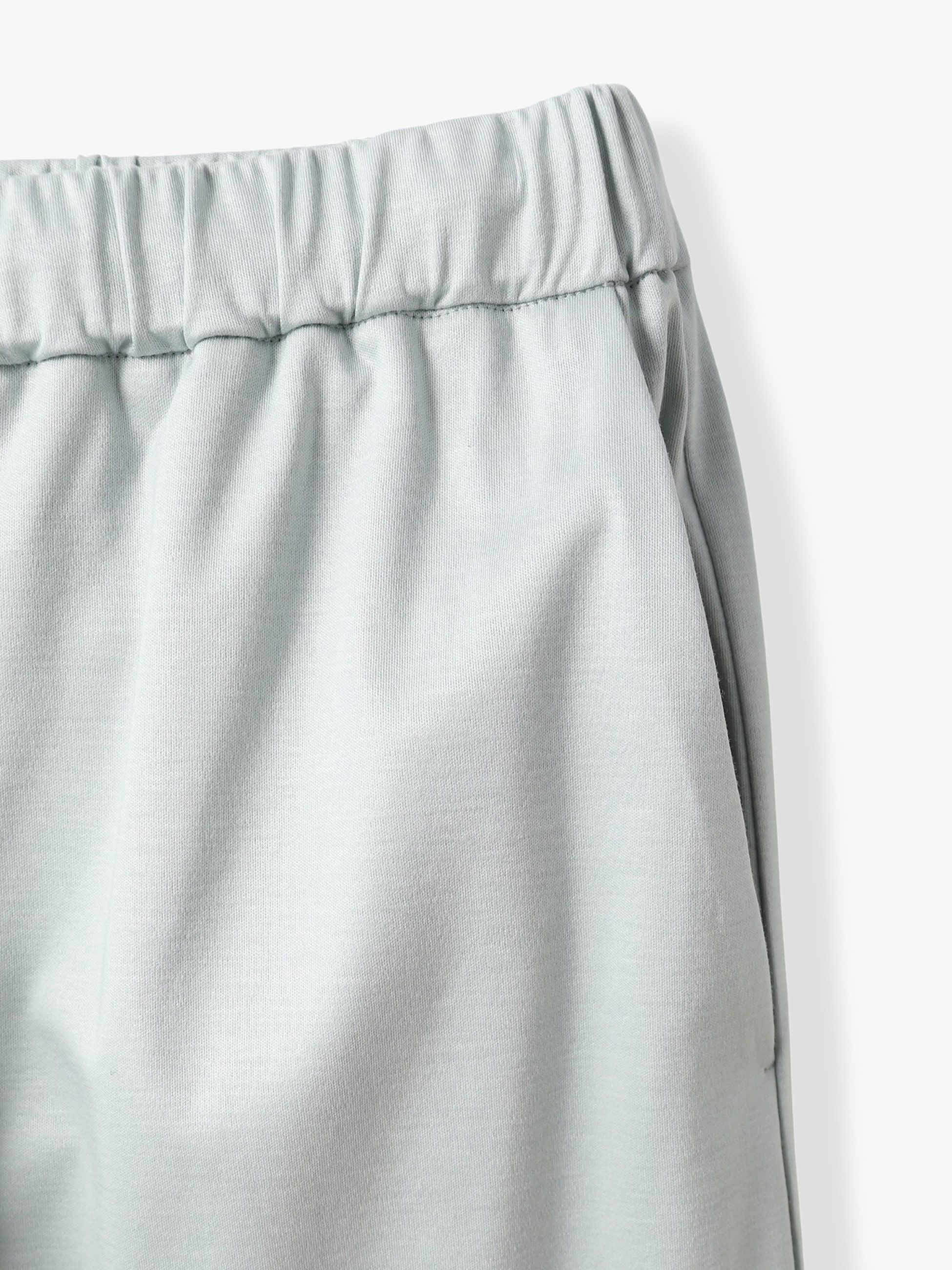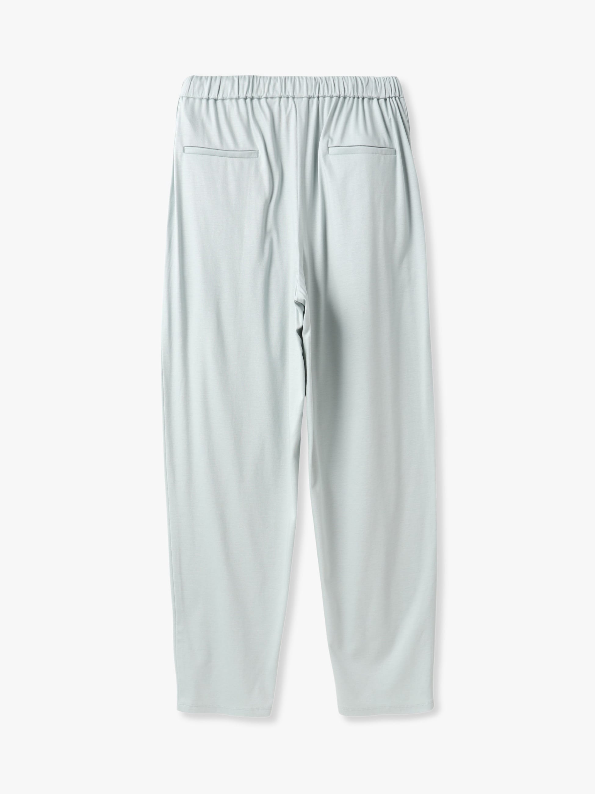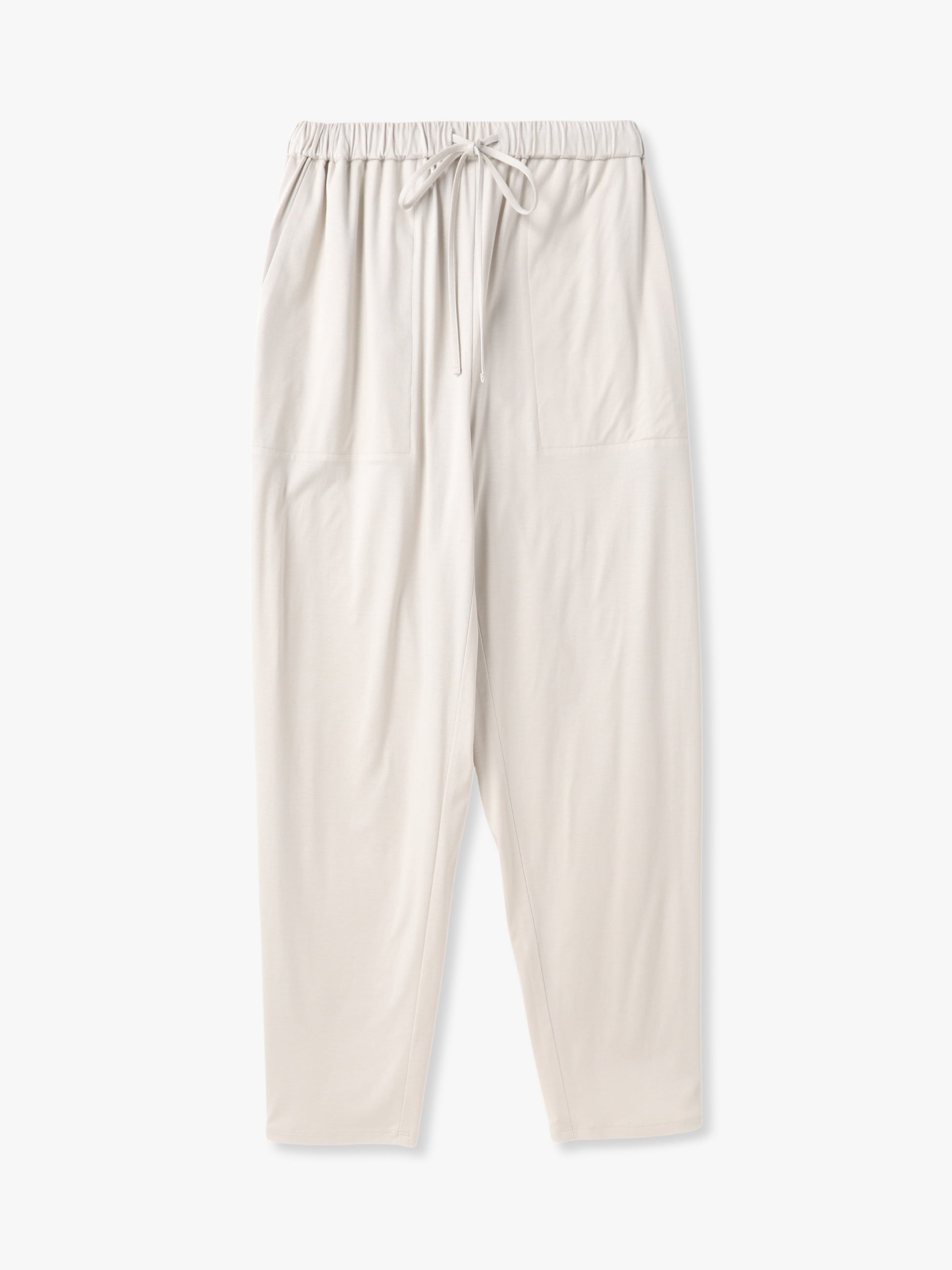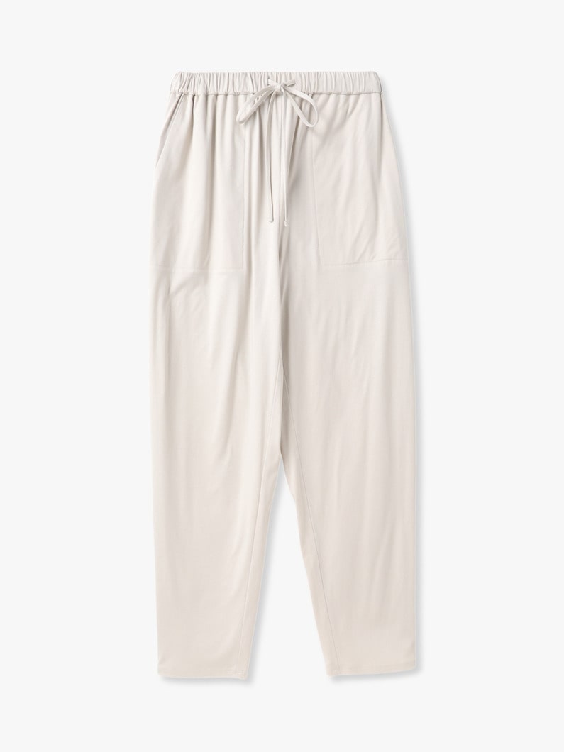 コットンと再生繊維セルロースを使用し、編み立て・最終加工、全てをカットソーの産地和歌山地区で統一して生産されたサスティナブルな素材を採用した、ソフトリヨセルコットンシリーズです。独特のサラッとした落ち感とドレープ性が有り、ナチュラルで上品な光沢感が特徴です。素材の落ち感を活かし、腰回りは大きめなポケットやウエストギャザーでゆとりを持たせ、裾に向かって程よくテーパードをかける事で、足首に少したまりが出て床に着くなどの足元のもたつきなく着用して頂けます。また、後ろのポケットは、カジュアルになりすぎない様、スッキリとしたデザインで、ポケットの袋に片側別布を使用する事で、ダレ感を軽減していることで、クリーンな印象の便利な一着。素材の柔らかさが感じられる、着心地の良いアイテムです。