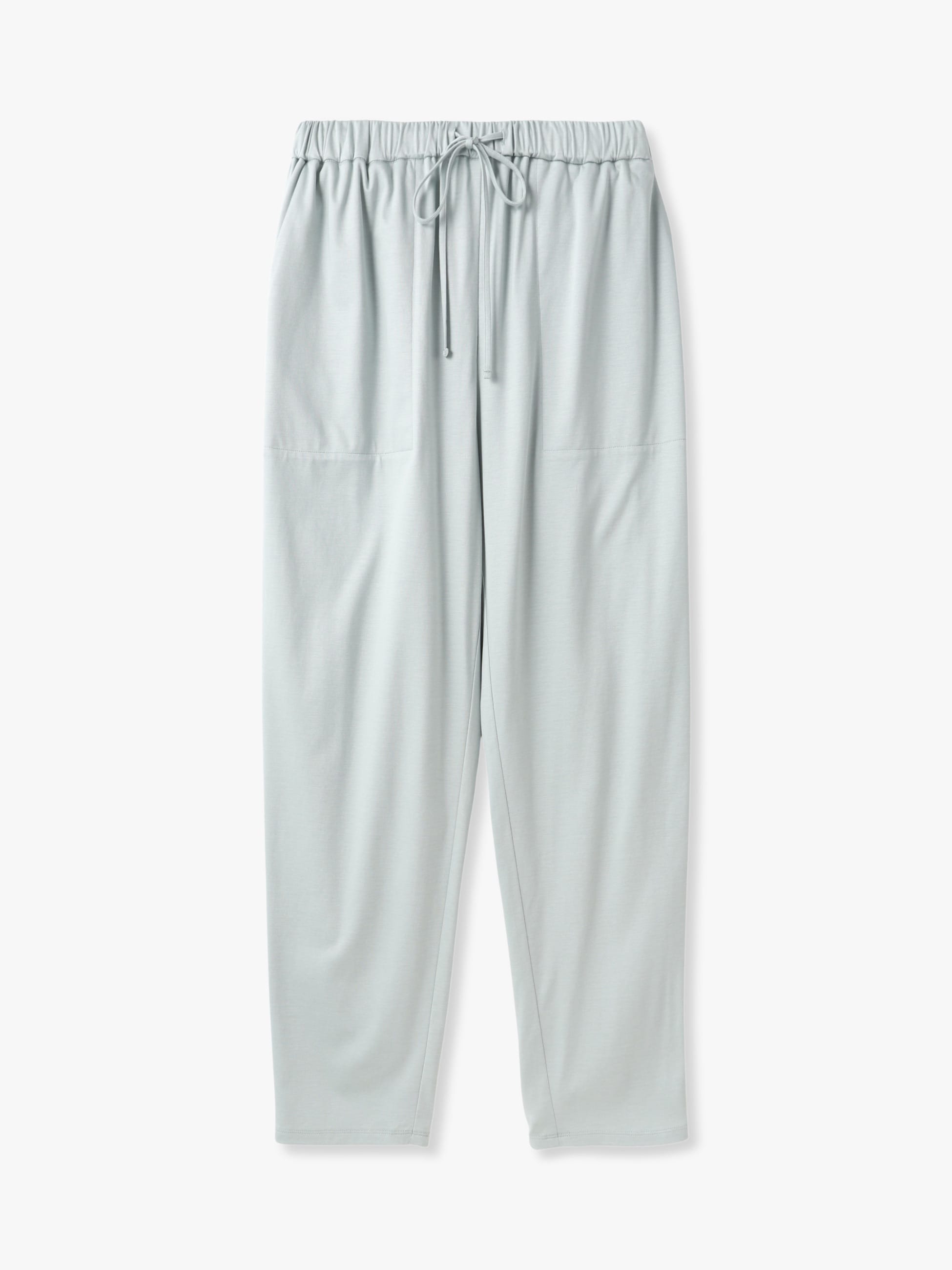 コットンと再生繊維セルロースを使用し、編み立て・最終加工、全てをカットソーの産地和歌山地区で統一して生産されたサスティナブルな素材を採用した、ソフトリヨセルコットンシリーズです。独特のサラッとした落ち感とドレープ性が有り、ナチュラルで上品な光沢感が特徴です。素材の落ち感を活かし、腰回りは大きめなポケットやウエストギャザーでゆとりを持たせ、裾に向かって程よくテーパードをかける事で、足首に少したまりが出て床に着くなどの足元のもたつきなく着用して頂けます。また、後ろのポケットは、カジュアルになりすぎない様、スッキリとしたデザインで、ポケットの袋に片側別布を使用する事で、ダレ感を軽減していることで、クリーンな印象の便利な一着。素材の柔らかさが感じられる、着心地の良いアイテムです。