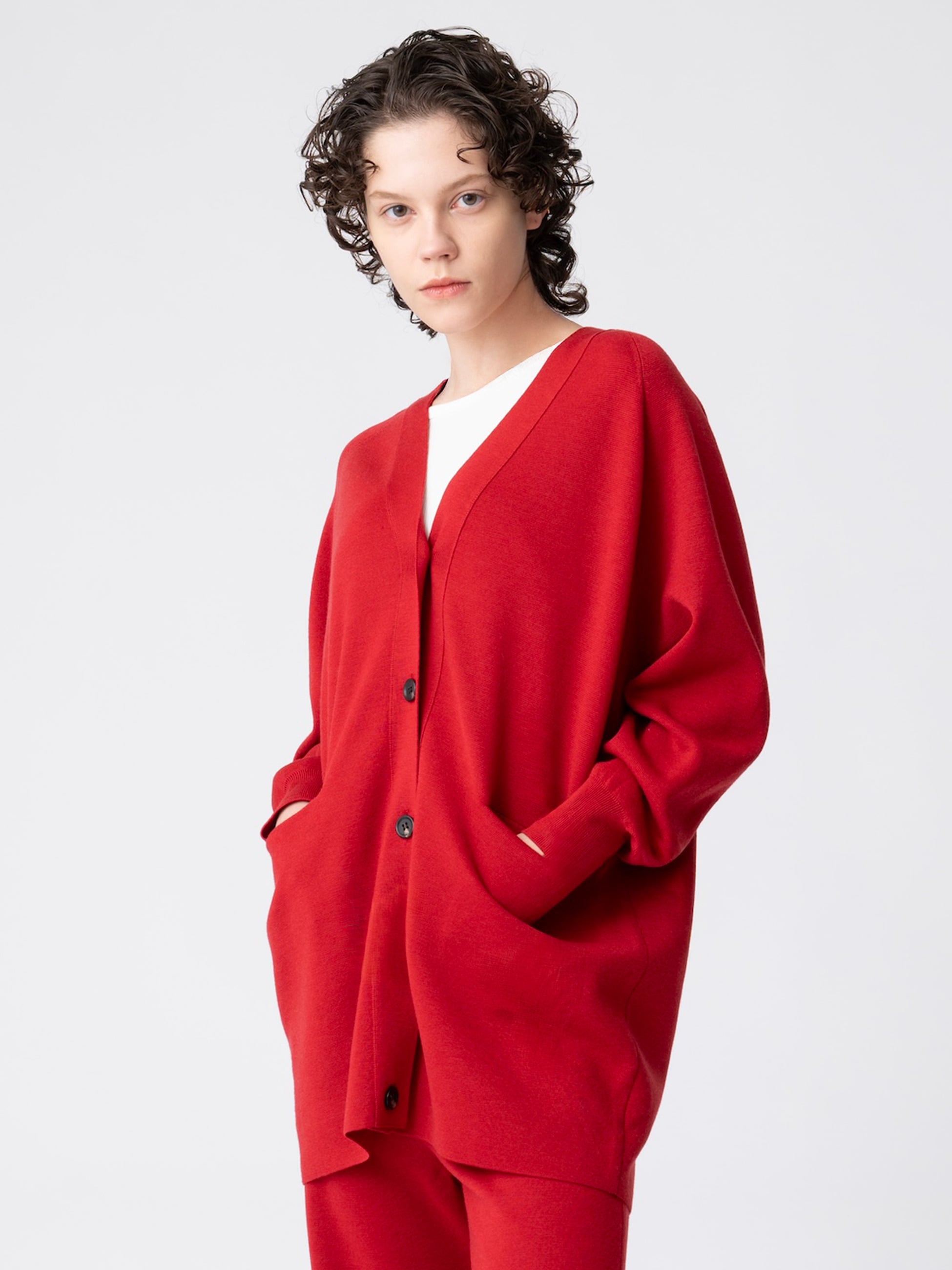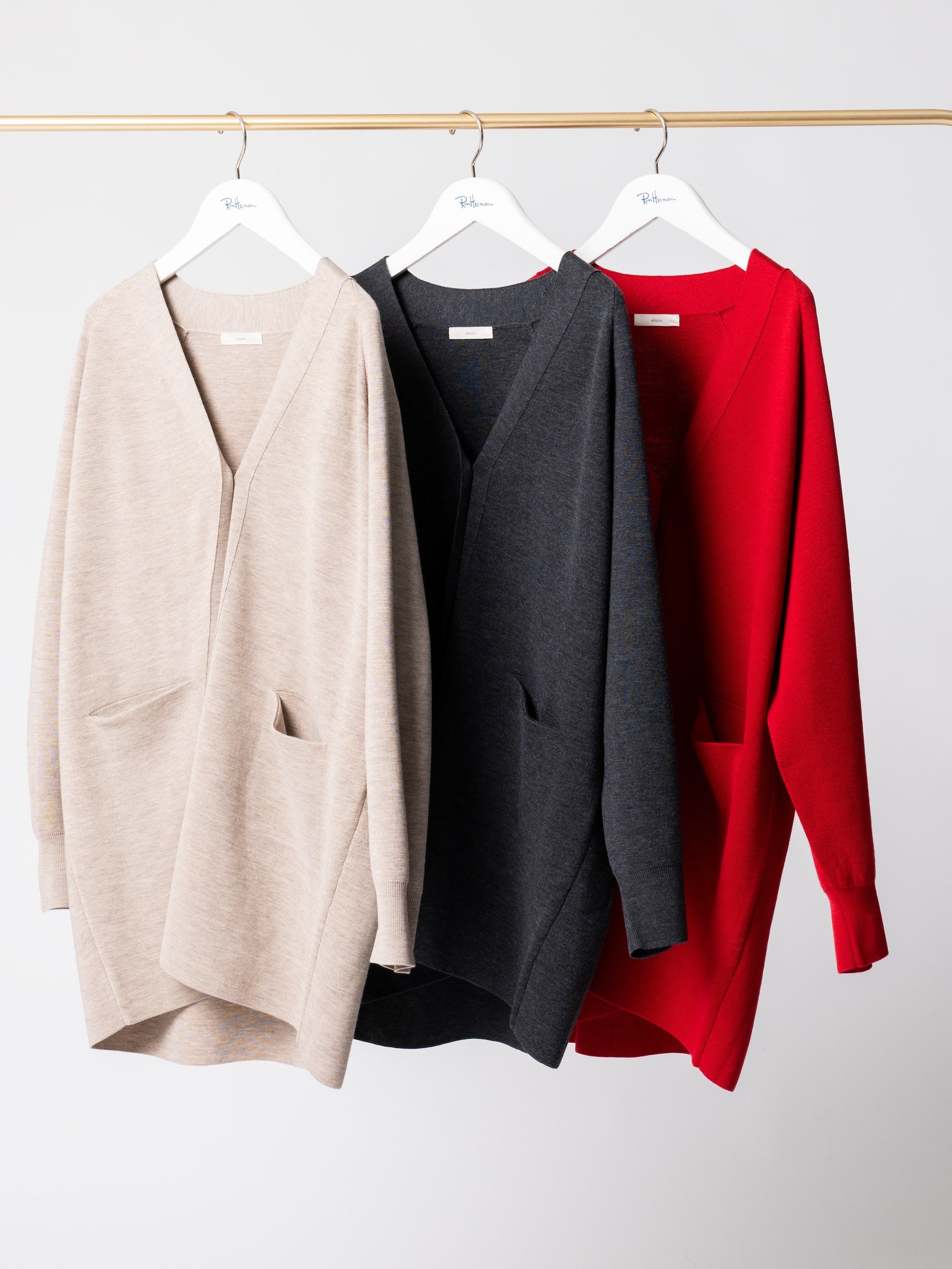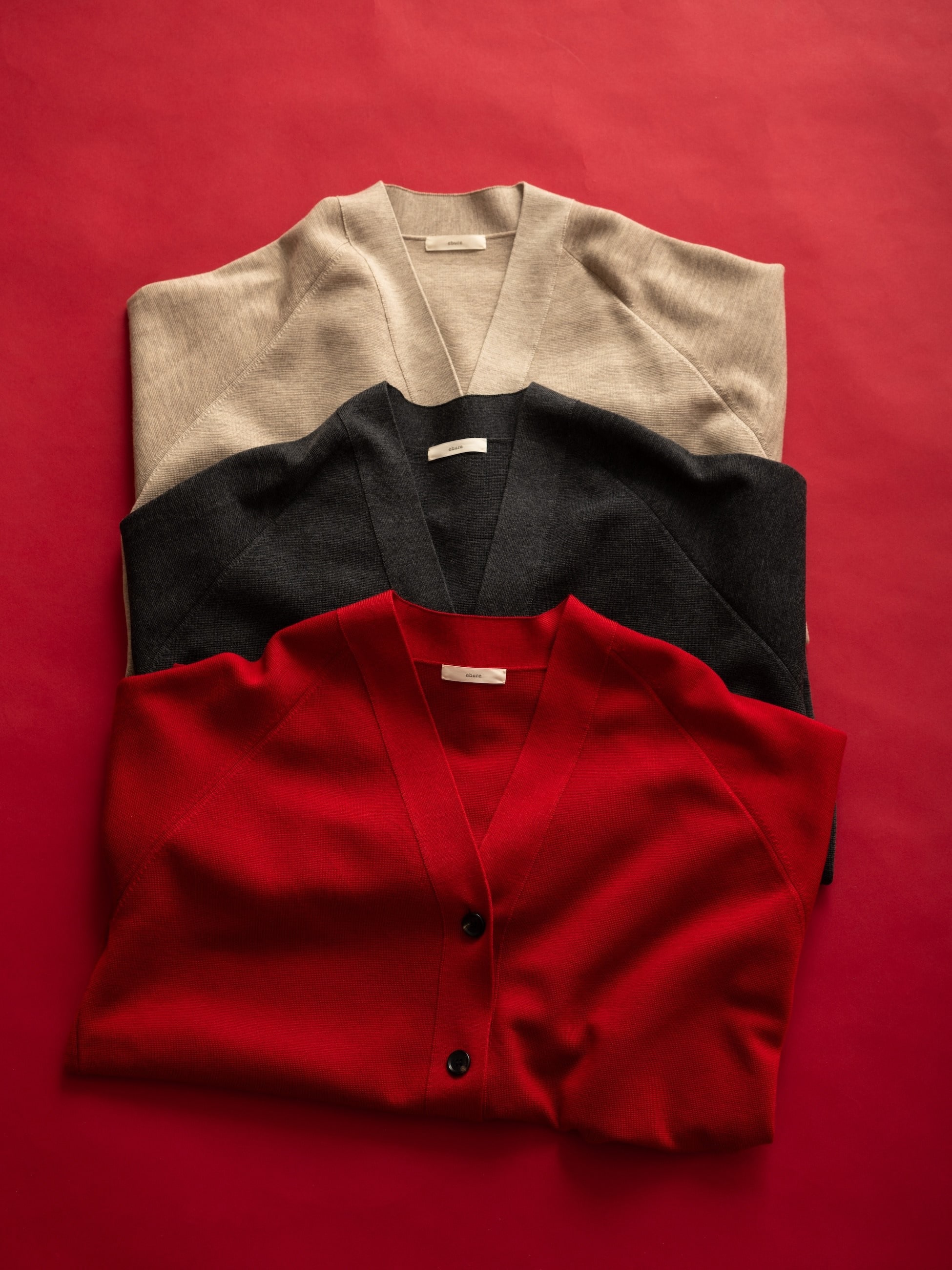 ebure × Ron Herman別注が、Living lineとして登場。裾の広がりをおさえたすっきりシルエットのミドルロングカーディガン。開きのあるポケット口がさりげないアクセントになり、羽織るだけでこなれた印象に。オーストラリア産ウールを使用し、柔らかな風合いと自然な光沢が魅力です。同シリーズのパンツと合わせたセットアップスタイルもおすすめです。