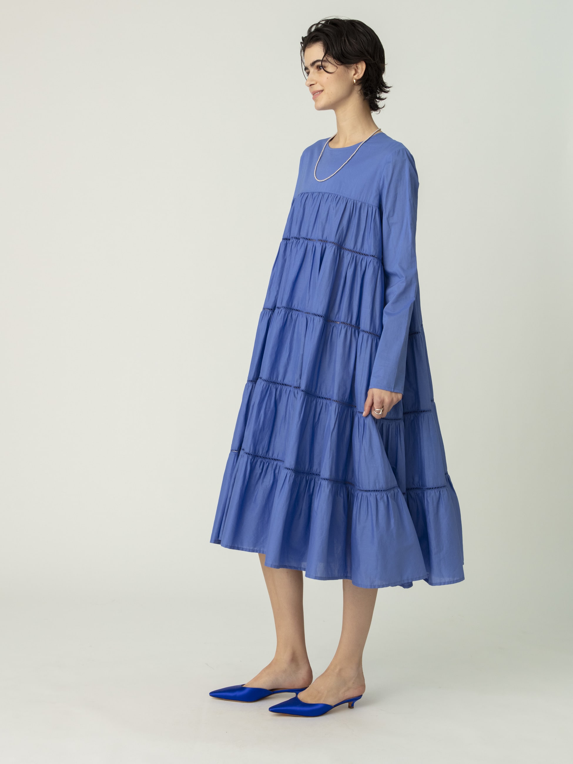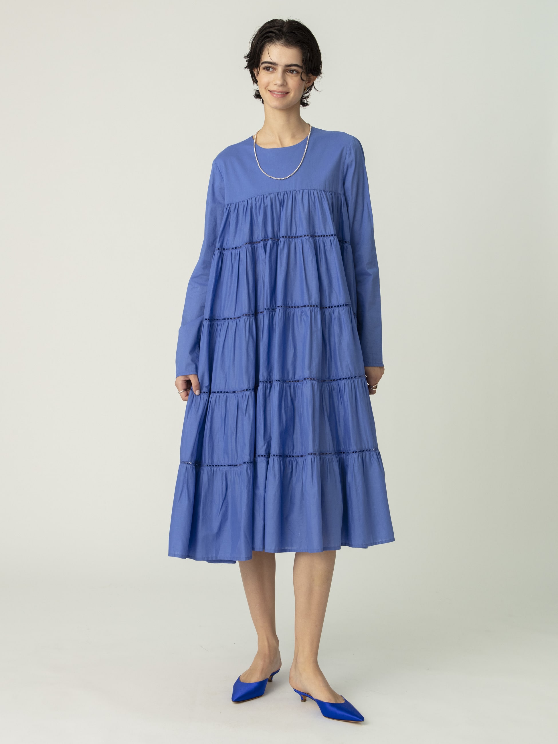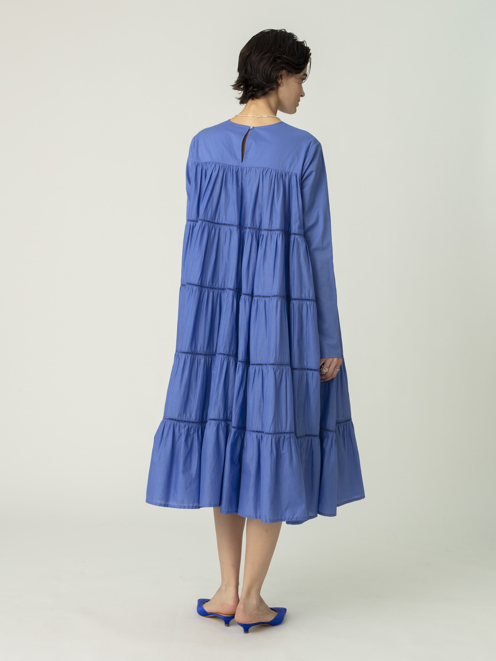 エレガントで着丈の長いモデル「MAIDA(マイダ)」をミディ丈にアレンジした「MAIDA MIDI(マイダ ミディ)」を、ベーシックなブラックと鮮やかなブルーでカラー別注した、ロンハーマン・RHC ロンハーマンだけの特別なドレスが登場です。エアリーな質感のピマコットンローンを100%使用し、1枚でドラマティックな印象を演出します。女性らしいデザインのシューズや、スポーティーなスニーカーで外したスタイリングとも好相性で、抜け感のあるバランスをお楽しみいただけます。