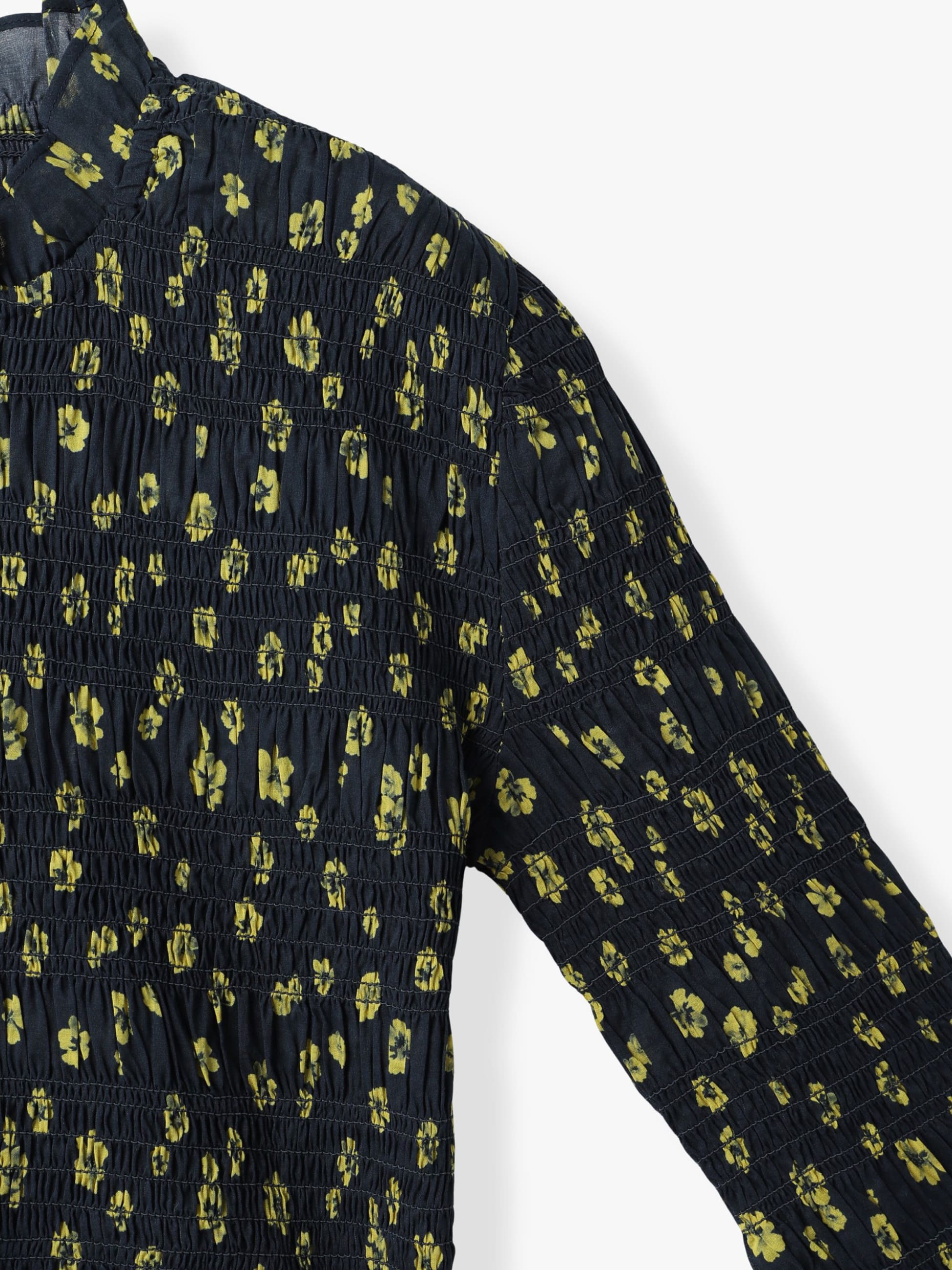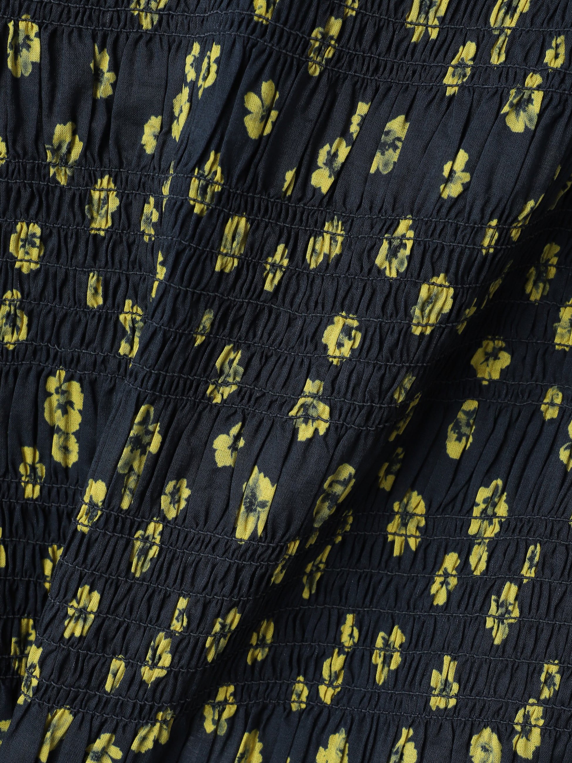 - 軽やかなコットンボイル素材にレモン色の花柄をあしらった爽やかなギャザートップスは、ハイネックと伸縮性のあるスモッキングが美しいシルエットを描き、長めのフリルスリーブが繊細な質感をプラスします。重ね着にも単品でも映える万能なデザインで、ボトムスを選ばず、スタイリングが決まります。