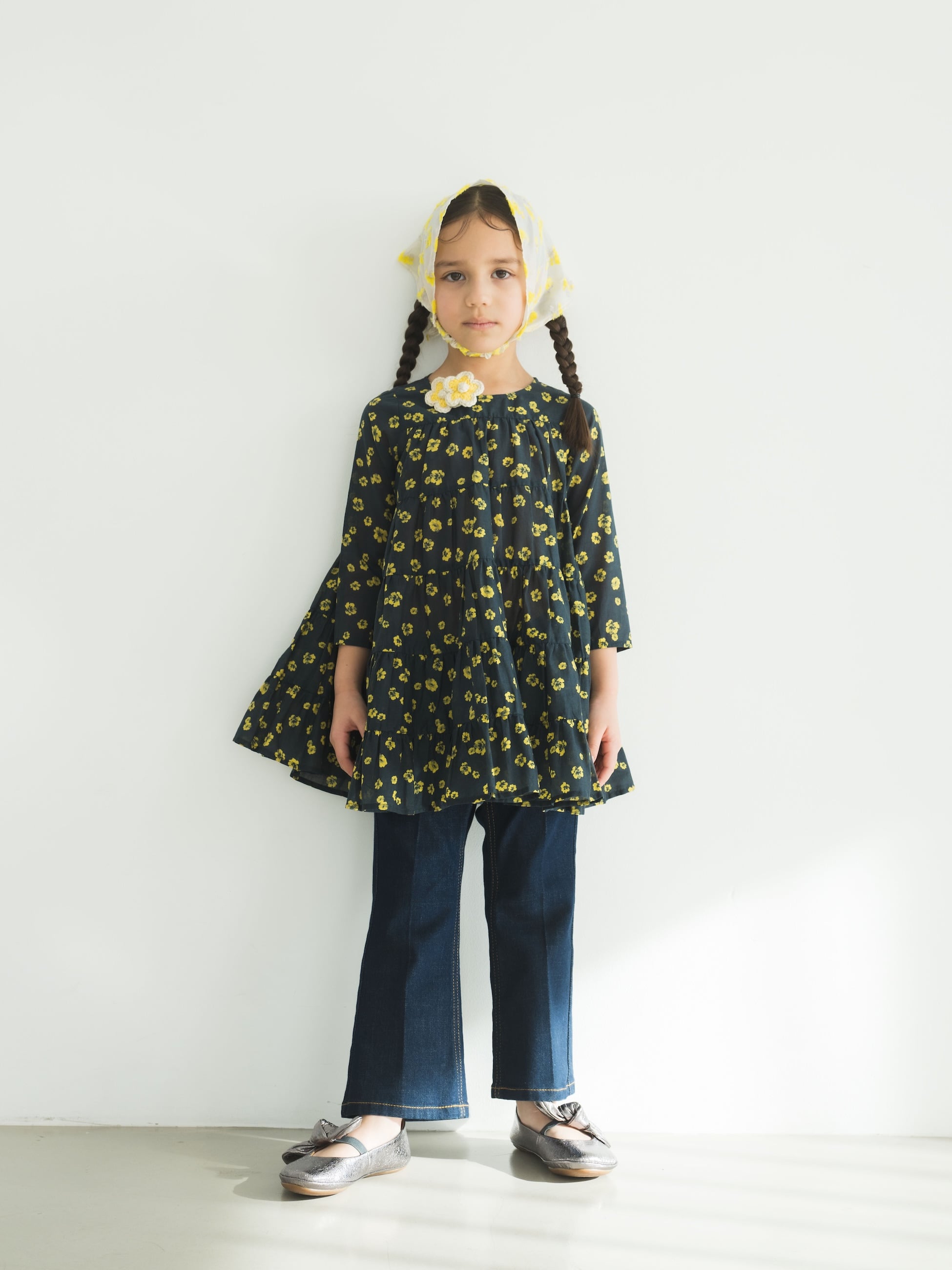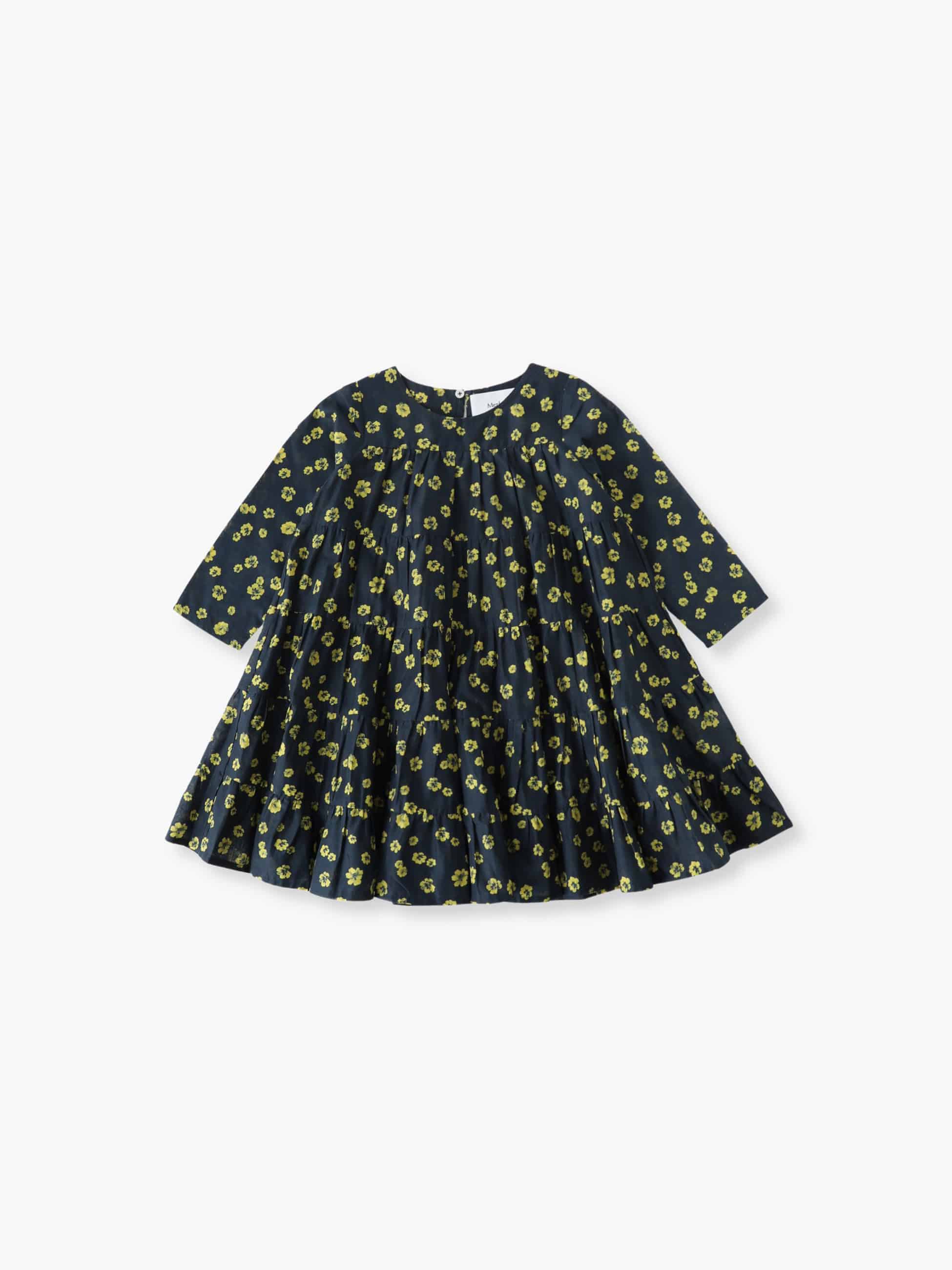 Merletteの定番ドレスSOLIMAN(ソリマン)のキッズサイズに、レモン色の花柄をあしらったデザインが登場です。一枚でドレスとして、成長に合わせてチュニックとしてご着用いただけます。ふわっと広がるプリンセスのようなティアードシルエットのため、窮屈感なく快適な着心地です