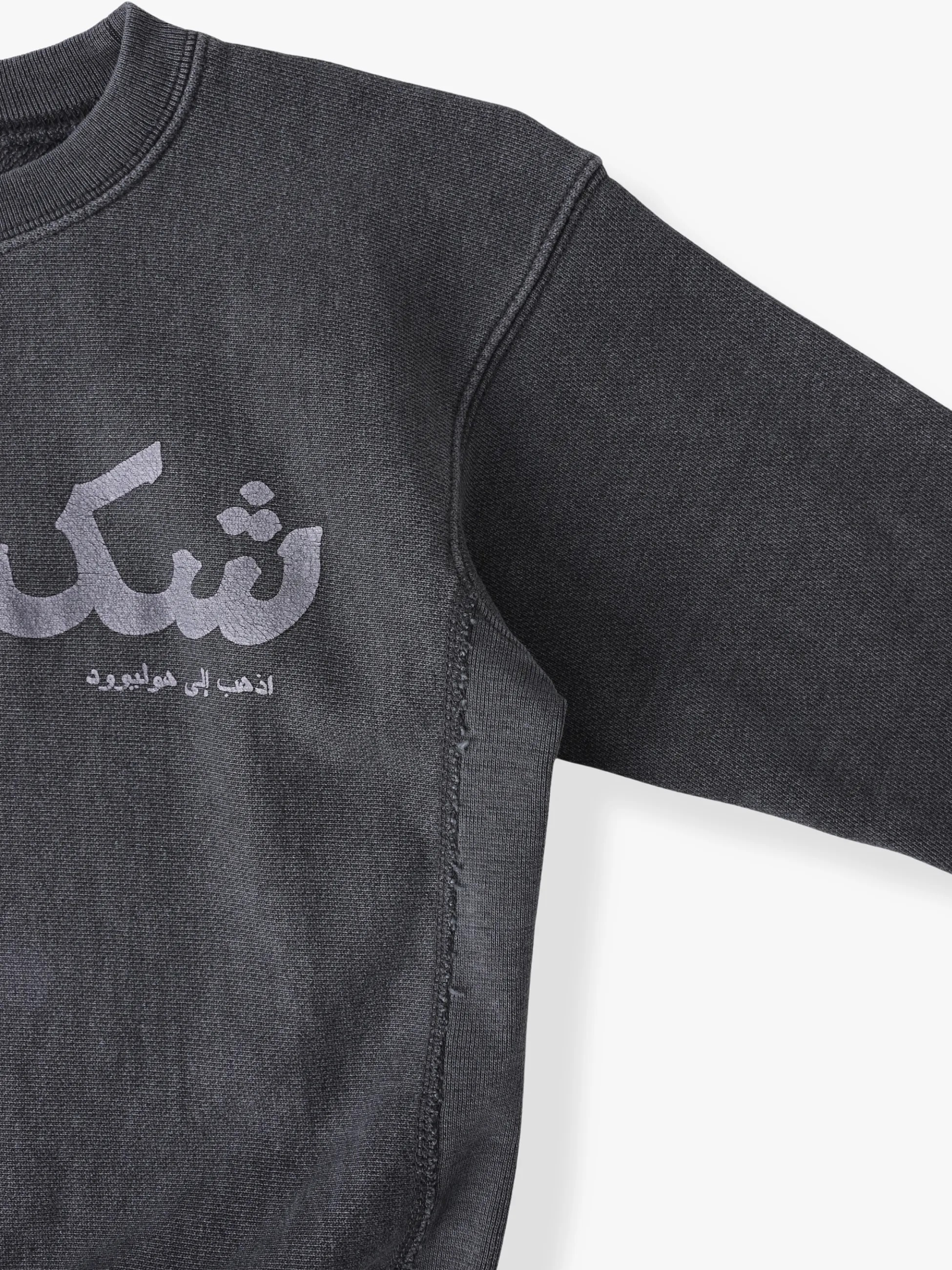 アラビア語がプリントされたスウェットシャツは、“シュクラン ジャジーラン(ありがとう)”という言葉があしらわれています。杢グレーの生地にブラックの染色を施しており、柔らかく優しい雰囲気が魅力です。着るほどに風合いが増し、経年変化をお楽しみいただけます。サイズ違いはこちら -