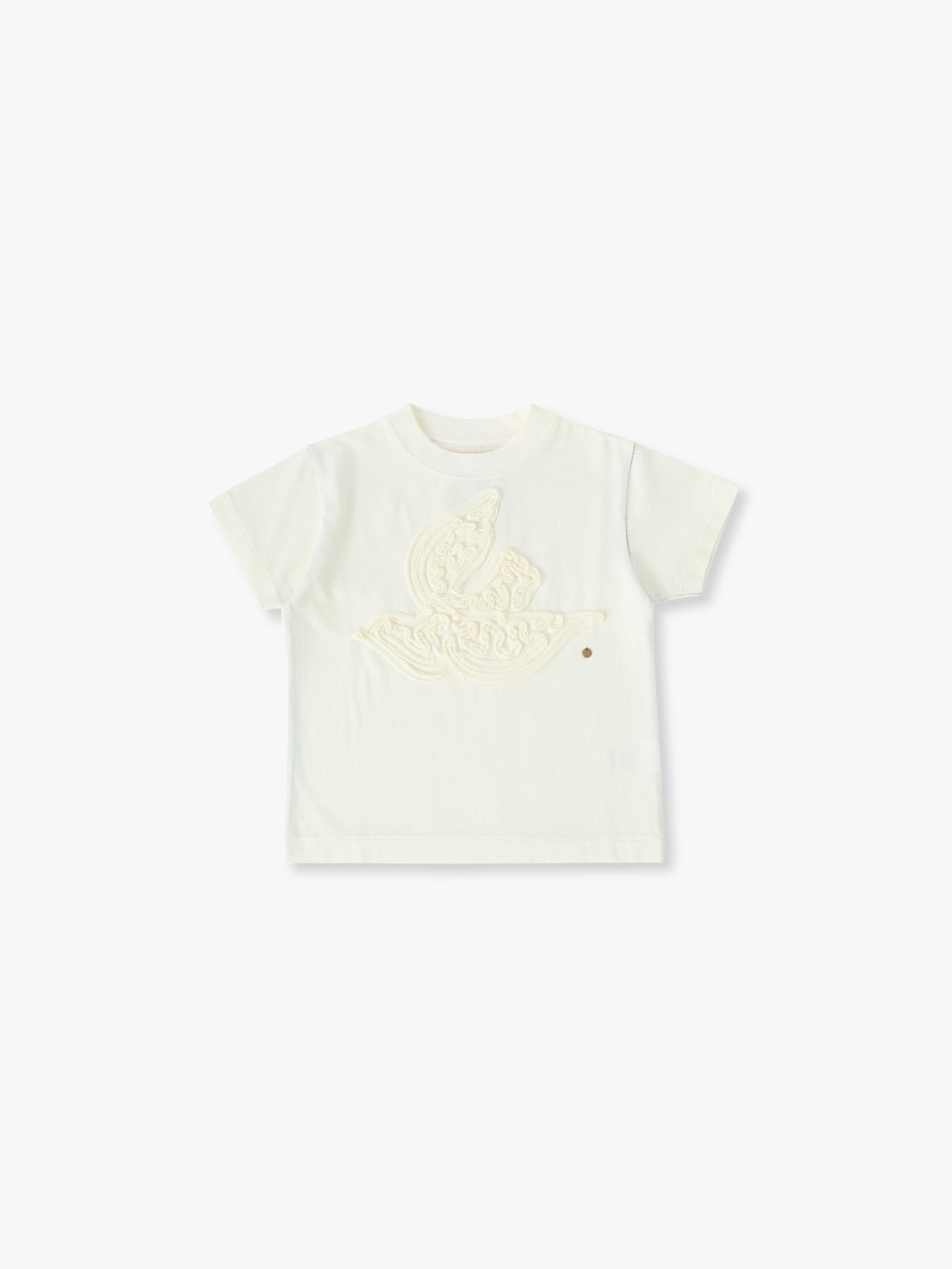 フロントにテープ刺繍の鳥のモチーフが施されたTシャツは、コーディネートに遊び心をプラスする一枚です。コットン100%の天竺生地を採用し、通気性がよく快適な着心地です。