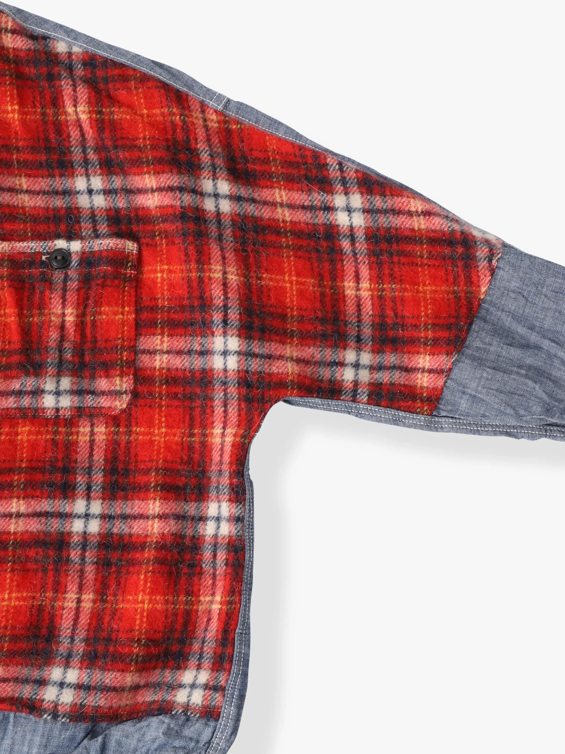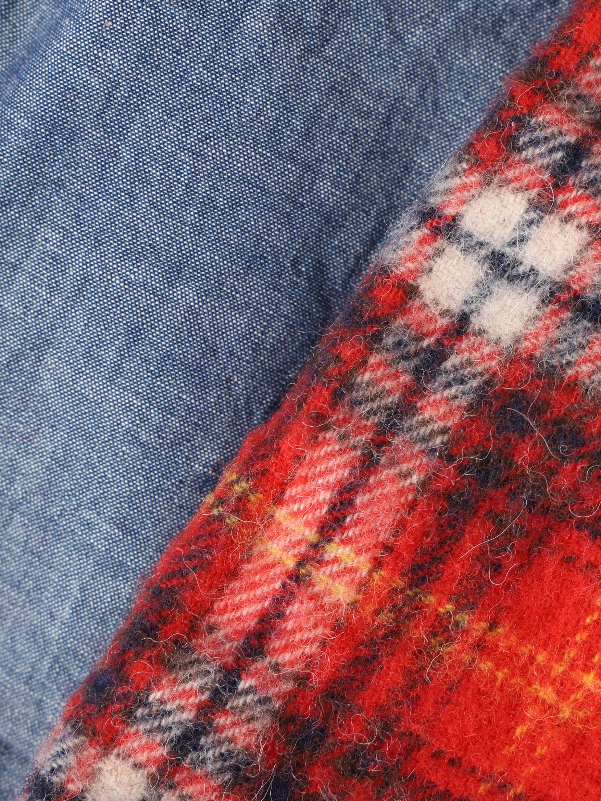 異素材の組み合わせが目を引く、DENIM DUNGAREEらしい遊び心あふれるリメイクシャツは一枚でコーディネートの主役になります。全体は独特のシャリ感を持つダンガリー生地、フロントは起毛感のあるチェックの生地を使用しており、前後で印象が変わるユニークなデザインです。DENIM DUNGAREEのその他のラインナップはこちら。
