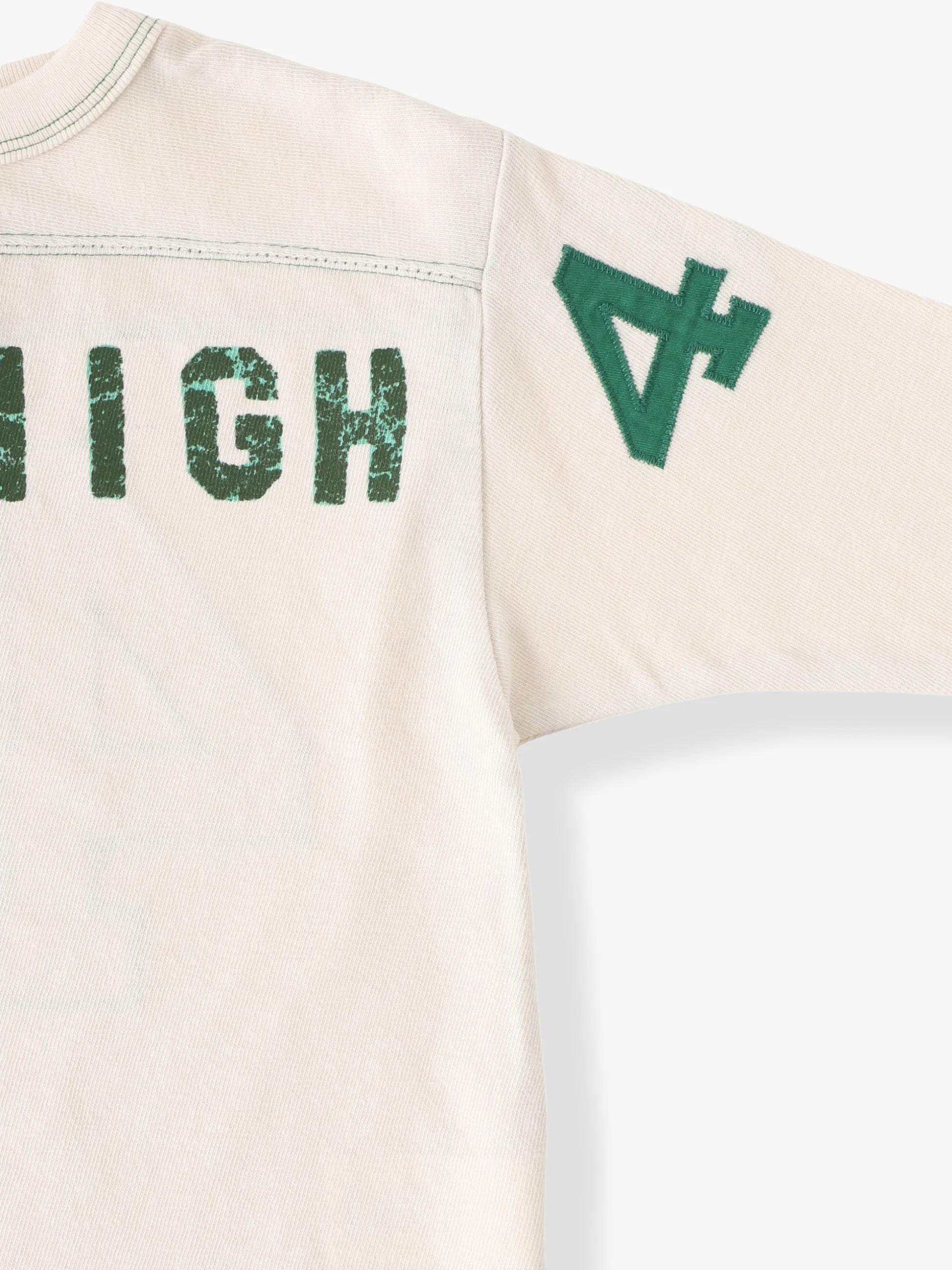 スポーティーなロングスリーブTシャツは、フロントに“RISE HIGH”のロゴ、スリーブにナンバリング、バックには大きく“45”のプリントが施されており、一枚で存在感のあるスタイリングを楽しめます。柔らかなコットン素材を使用しているため、快適な着心地です。