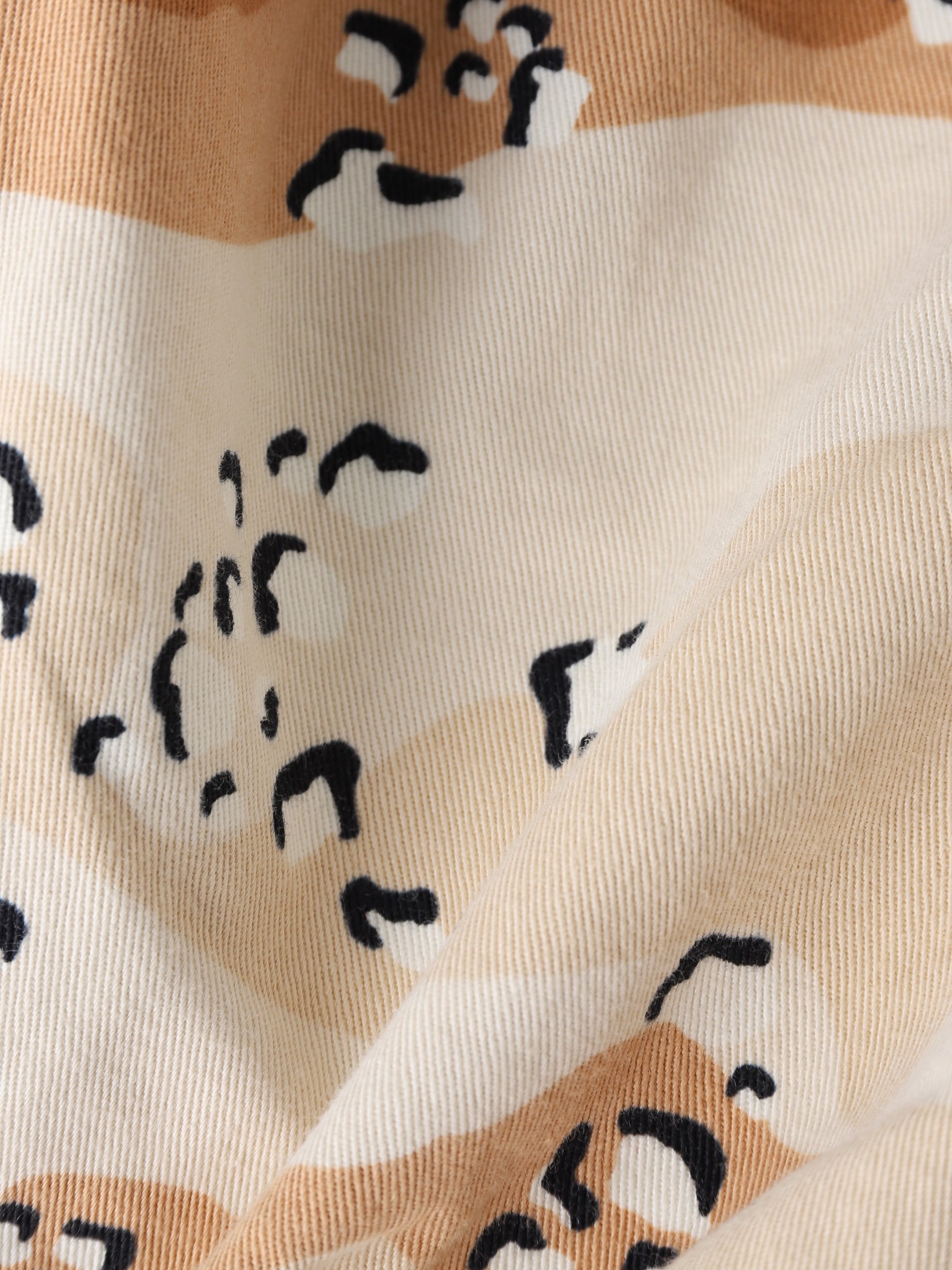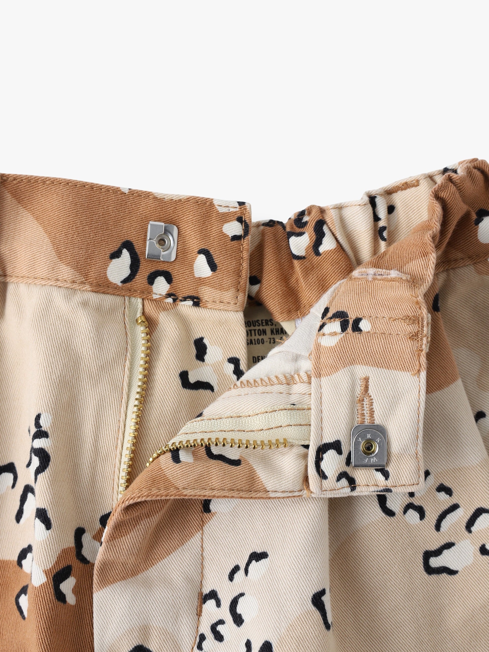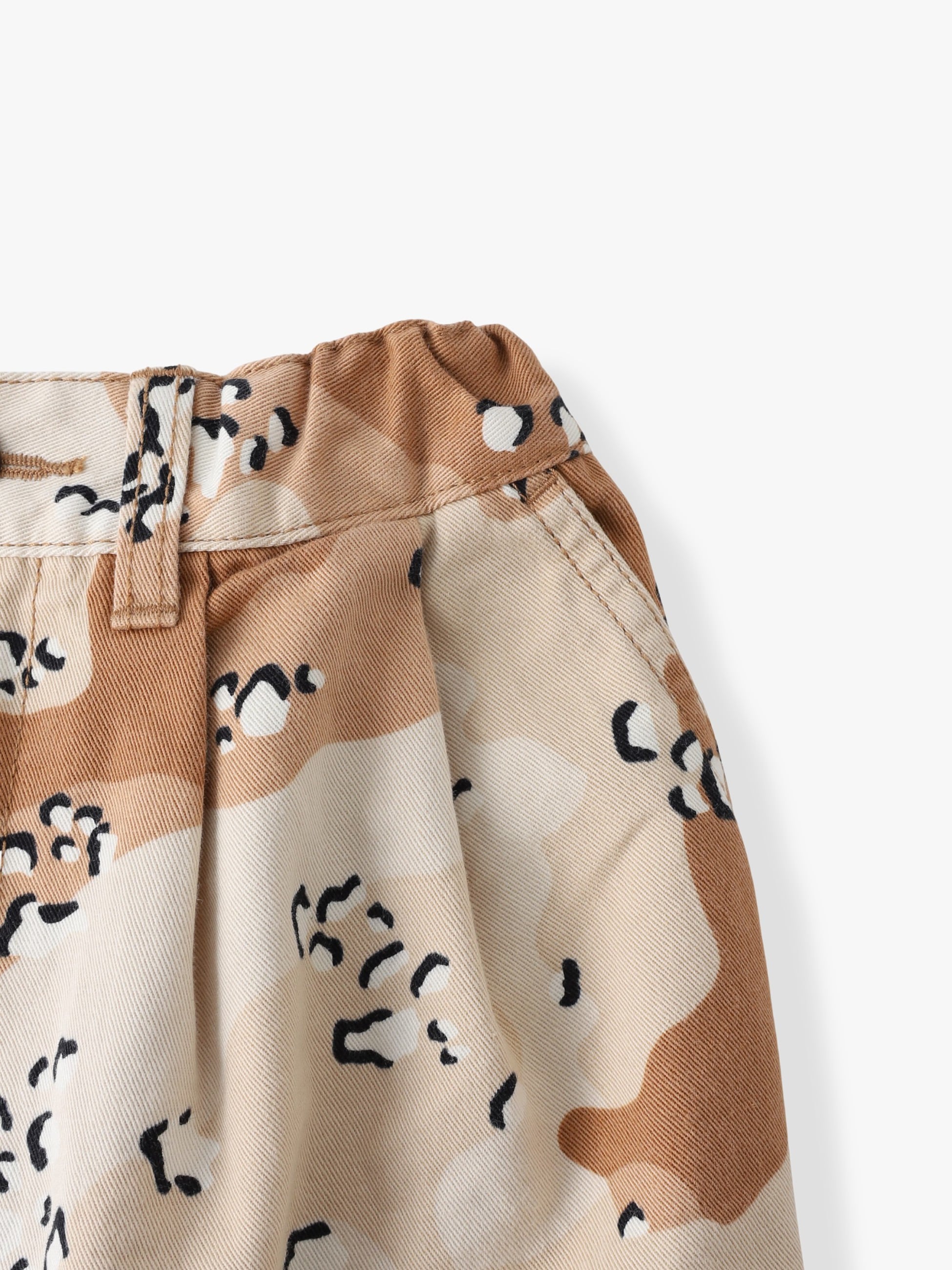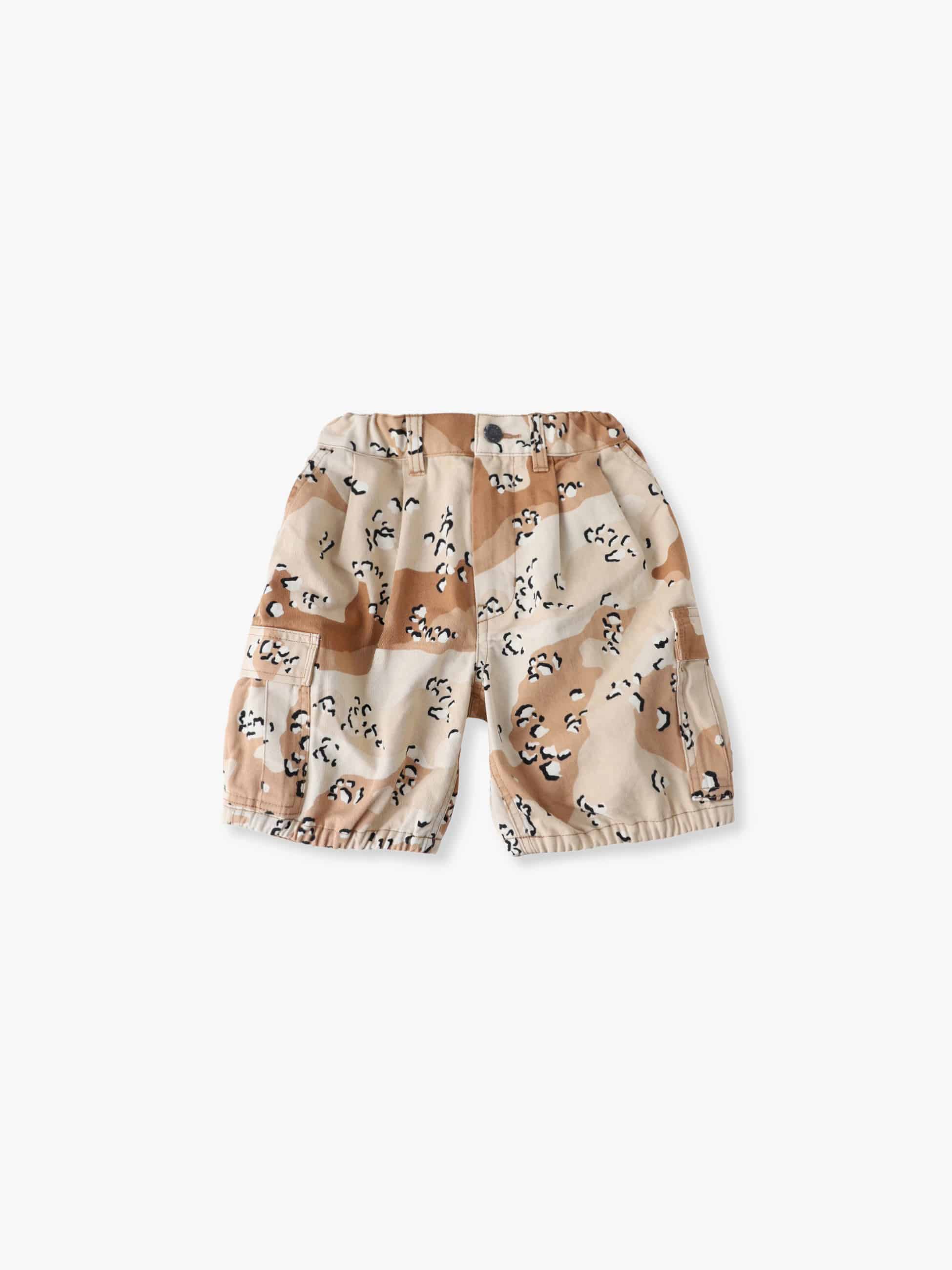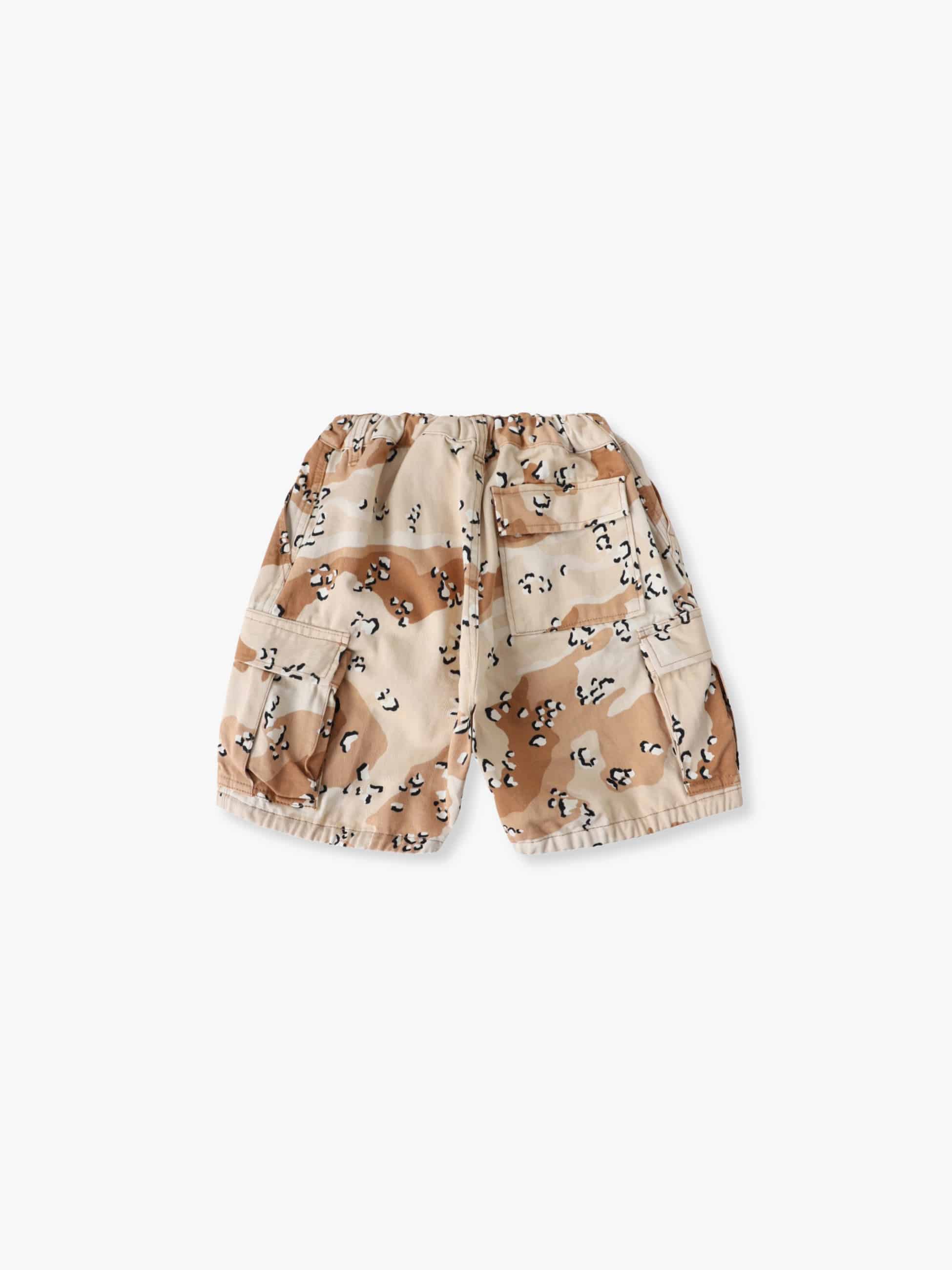 チョコチップカモ柄が目を惹くショーツです。裾にゴムを入れることで、やわらかなシルエットになるのが特徴的です。膝下の丈感のため、丸みを活かしながらも落ち着いた雰囲気が生まれ、スタイリングに取り入れやすい一枚です。
