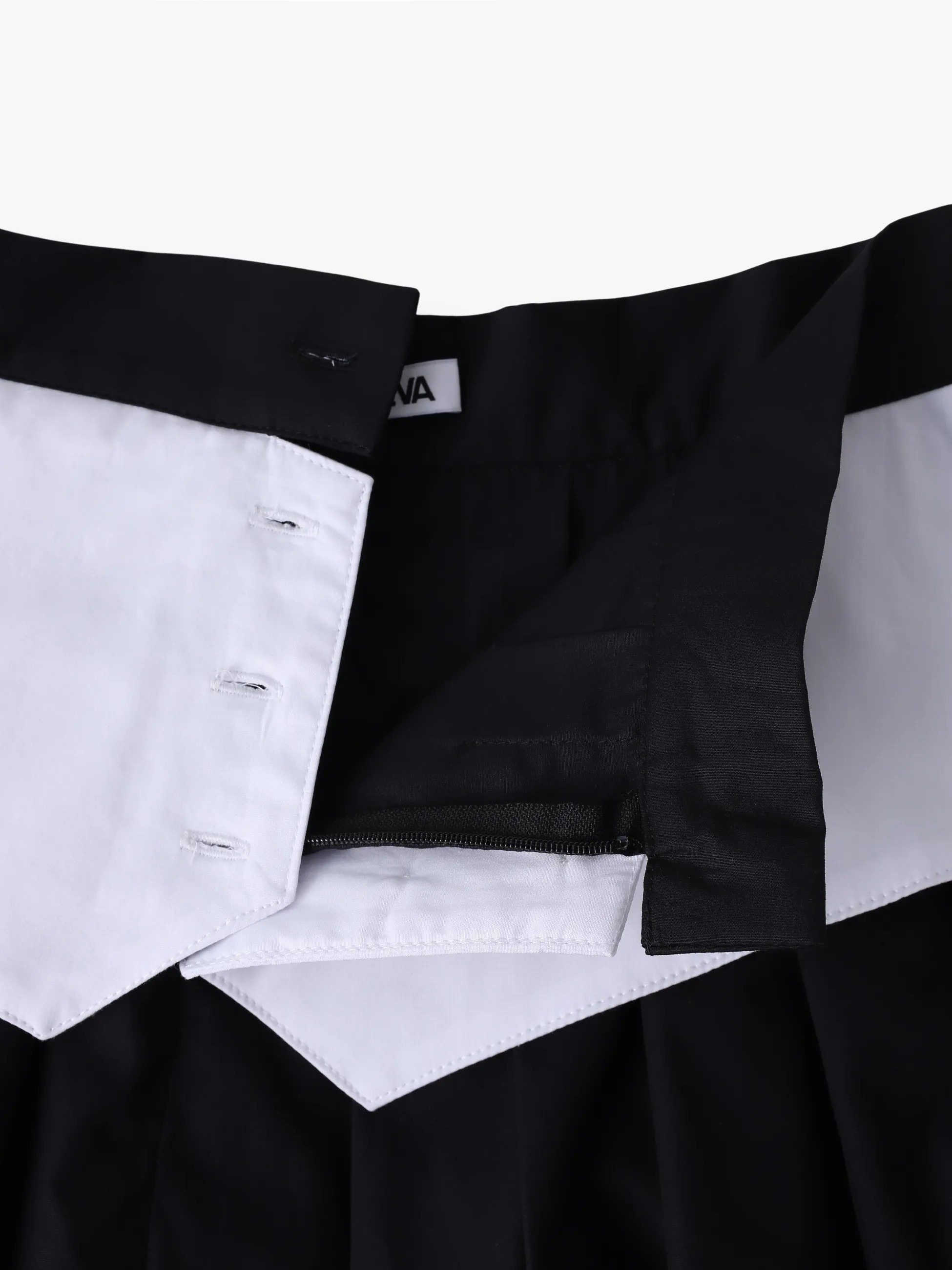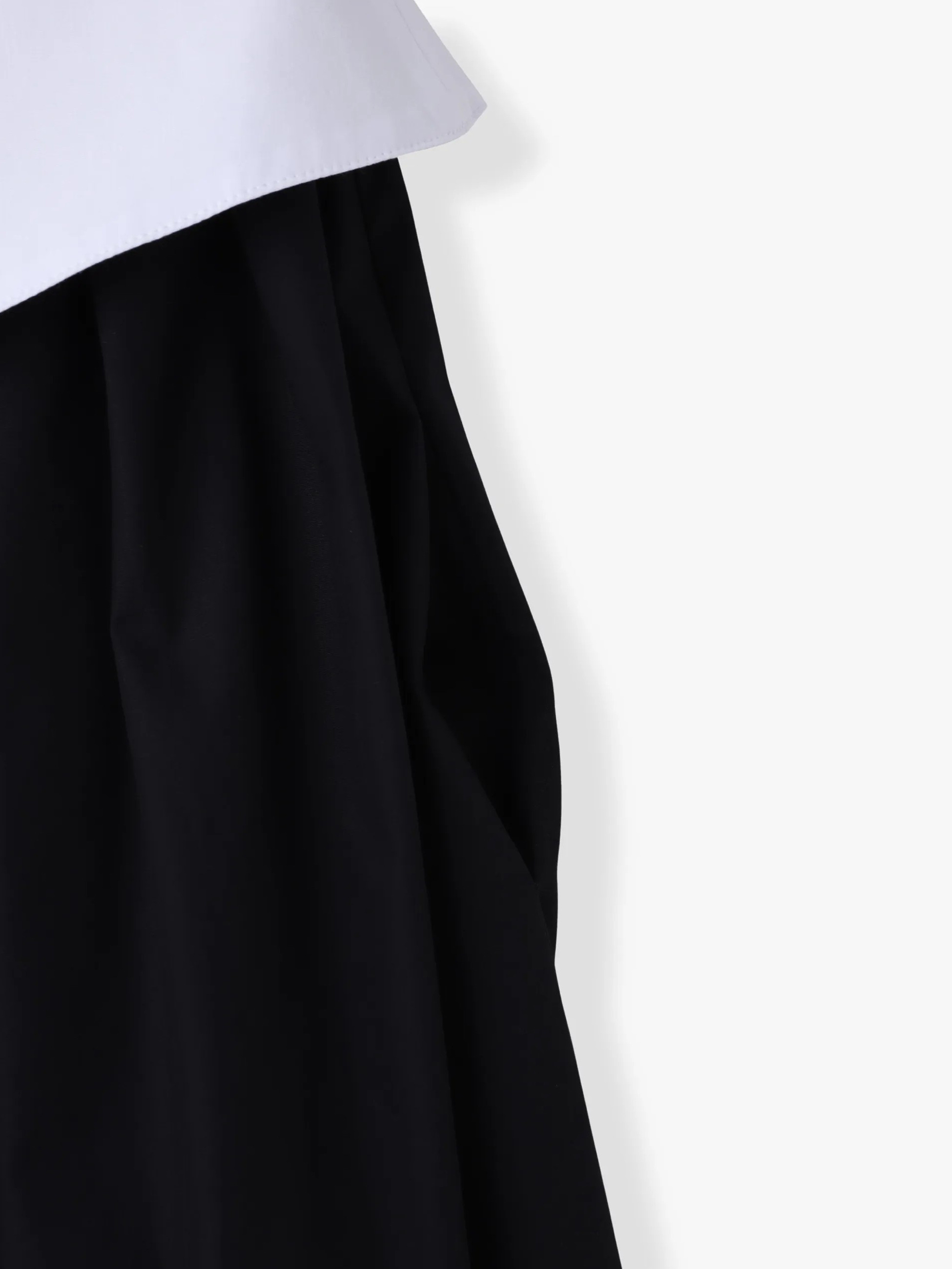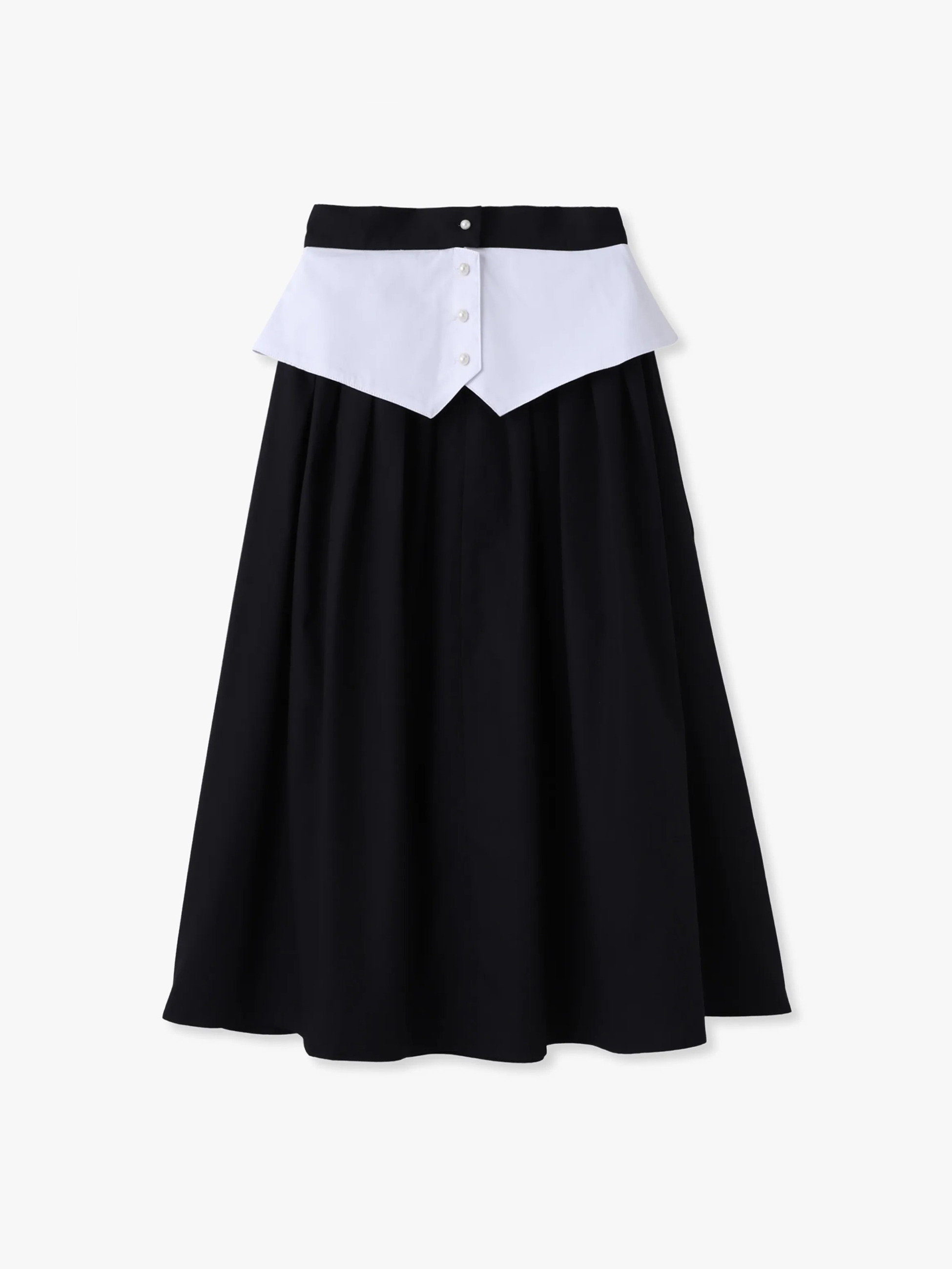 ピンタックの入った上品なシルエットのミディスカートは、コットンポプリン素材を使用し、しっかりとしたハリ感が特徴です。ホワイトのペプラムウエストが、スタイリングにアクセントを加え、さりげないパールボタンが上品な印象を演出します。ウエストはジップフライで、着脱しやすいのも嬉しいポイントです。