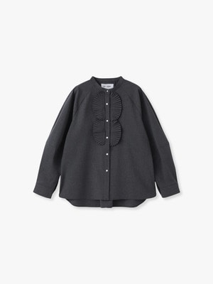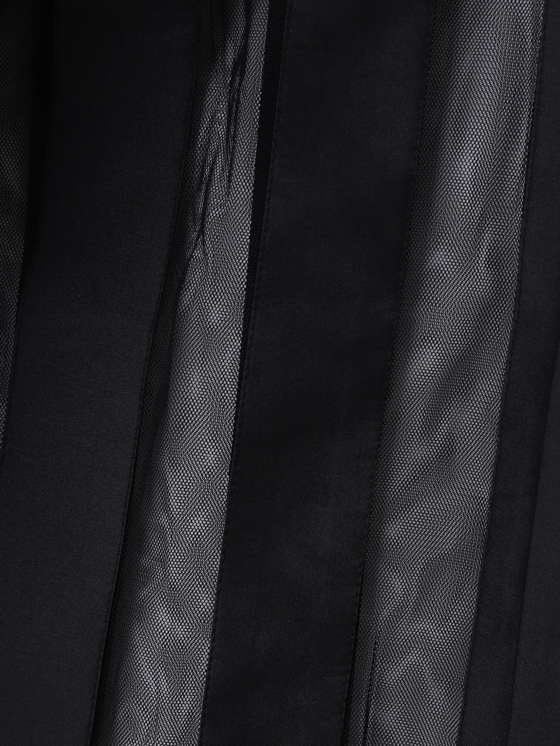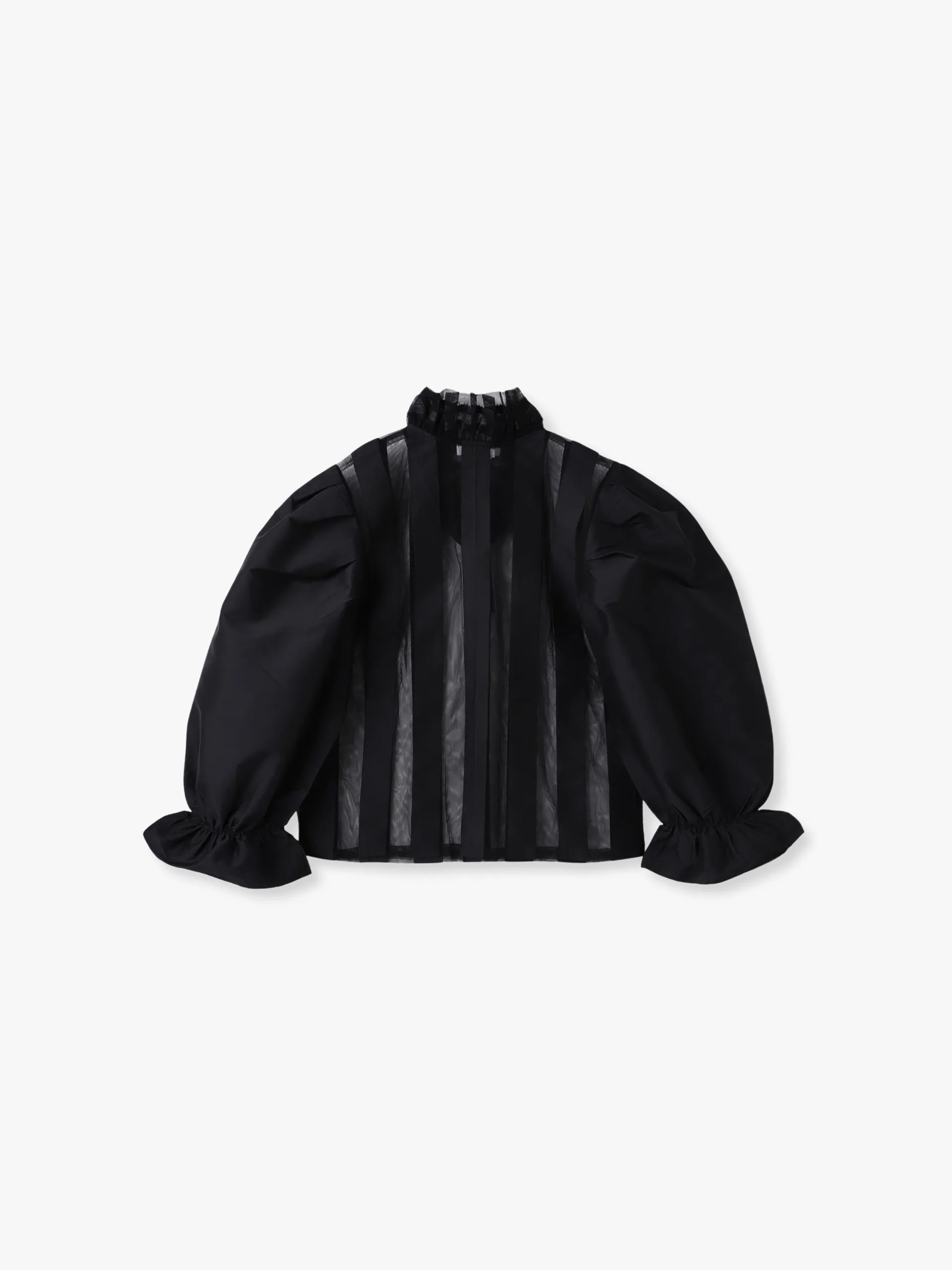 - フロントの大胆な透け感のあるメッシュが特徴のブラウスは、襟元のフリルデザインや、ふくらみのあるパフスリーブが華やかな1枚です。パーティーシーンやお出かけスタイルに活躍し、着るだけでドラマティックな印象を演出します。