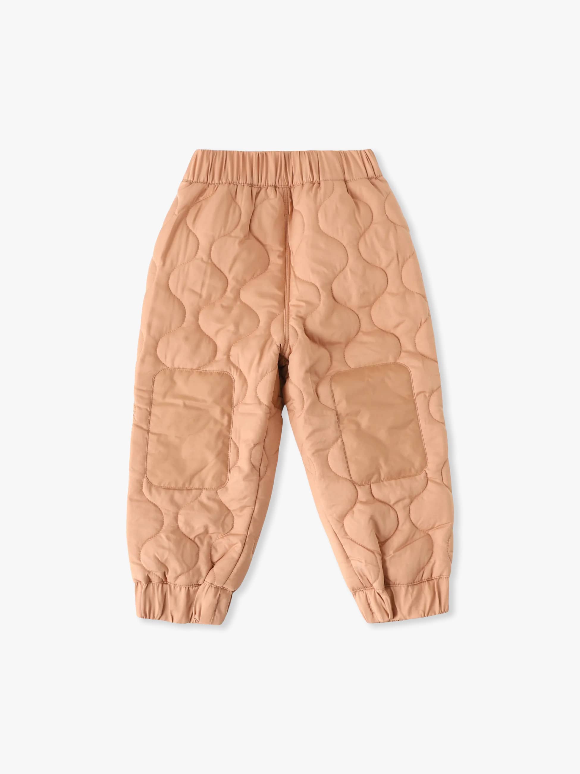 軽くてあたたかい着心地が魅力のキルティングパンツは、かさばりを最小限に抑えながら、お子さまの体をやさしく包み込みます。中綿にはリサイクル素材を使用したサーモグリーン・インサレーションを採用し、環境にも配慮した仕上がりです。膝とお尻には補強パッチを施しており、お子さまの元気いっぱいな動きもしっかりサポートします。同シリーズのキルテッドパフジャケットとセットアップで着ていただくのもおすすめです。