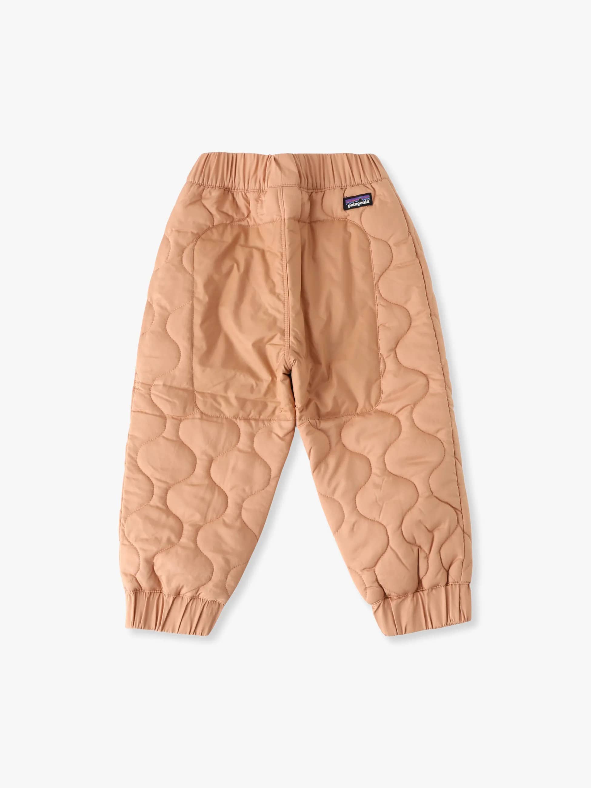 軽くてあたたかい着心地が魅力のキルティングパンツは、かさばりを最小限に抑えながら、お子さまの体をやさしく包み込みます。中綿にはリサイクル素材を使用したサーモグリーン・インサレーションを採用し、環境にも配慮した仕上がりです。膝とお尻には補強パッチを施しており、お子さまの元気いっぱいな動きもしっかりサポートします。同シリーズのキルテッドパフジャケットとセットアップで着ていただくのもおすすめです。