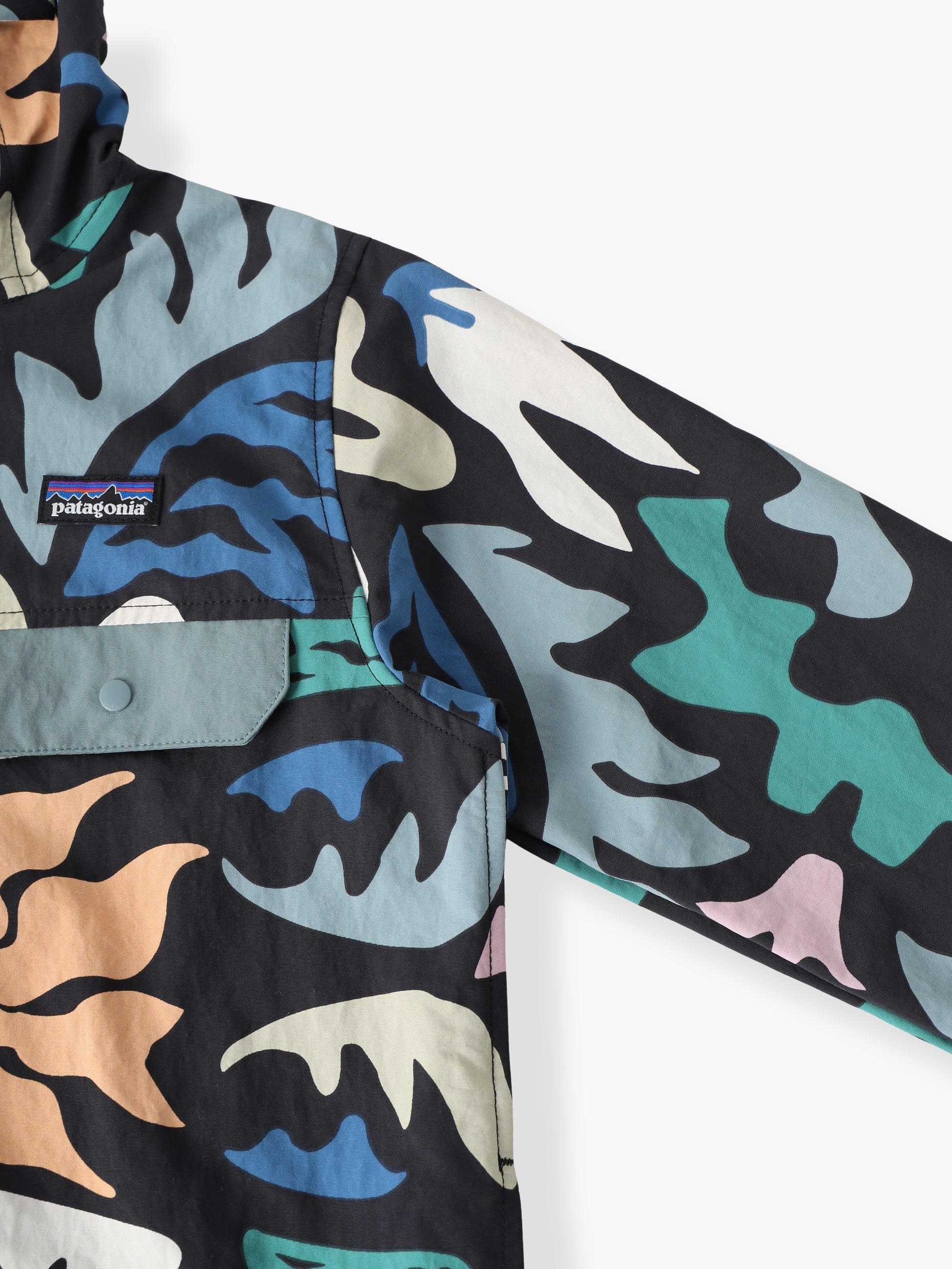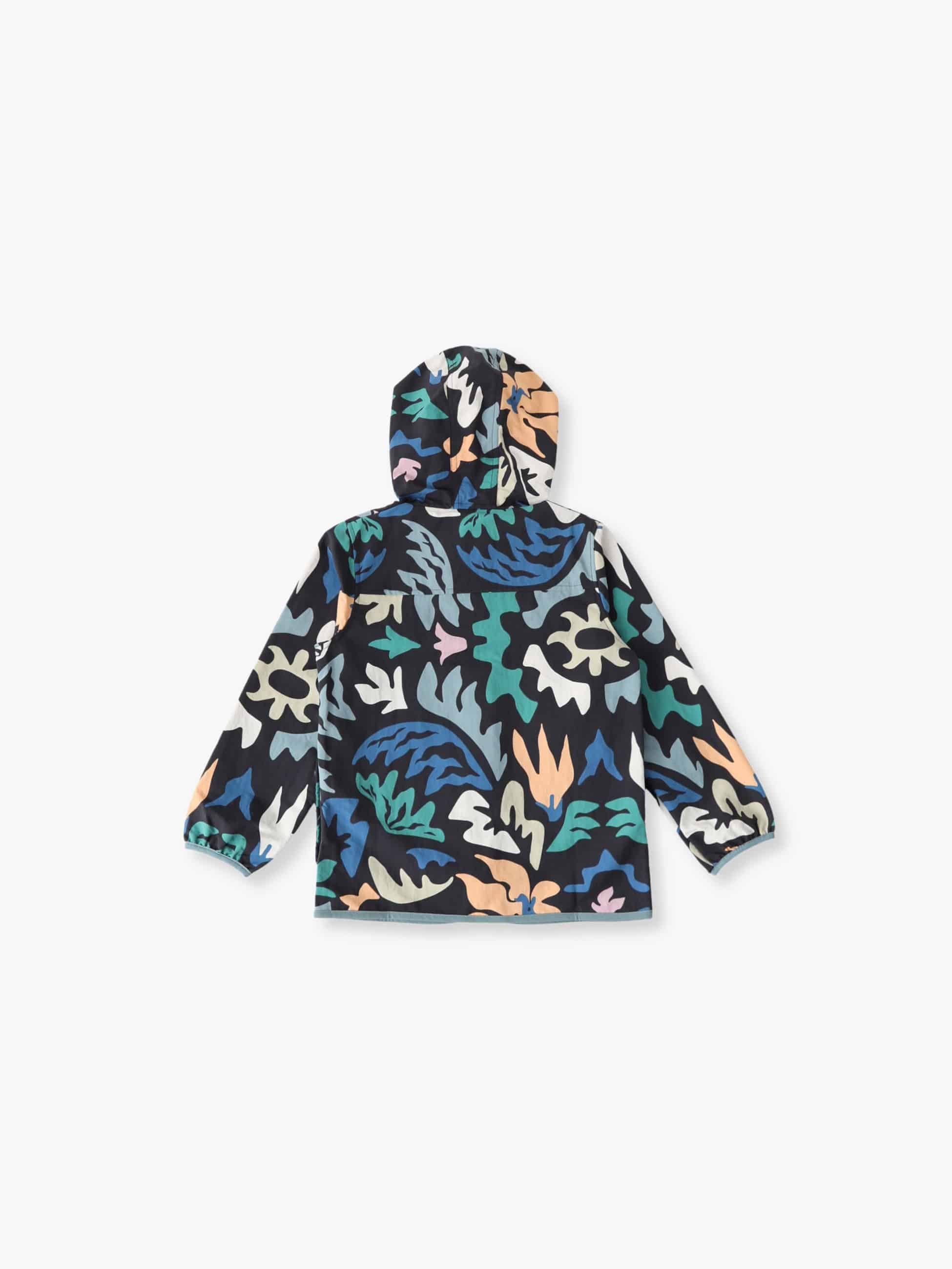 ブラックにカラフルなリーフ模様が目を惹くジャケットは、UVプロテクション(UPF40+)と軽い水をはじくDWR加工が施されており、日差しや風、小雨からしっかり守ります。フィット感のあるフードや風を防ぐウインドフラップ、ハンドウォーマーポケットも備えた頼れる一枚です。バギーズショーツ(ブラック/XS-M)とセットアップで着ると、統一感のあるスタイルに仕上がります。