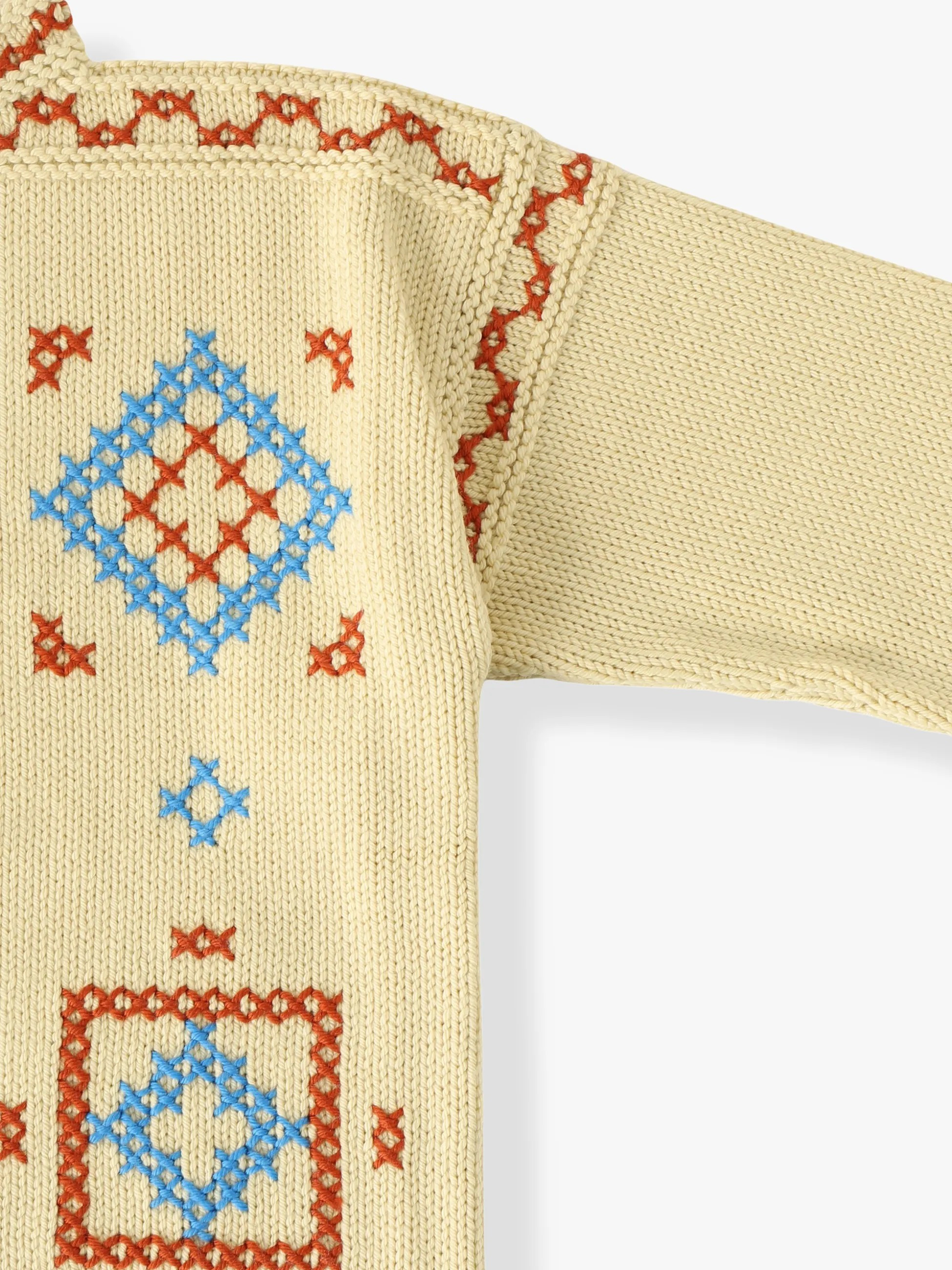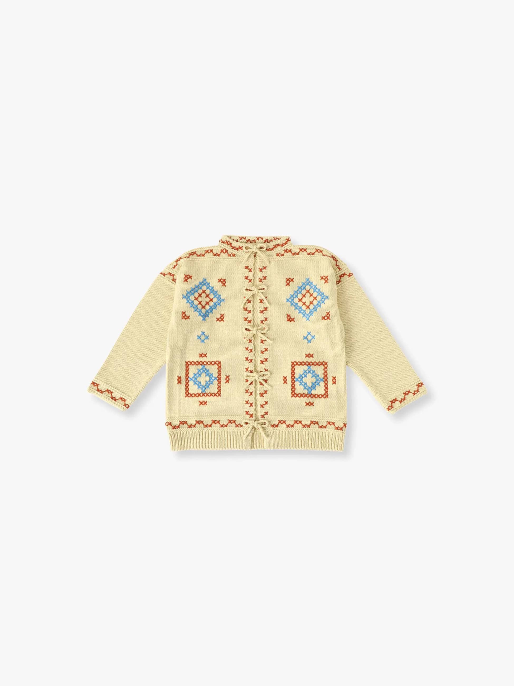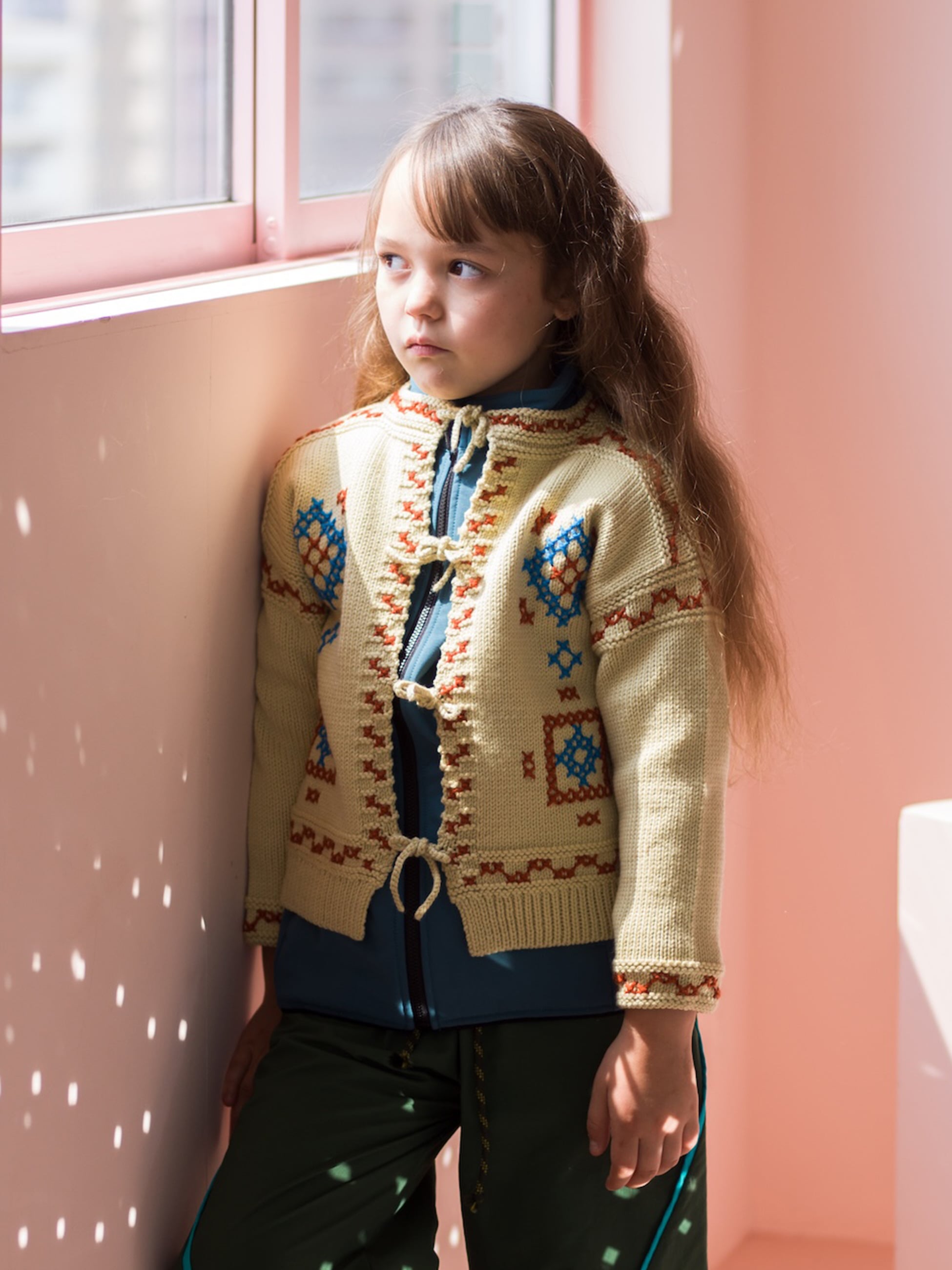 メリノウールを使用したスカンジナビア風のカーディガンは、手刺繍によるクロスステッチのデザインがキュートなアイテムです。スタンドカラーが首元をすっきりと見せ、タイフロント仕様がさりげない個性を添えています。