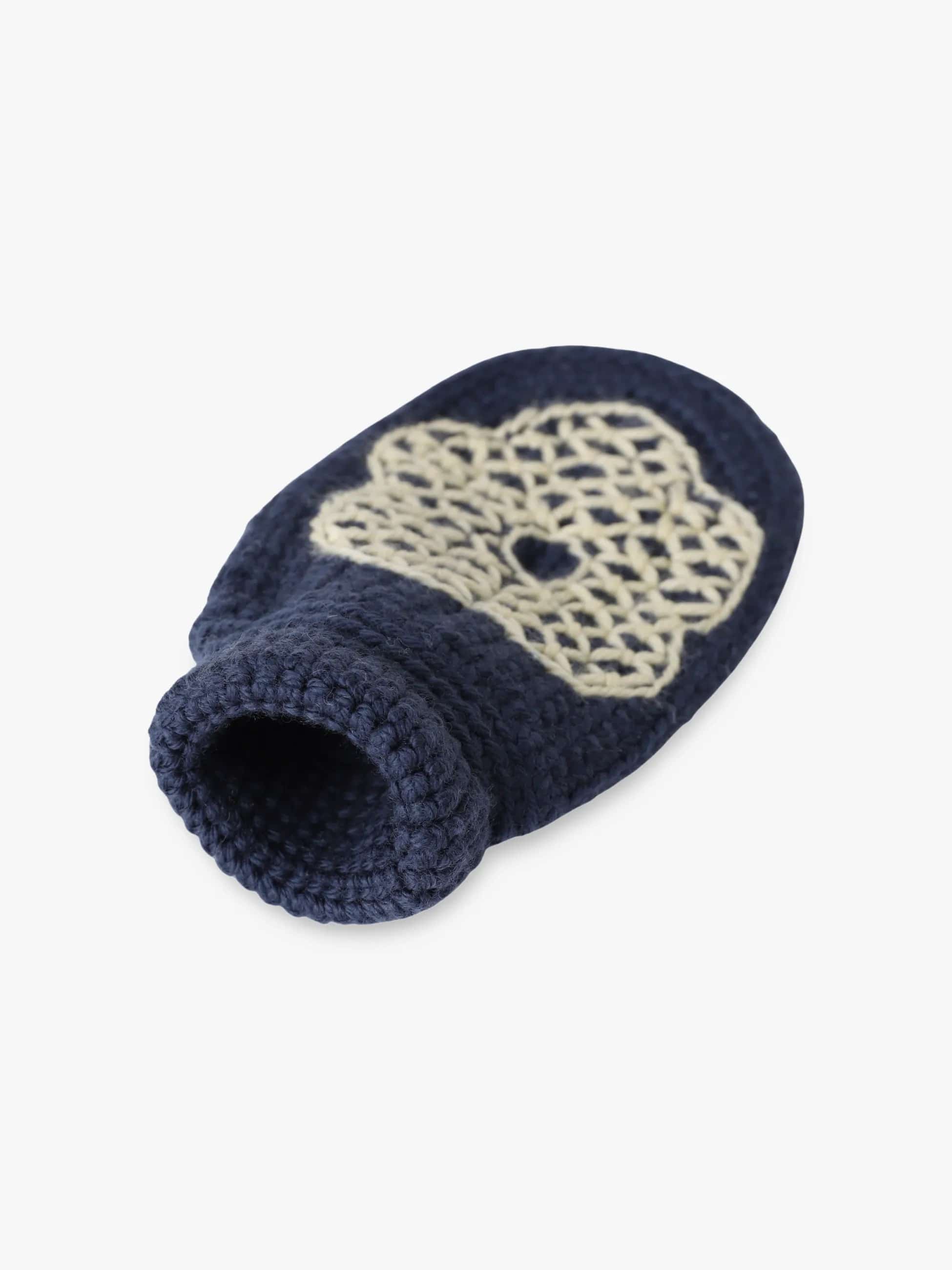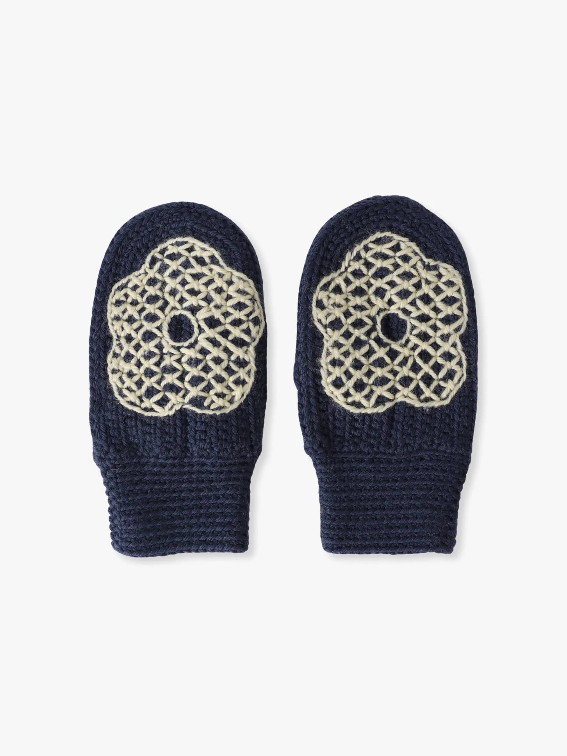 ヴィンテージ風の花柄モチーフをあしらった手編みミトンは、手元に優しい存在感を添えます。素材には100%メリノウールを使用し、ふんわりとした肌触りと高い保温性を兼ね備えています。寒い季節の外出を、心地よく彩るアイテムです。