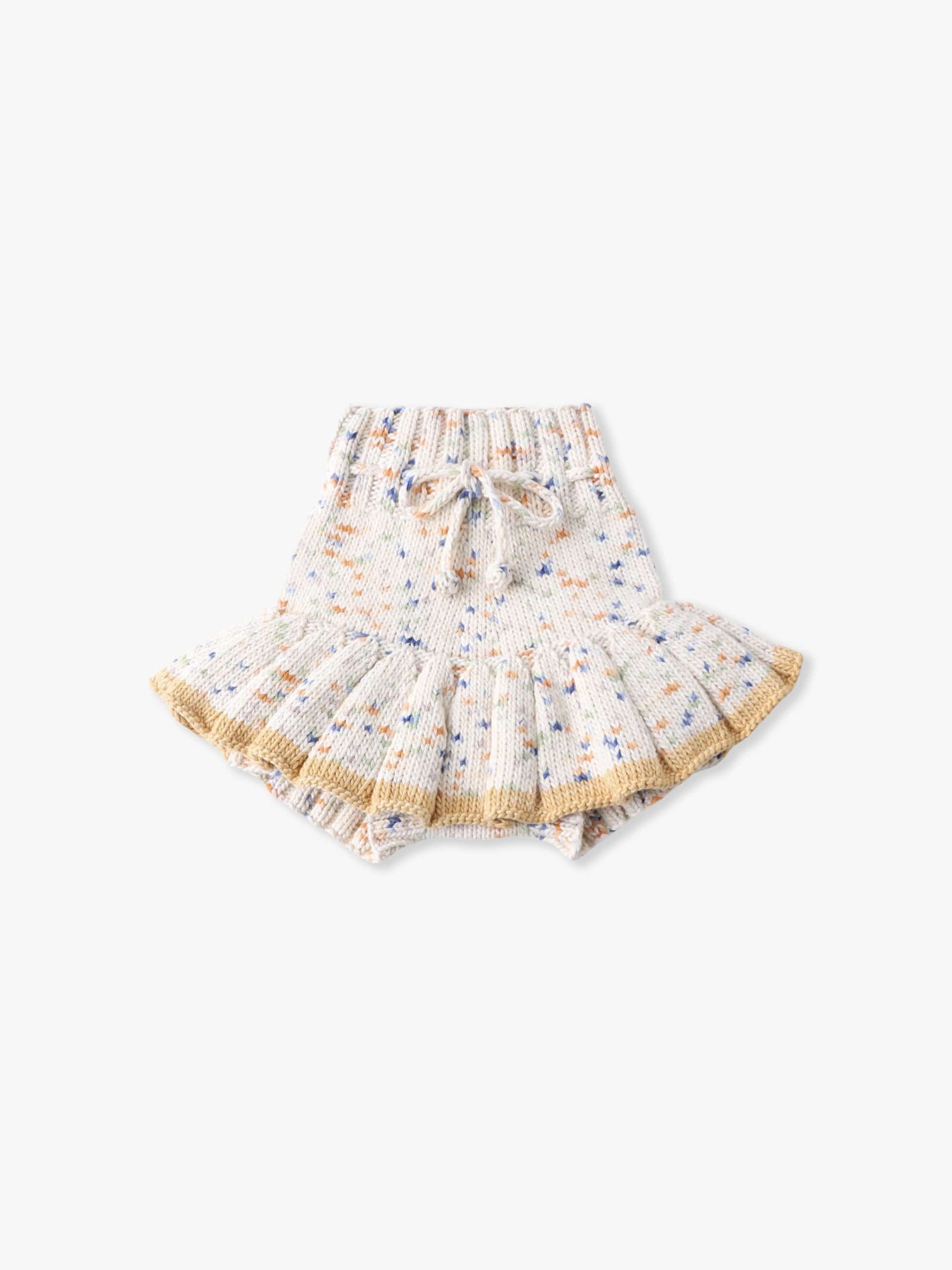 Misha & Puffで人気のスケーティングポンドスカートは、リブ編みのディテールが可愛らしいブルマーと、ウエストのフィット感の調整ができるポップコーンタイのドローストリングが特徴です。手染めのコットン糸で編まれているためニュアンスのあるカラーが美しく、穿き心地の良さも兼ね備えています。