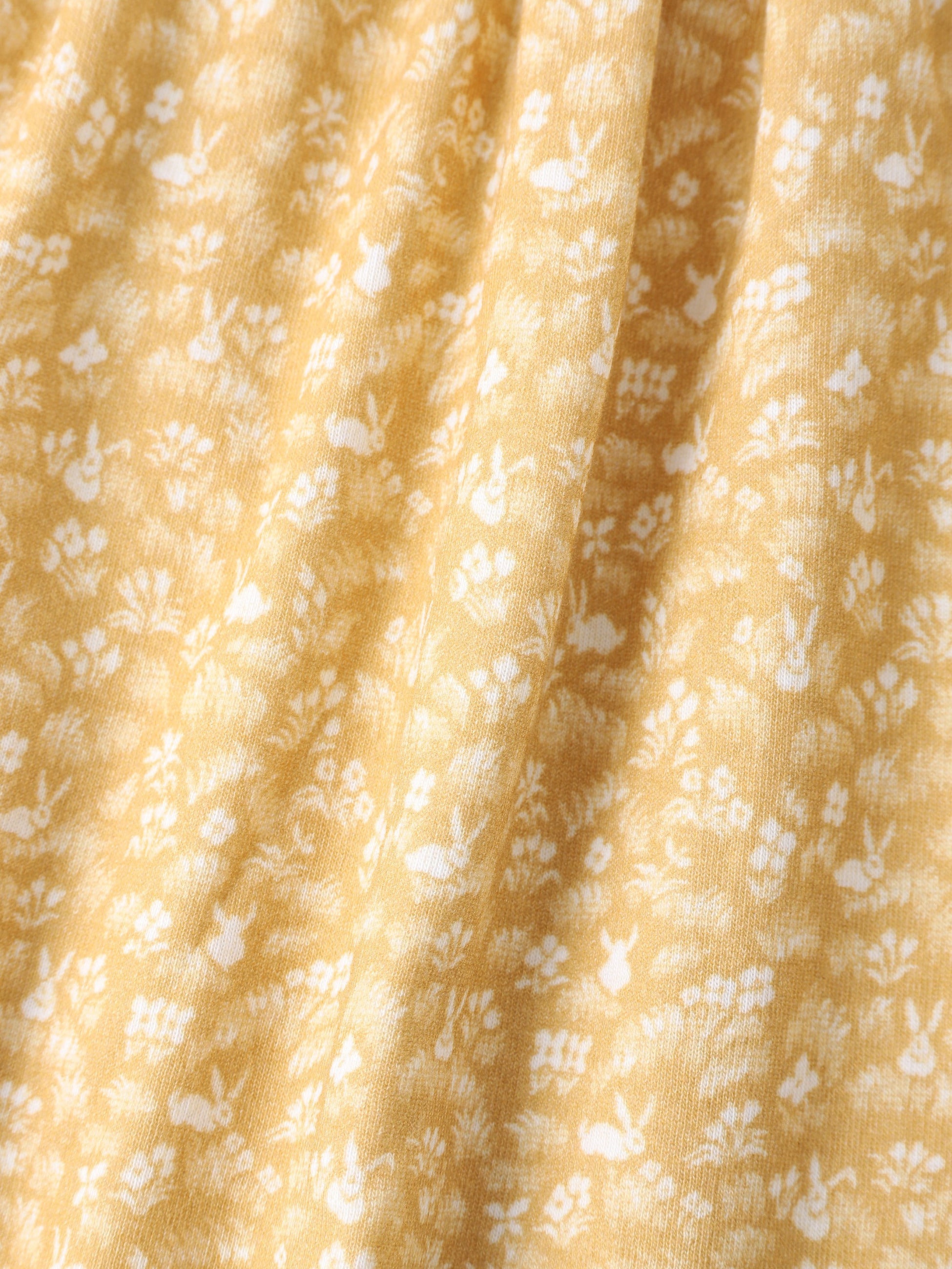 オレンジにウサギと小花のプリントがキュートなパンツは、ギャザー入りの伸縮性のあるウエストバンドと裾のカフスが特徴です。柔らかいコットン素材を使用しているため、快適な着心地です。ギフトにもおすすめのアイテムです。
