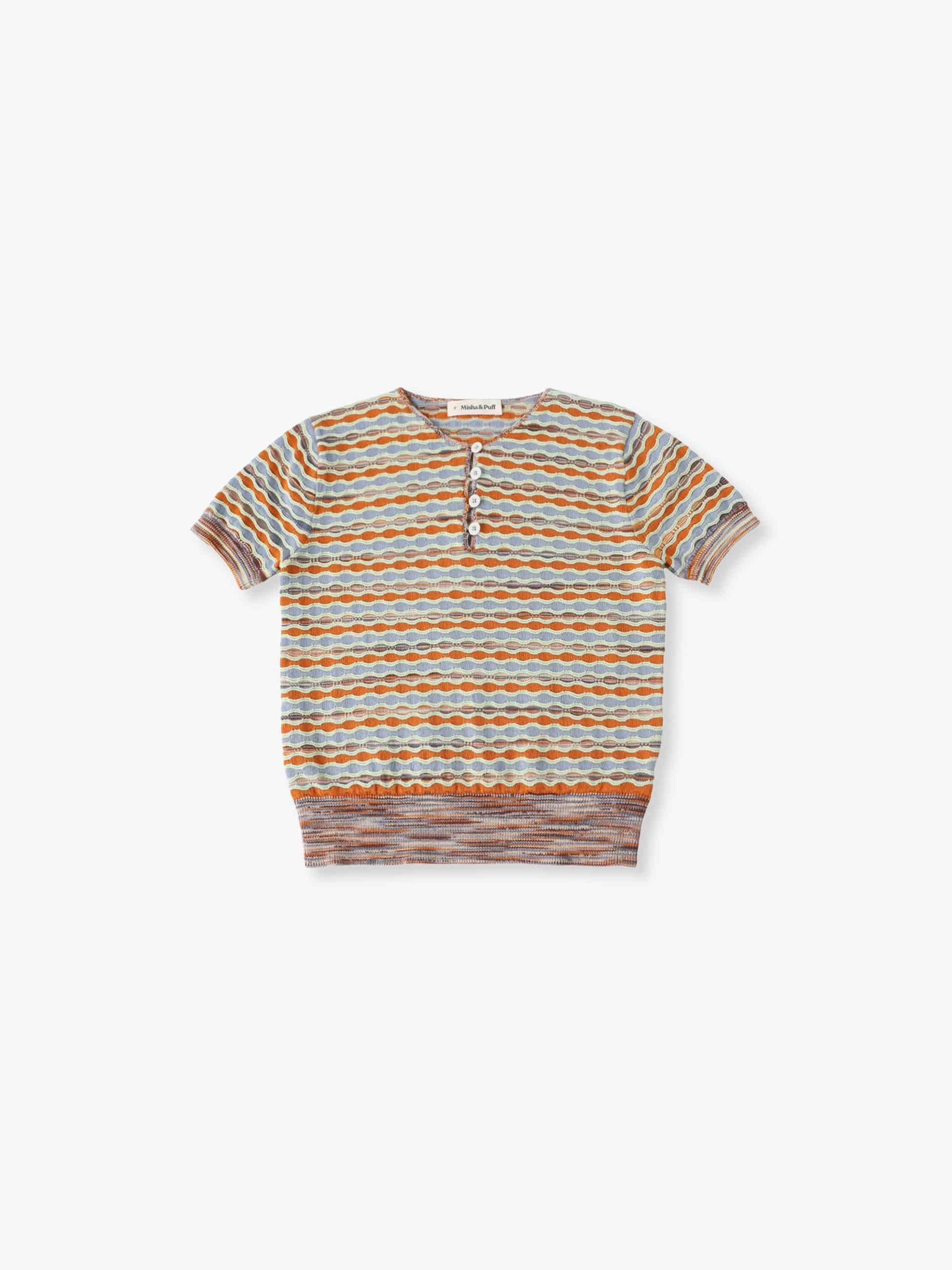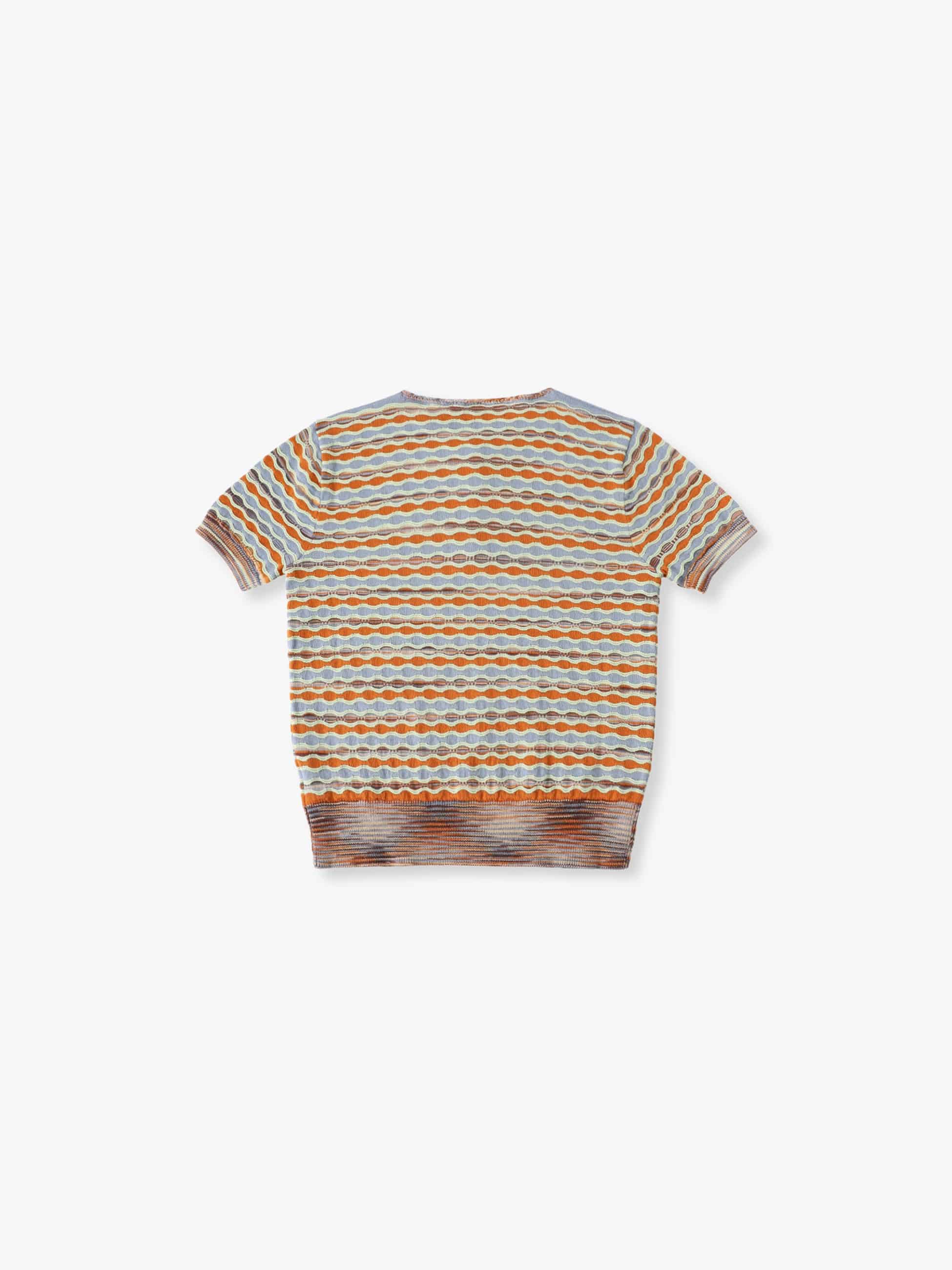 マルチカラーのウェーブストライプがキュートなトップスは、コットン素材ならではの快適な着心地が魅力です。細ゲージの編み地がやわらかく肌に馴染み、1枚で華やかな印象に仕上がります。シンプルなボトムスとも好相性のデザインです。