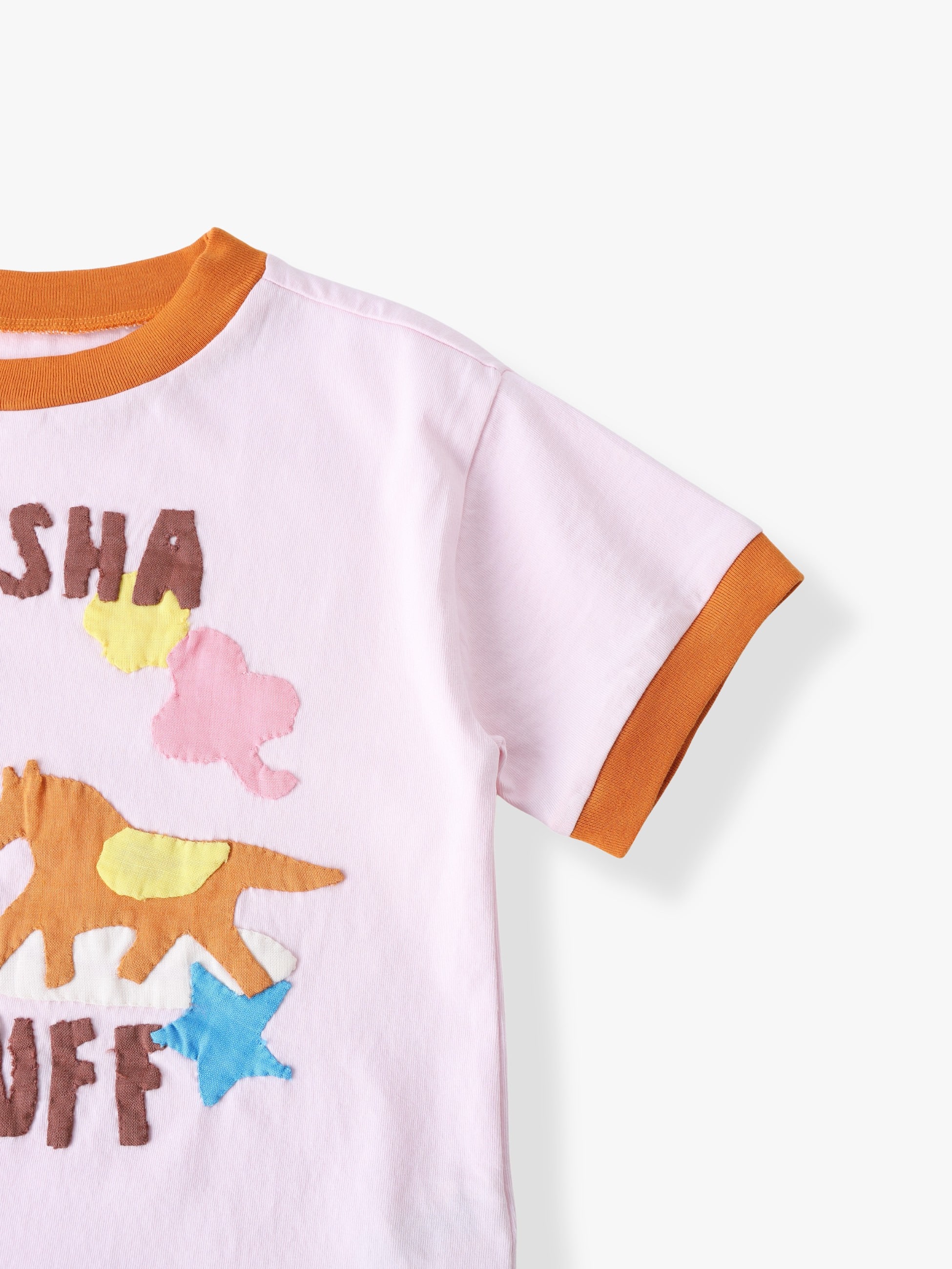 切り絵からインスピレーションを得た、アニマルやスターのアップリケがキュートなTシャツです。やや厚みのあるしっかりとしたコットン生地のため、日常使いにも安心です。首元と袖口のリンガーデザインがアクセントになり、1枚でコーディネートが決まるアイテムです。