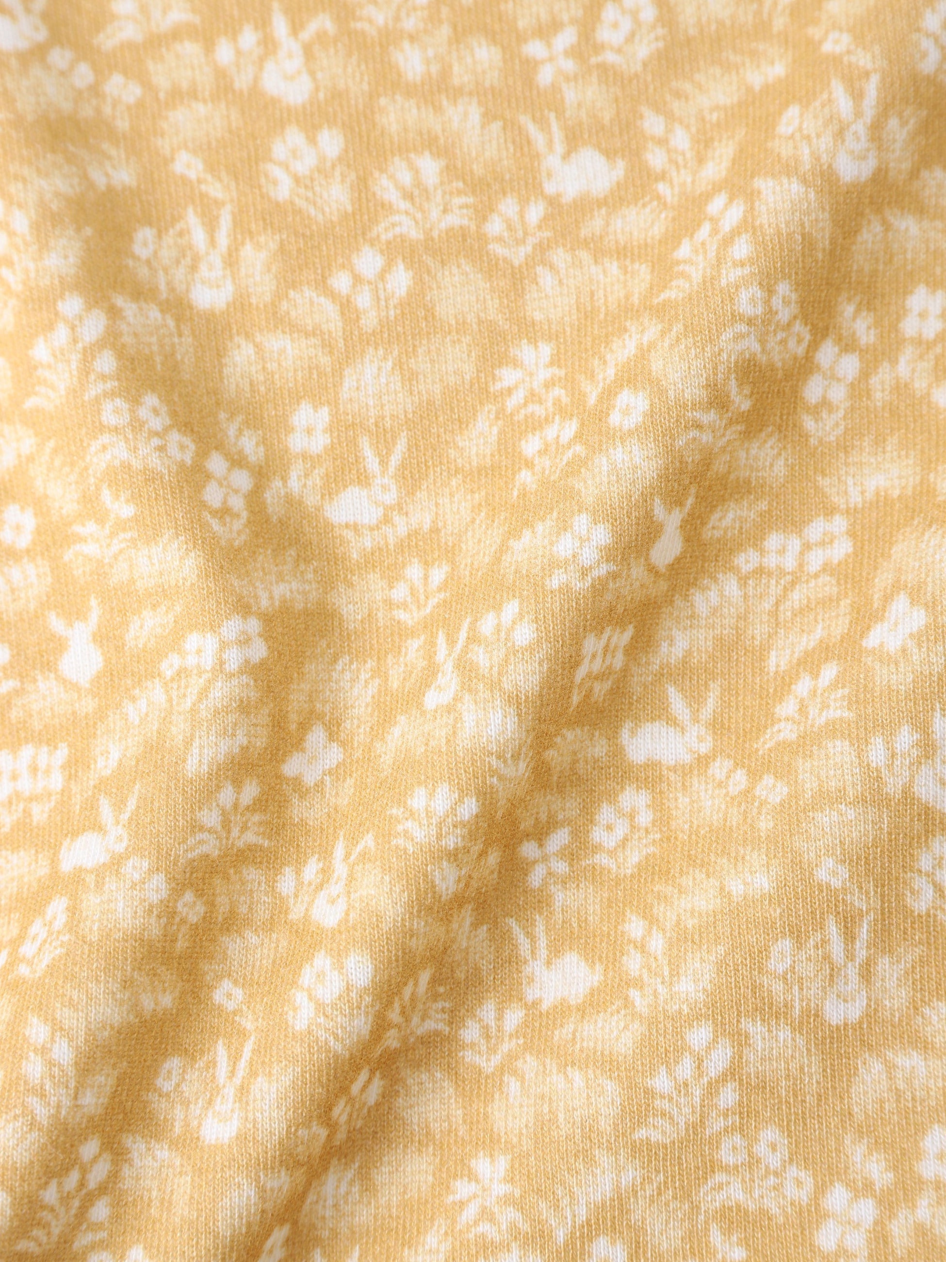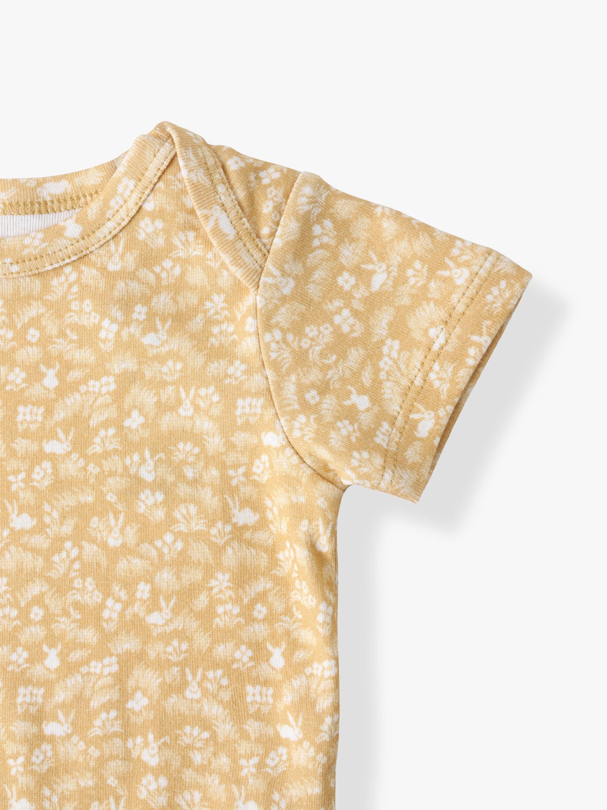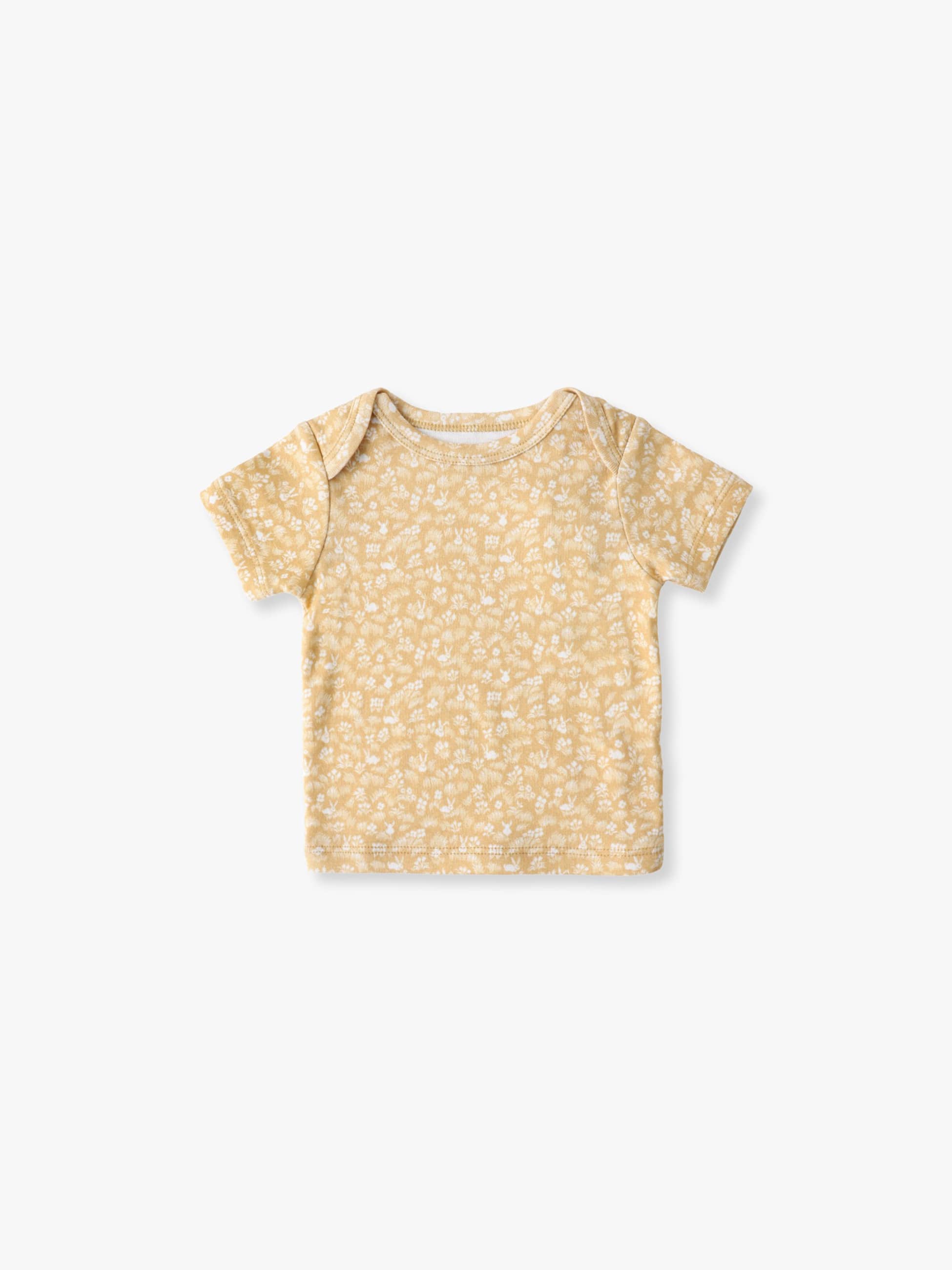 オレンジにウサギと小花のプリントが思い切りキュートなTシャツは、ラップショルダーのディテールが特徴です。コットン素材を使用しているため、赤ちゃんの繊細なお肌にもやさしいなめらかな肌触りです。ギフトにもおすすめのアイテムです。