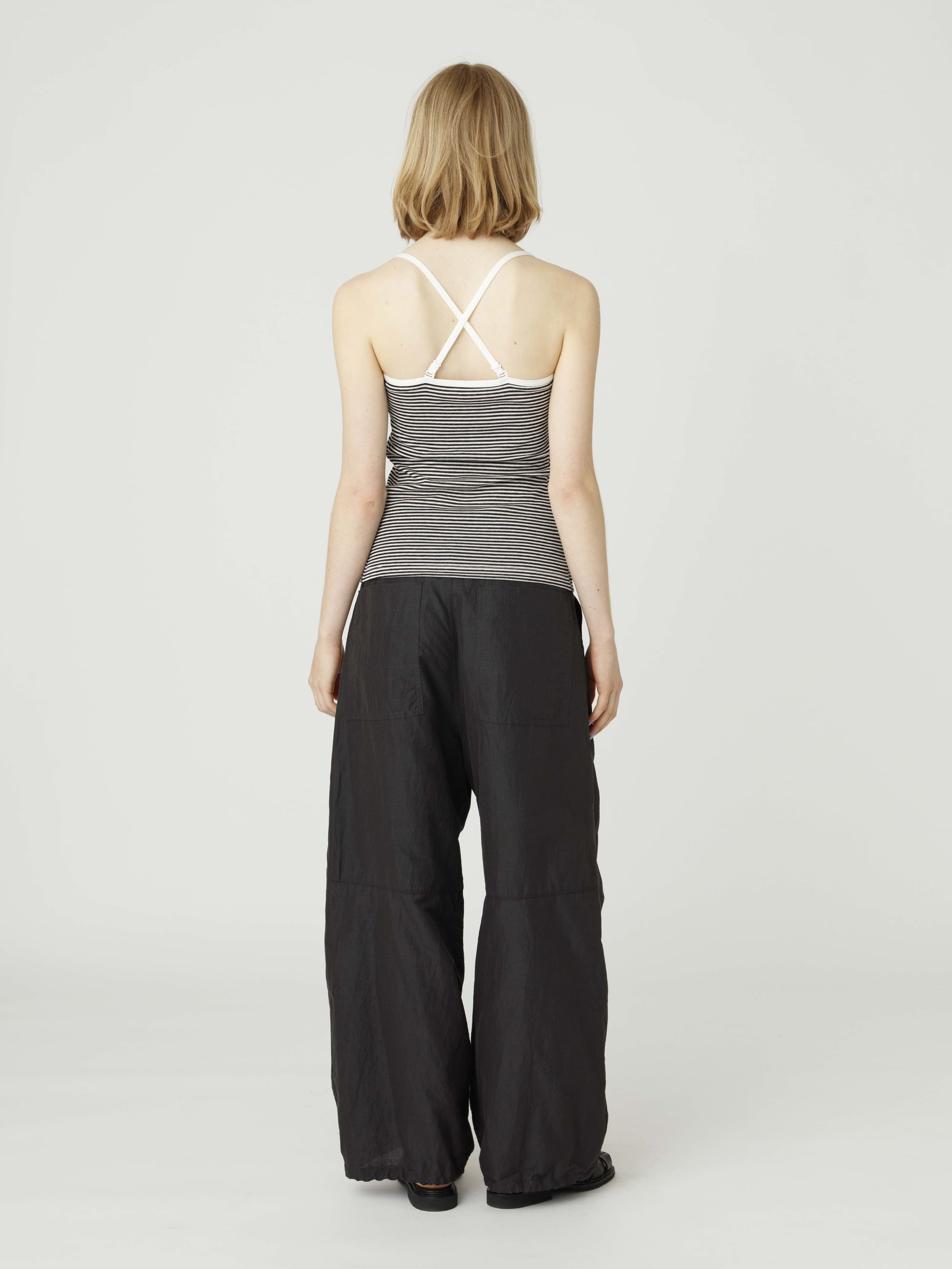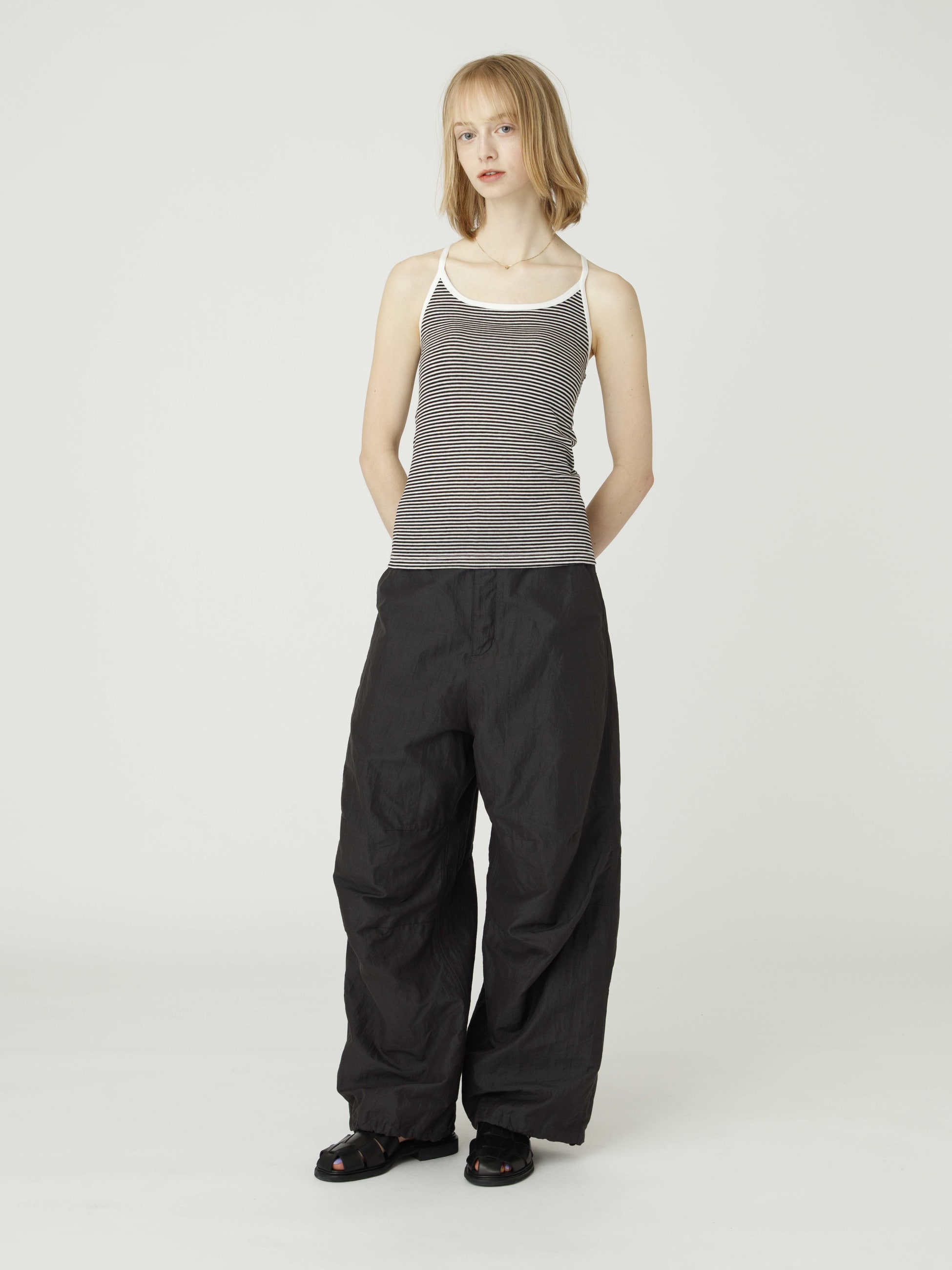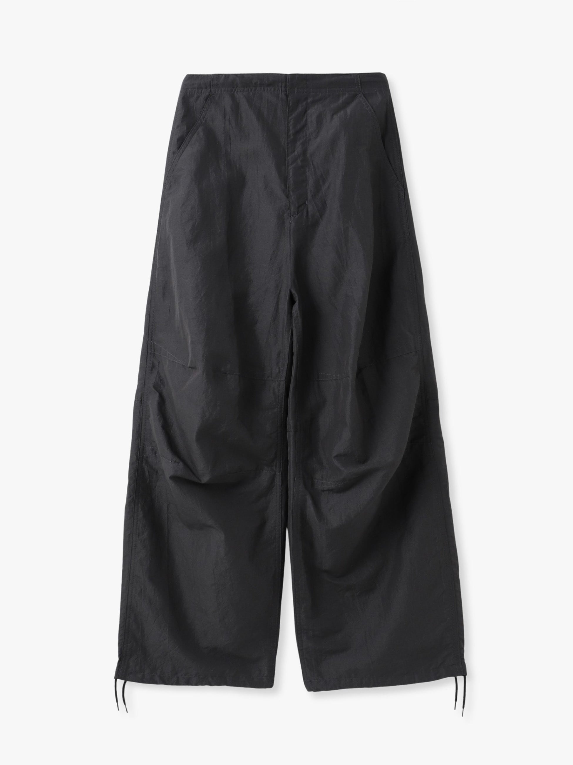 ミリタリーのスノーパンツをベースにした、オーバーサイズのパンツは、国内で織りあげたシルクとリネンによるポプリン素材が軽やかな印象で、シルクの光沢、リネンのハリ感とラフ感が特長です。ゆったりとしたシルエットがリラクシーな印象で、裾のコードを絞るとシルエットのアレンジも可能です。