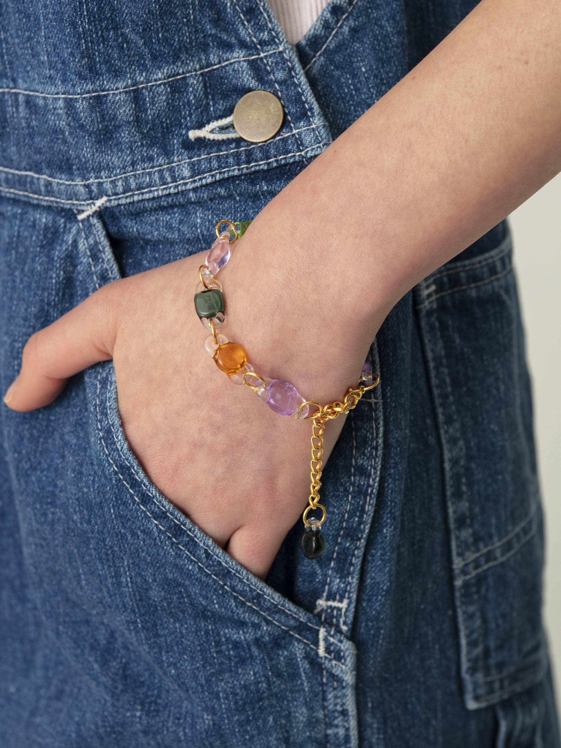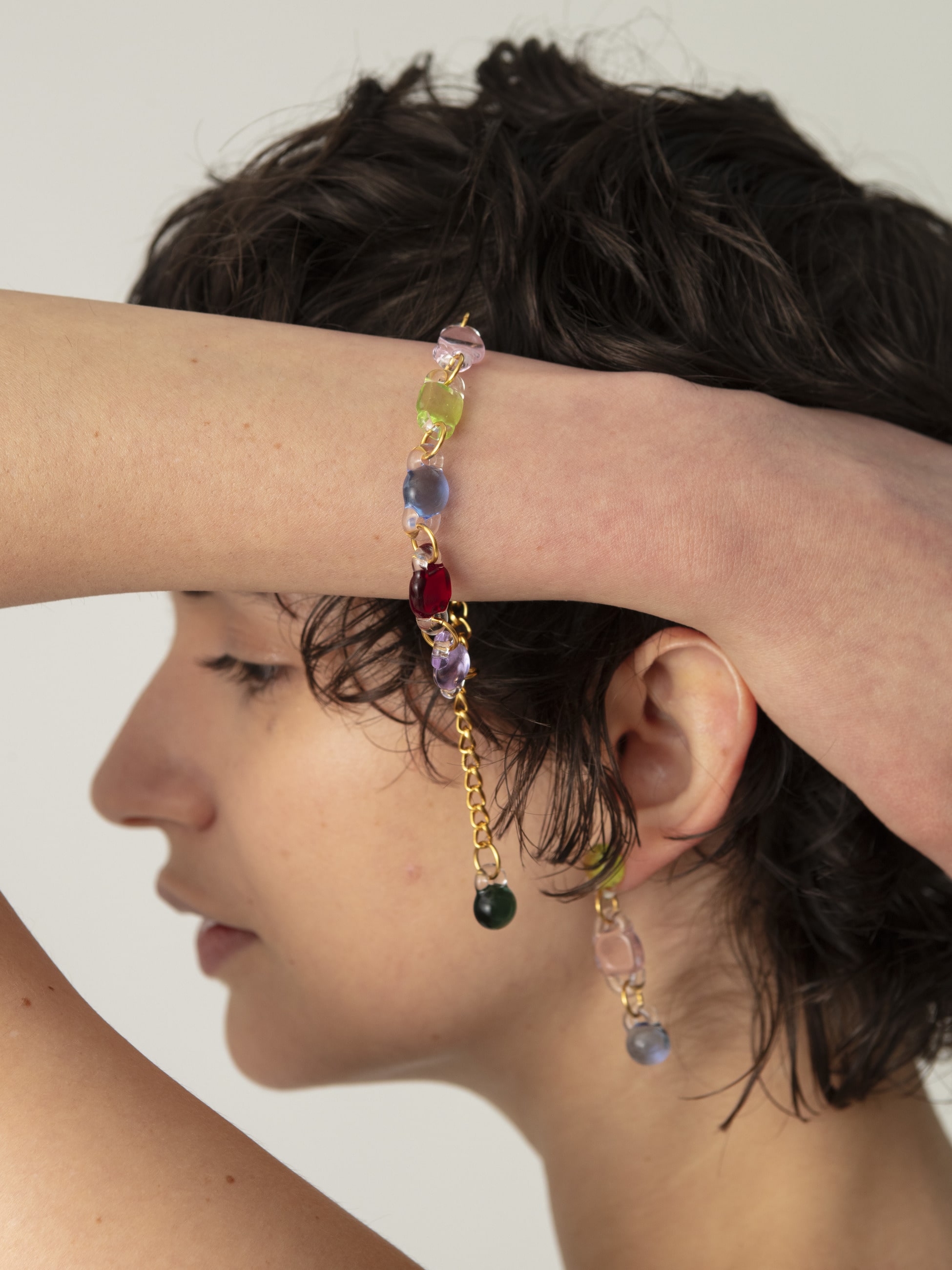 - 甘酸っぱいカラフルなカラーリングのブレスレットは、程よいボリューム感で合わせやすく、コーディネートに彩りを添えます。RHC ロンハーマンのカジュアルなスタイリングにも好相性です。1点ずつハンドメイドで生み出される、繊細なガラスならではの質感と、自由で個性豊かな表情をぜひお楽しみください。