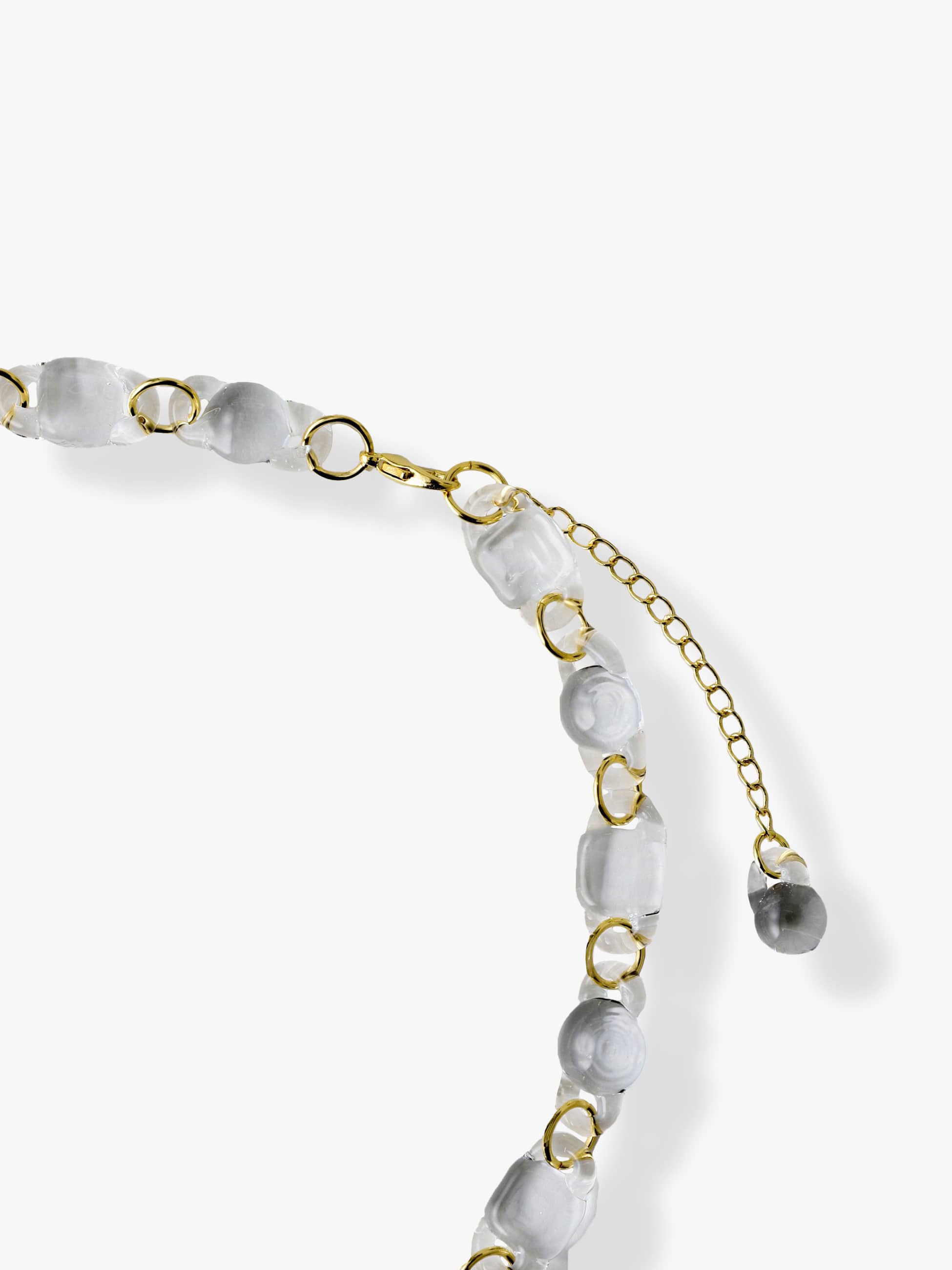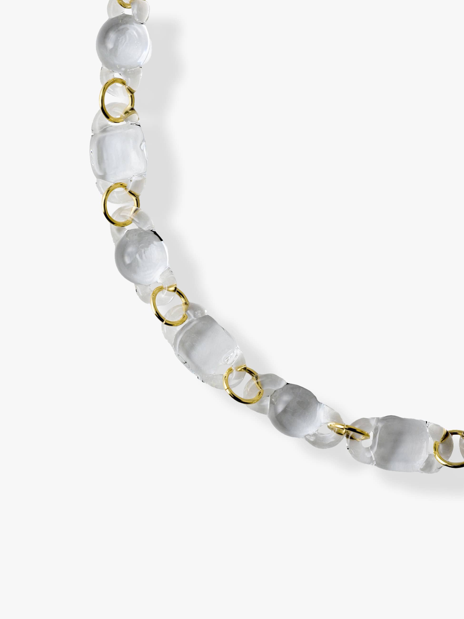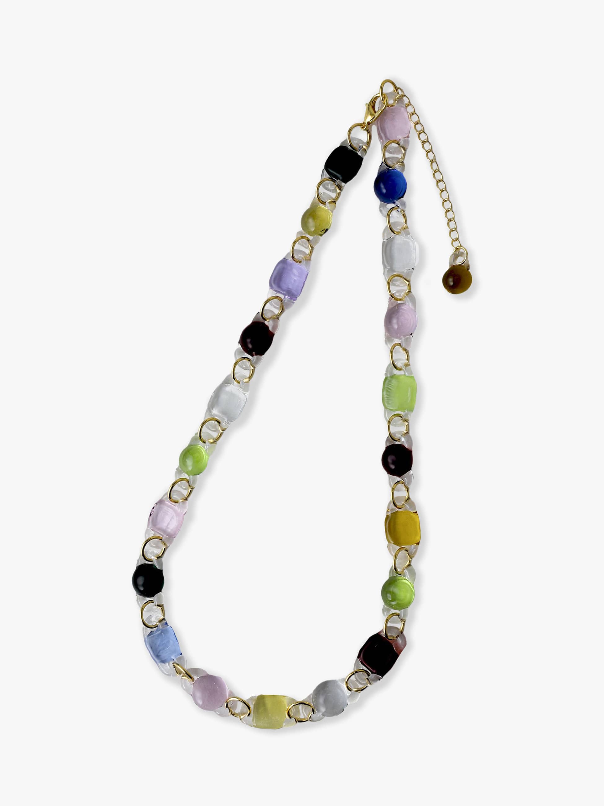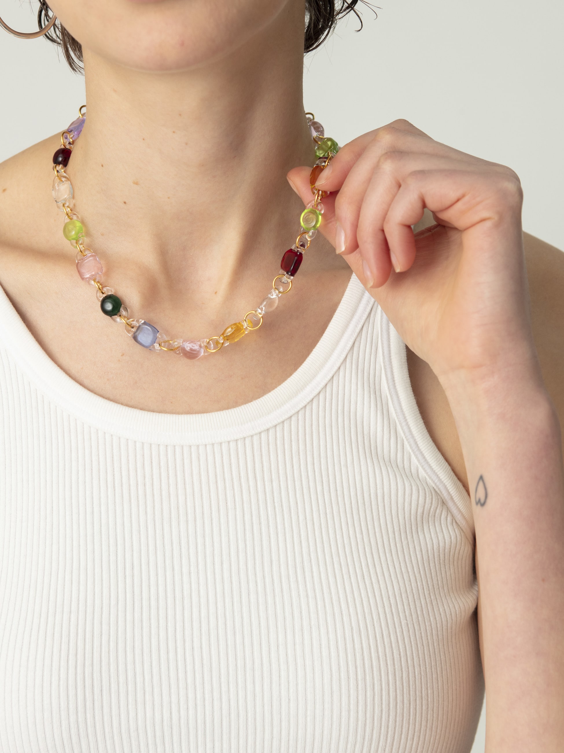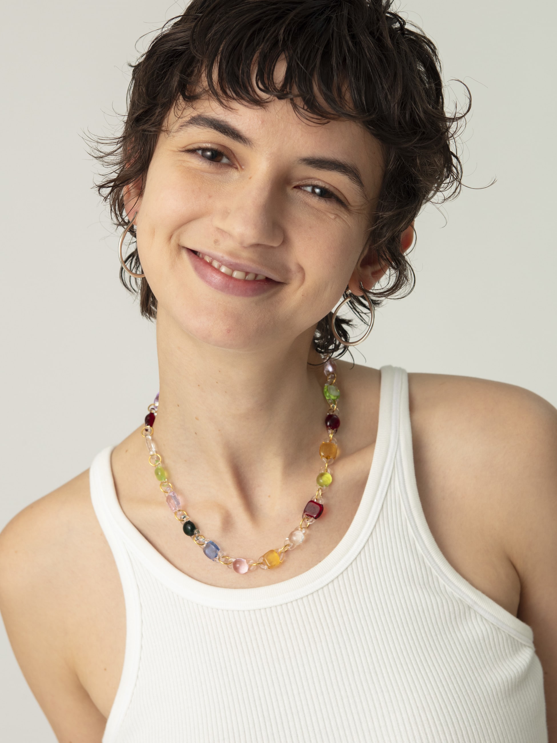 - 瑞々しいガラスモチーフをつないだネックレスは、キャンディーのようなマルチカラーと、清涼感のあるクリアカラーの2色展開です。程よいボリューム感が目を惹き、RHC ロンハーマンのカジュアルなスタイリングにも好相性です。1点ずつハンドメイドで生み出される、繊細なガラスならではの質感と、自由で個性豊かな表情をぜひお楽しみください。