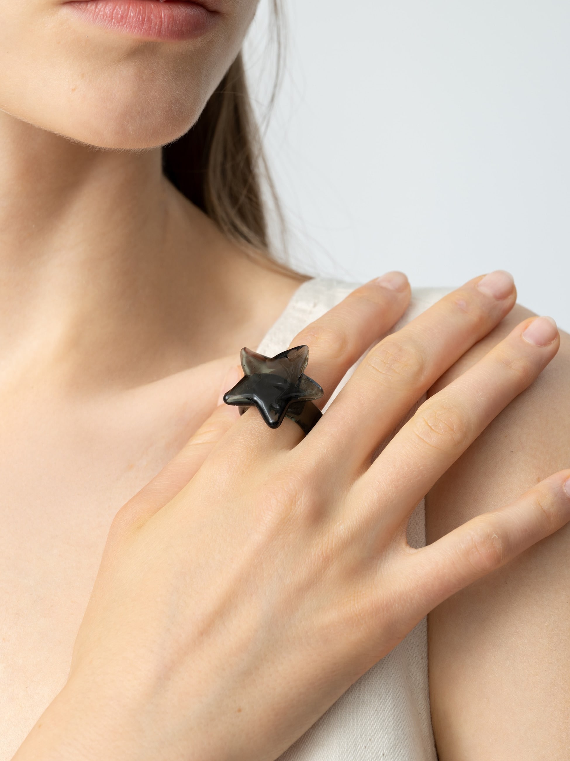 - 星と月をモチーフにした別注のカプセルコレクションから、リングが登場です。情熱的なレッド、抜け感のあるブラックの2色展開で、ひとつで存在感を醸すボリューム感が、コーディネートに遊び心をプラスします。バルセロナの工房で1点ずつハンドメイドで生み出される、繊細なガラスならではの質感と、自由で個性豊かな表情をぜひお楽しみください。
