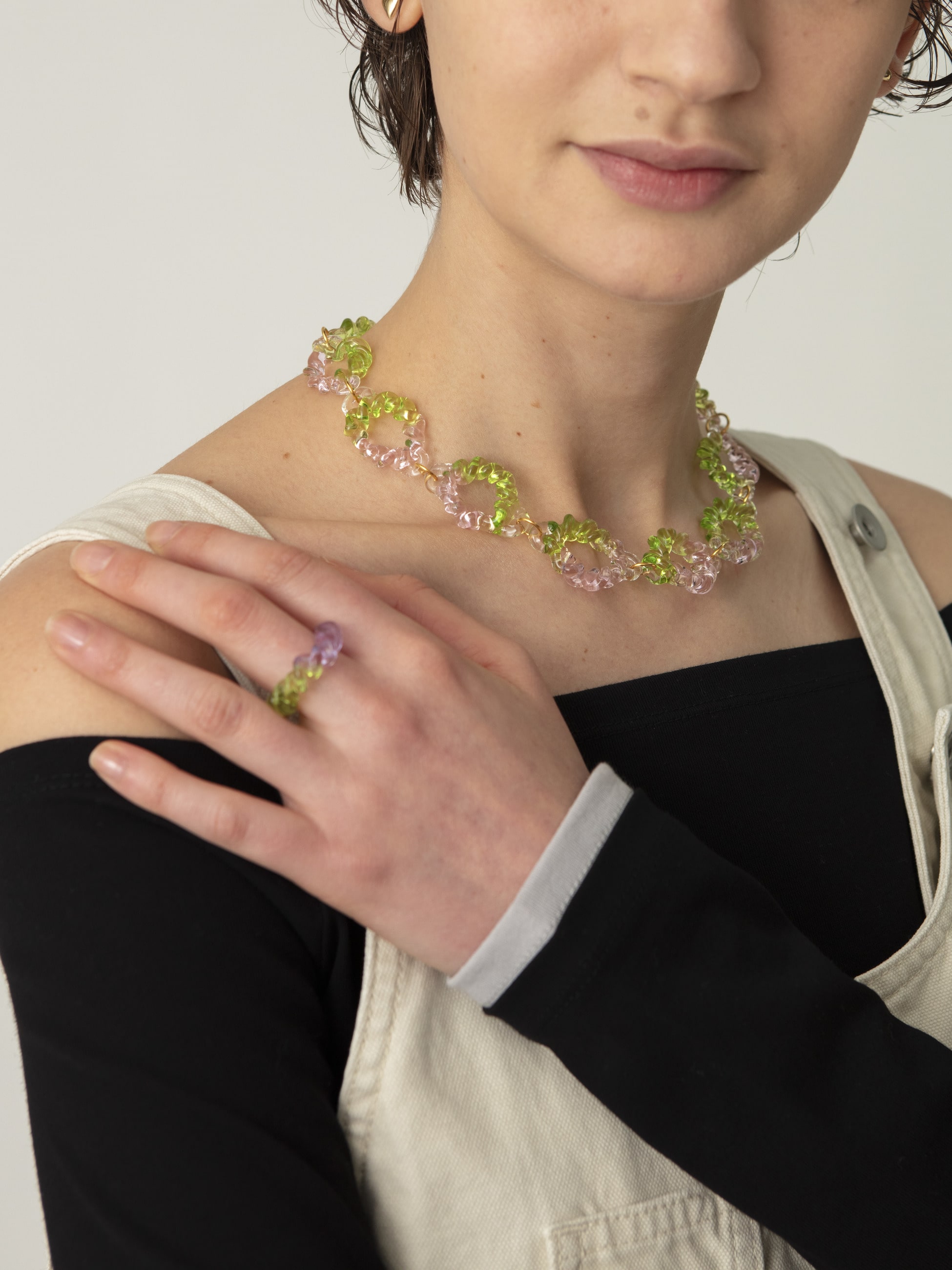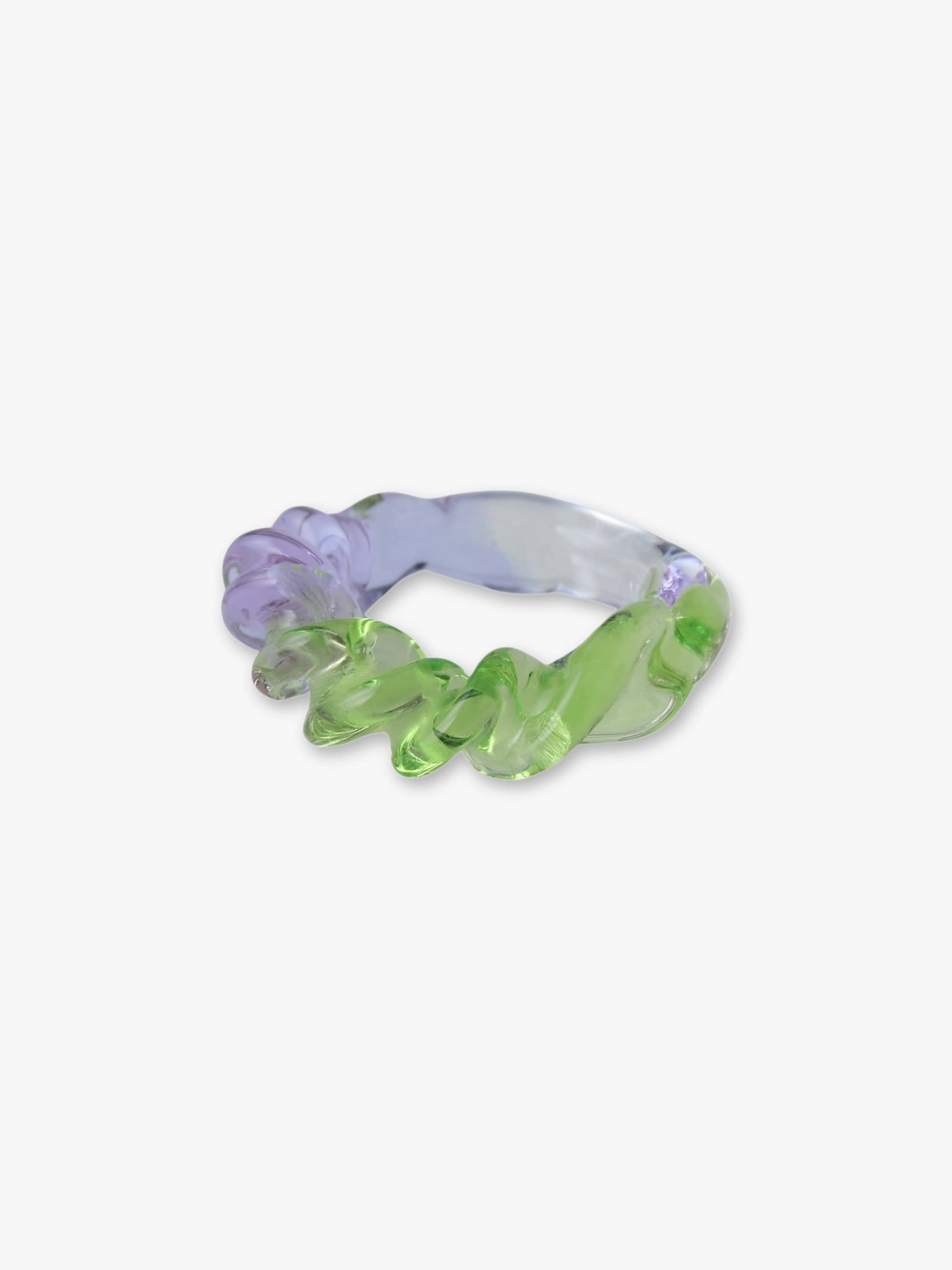 甘酸っぱいカラフルなカラーリングをセレクトし別注したリングは、立体感のあるツイストデザインが、手元をより印象的に演出します。1点ずつハンドメイドで生み出される、繊細なガラスならではの質感と、自由で個性豊かな表情をぜひお楽しみください。