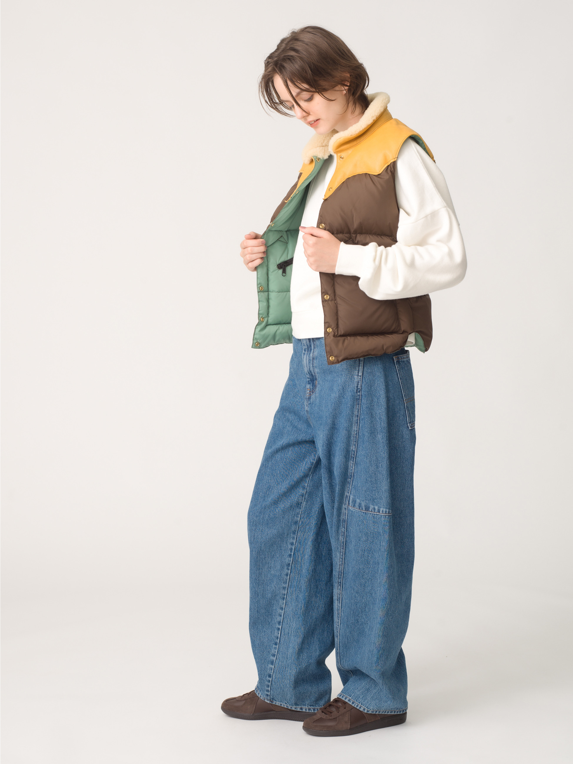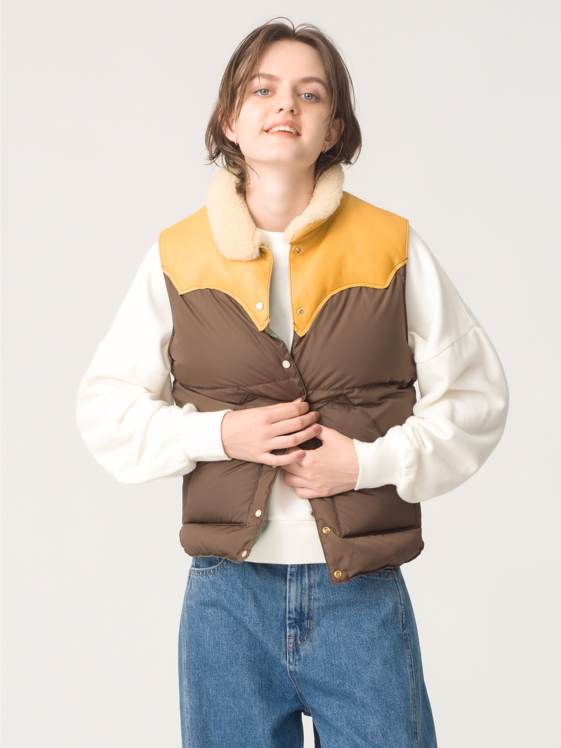 アーカイブアイテムの中から、復刻で別注したスペシャルなクリスティーベストが登場です。表地と裏地のナイロンとヨーク部分のレザーのカラーを選び、配色にしています。スタイリングにカウボーイテイストがプラスされ、デニムボトムとのカジュアルなスタイリングにも好相性です。スウェットやフーディーとのレイヤードも様になります。