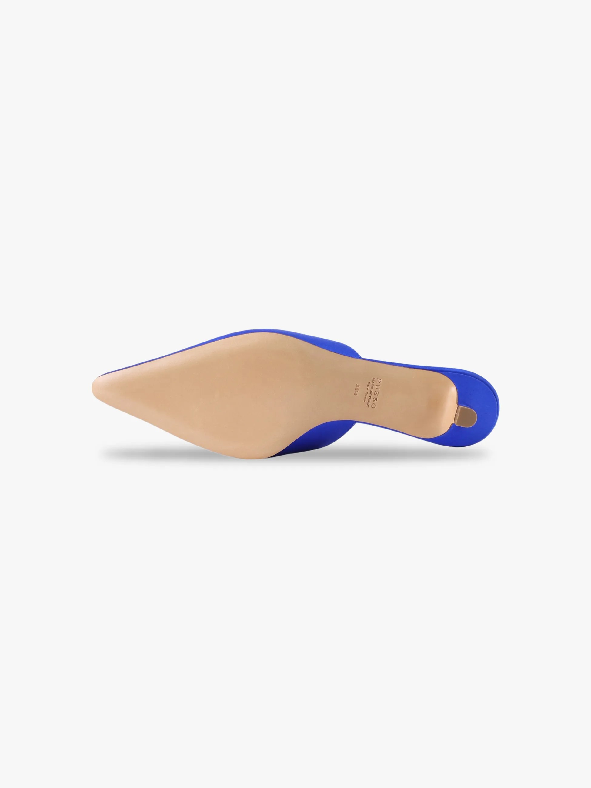 - 目が覚めるような光沢のあるサテンブルーが存在感を醸すヒールミュールは、カジュアルなスタイリングから、ドレスまで幅広いスタイリングに映える1足で、足元に華やかさと上品さをプラスします。Francesco Russoらしい美しいフォルムと馴染みのよい履き心地をぜひお楽しみください。