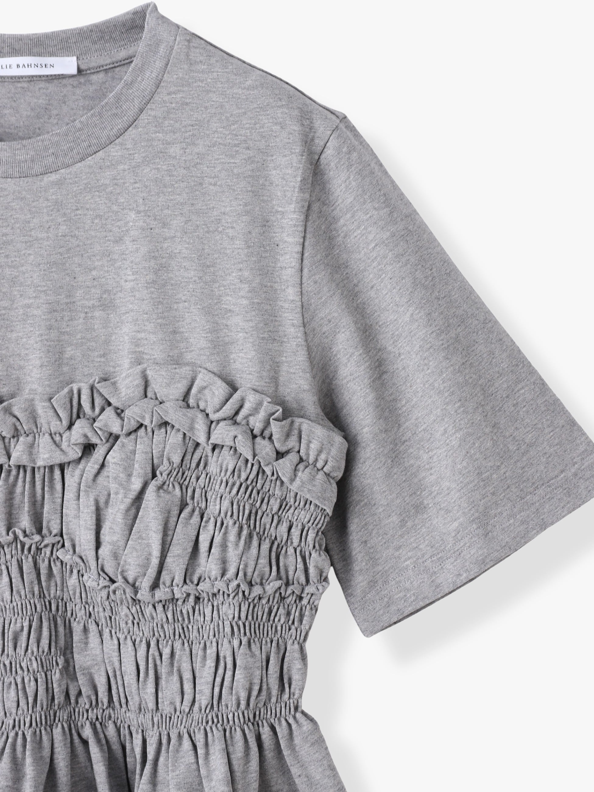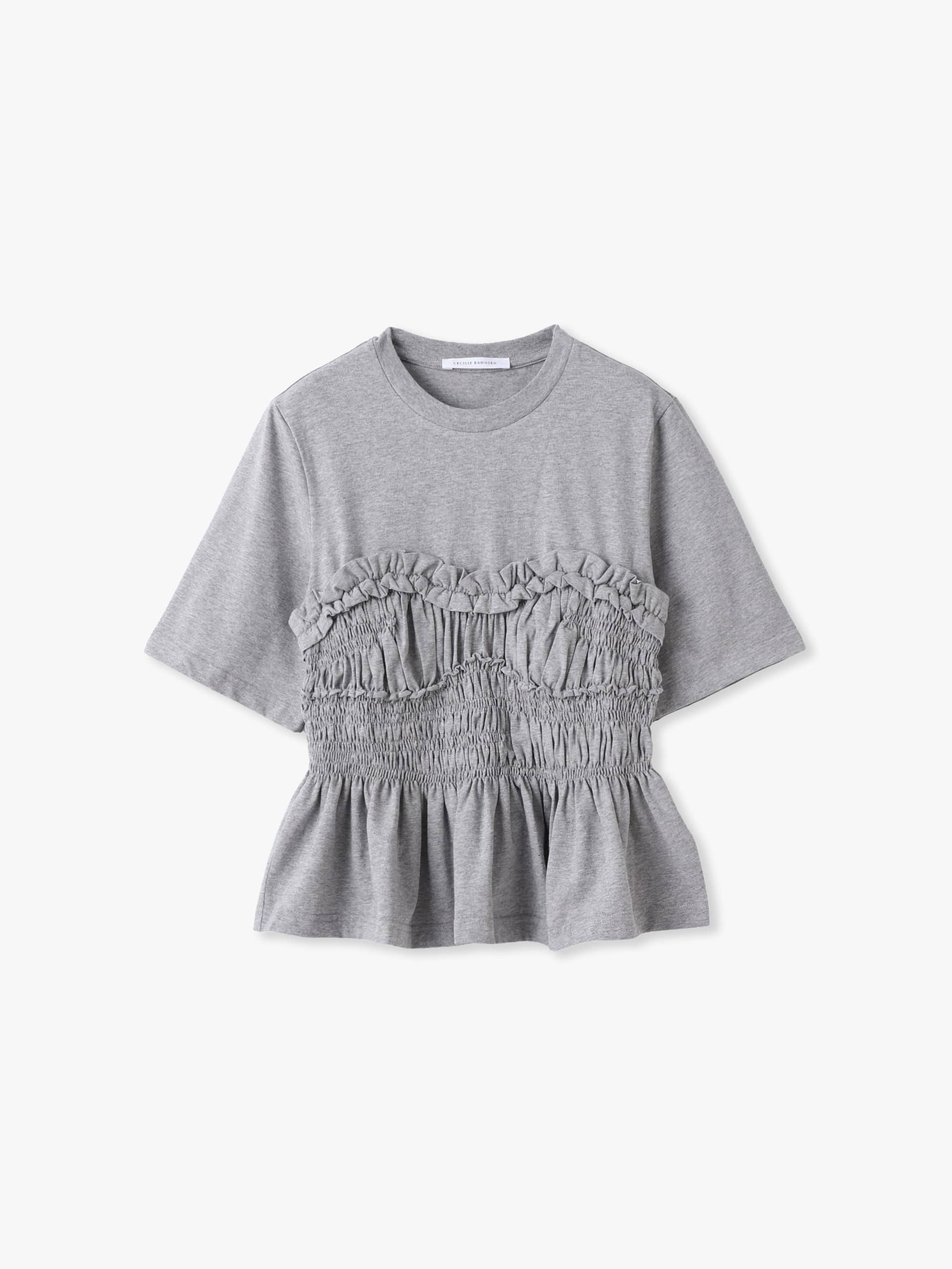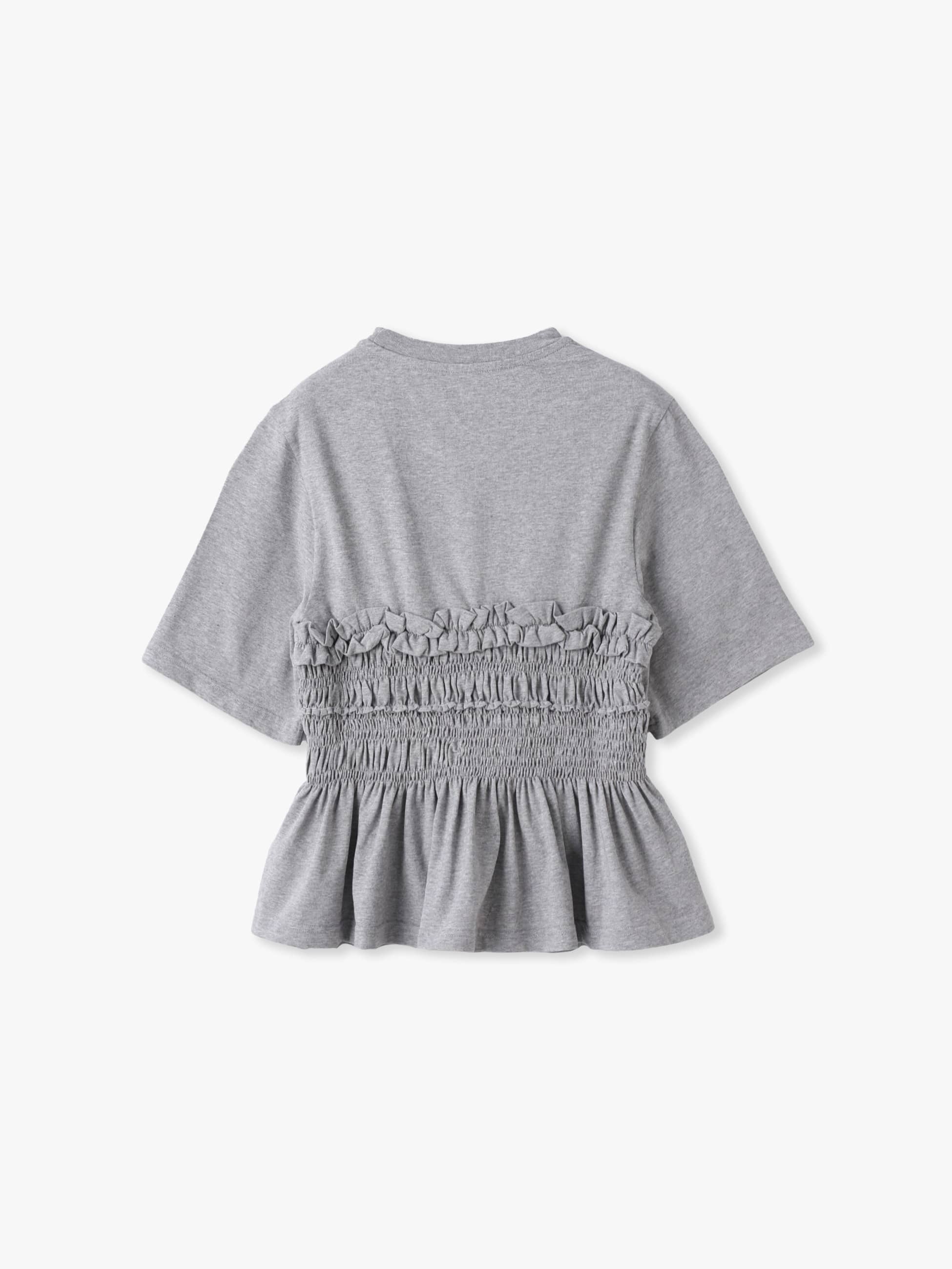 ゴムシャーリングとフリルがたっぷりと施された表情豊かなカットソートップスは、ボディラインに沿うシルエットながら、伸縮性のある柔らかなコットン素材を使用し、着心地の良い一枚です。クロップド丈のペプラムデザインは、ボトムスとバランスが取りやすいのも魅力的です。ライトピンクはこちら