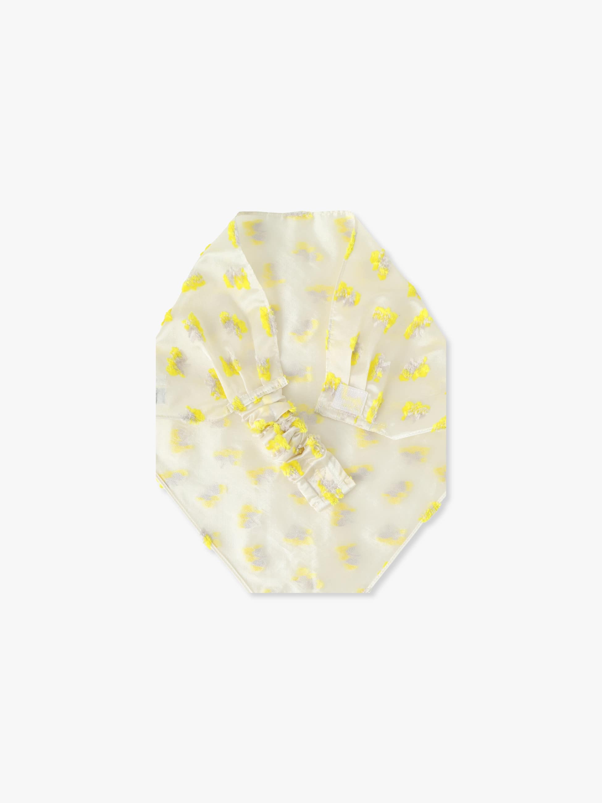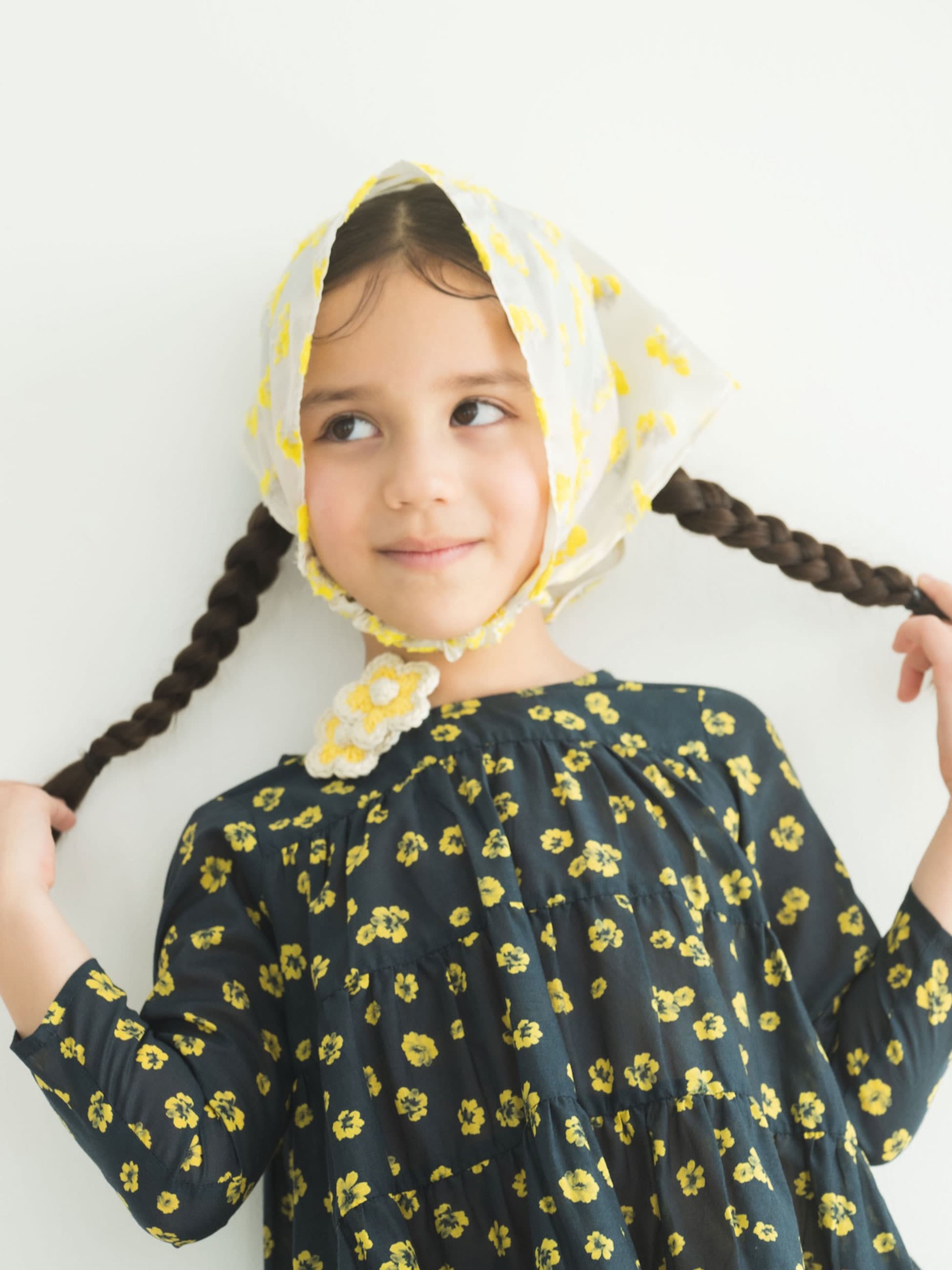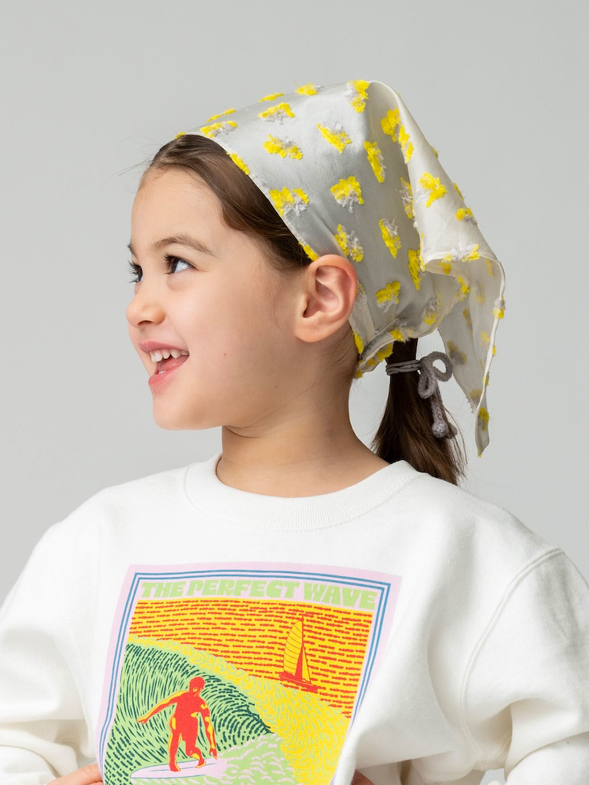 ロンハーマンキッズで別注した特別なアイテムが登場です。立体的なミモザを全体にあしらい、ジャガード生地の豊かな表情を引き立てた三角スカーフは、涼しげで日除け対策として活躍します。ゴムベルトが付いているため、やさしくフィットし、頭にかぶったり、スカーフを巻いているように見せたりと、ワンタッチ仕様なのでお子さまでも簡単に着脱ができます。春夏のキッズたちのコーディネートに華やかなアクセントを添えます。