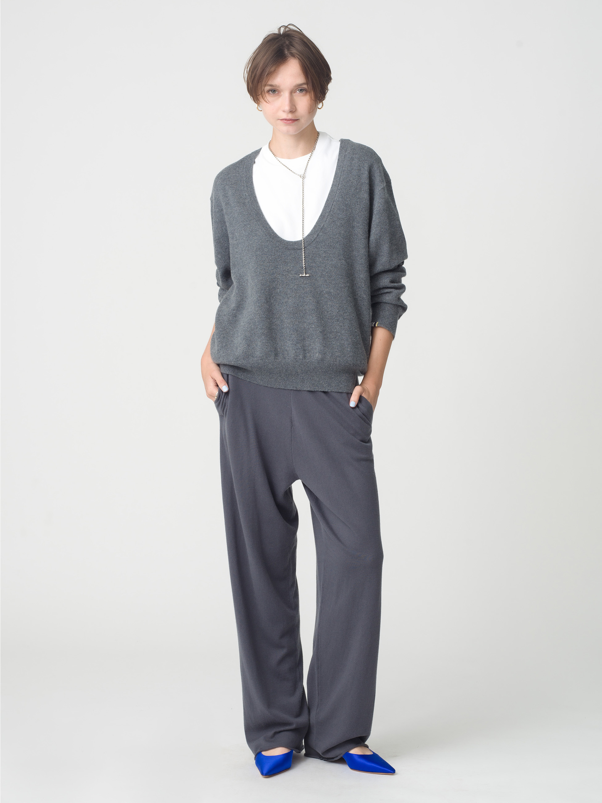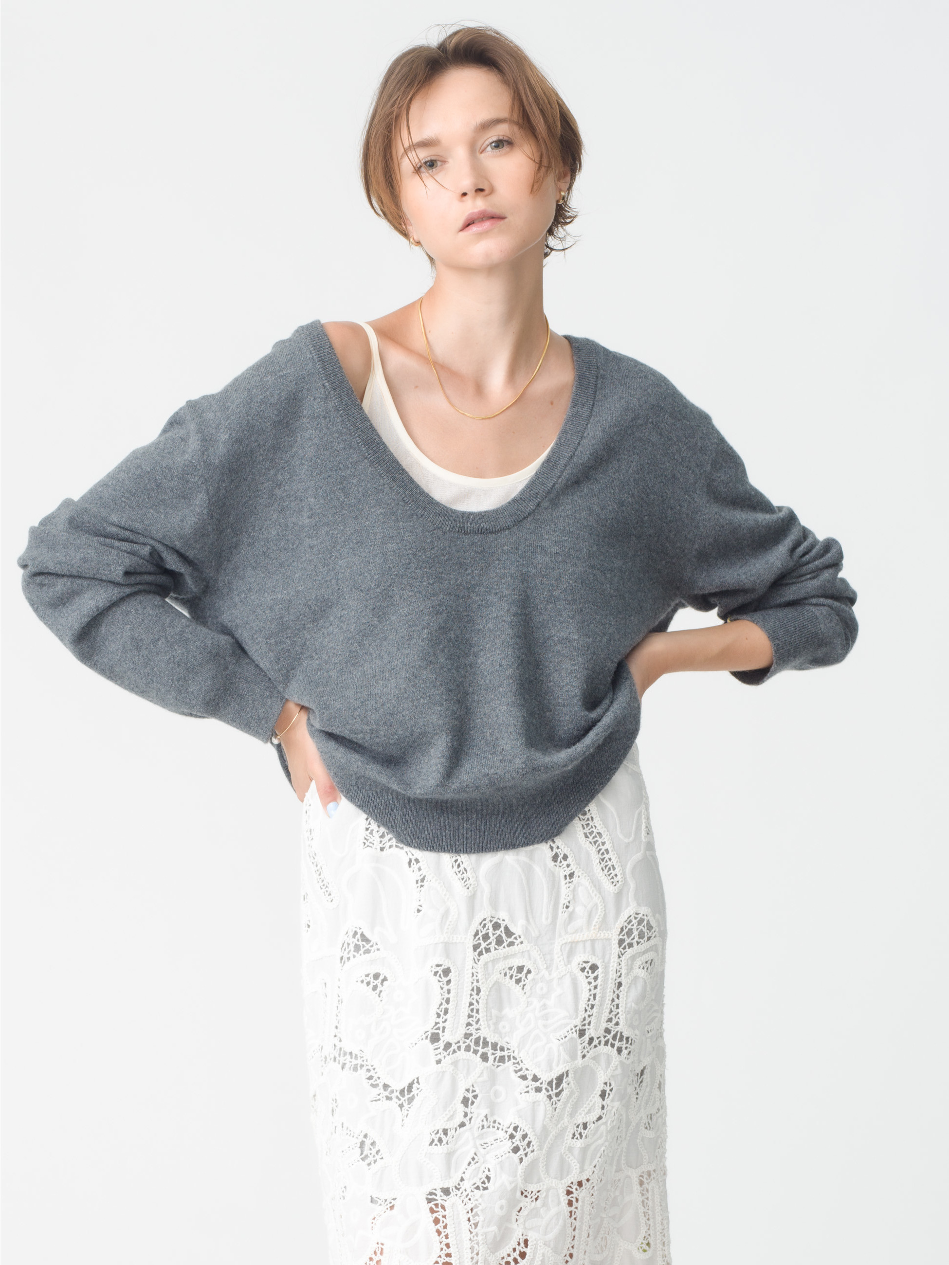 - 軽くて暖かく心地の良いカシミア素材を使用したニットトップスは、深めのスクープネックラインがデコルテまわりを美しく引き立て、リラックス感のあるシルエットを演出します。無地Tシャツはもちろん、ビンテージのプリントTシャツをレイヤードした遊び心のあるスタイリングをお楽しみいただけます。