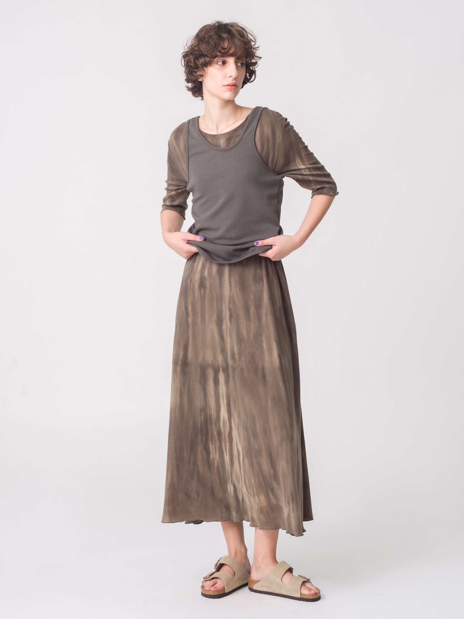 - 冬のカリフォルニアの自然をイメージし、一枚一枚丁寧に手染めされた、カット素材のワンピースです。バスト下からの広がりを美しく、カジュアル感を抑えて、品の良さを感じていただける1枚に仕上げています。同シリーズのタンクトップもございます。