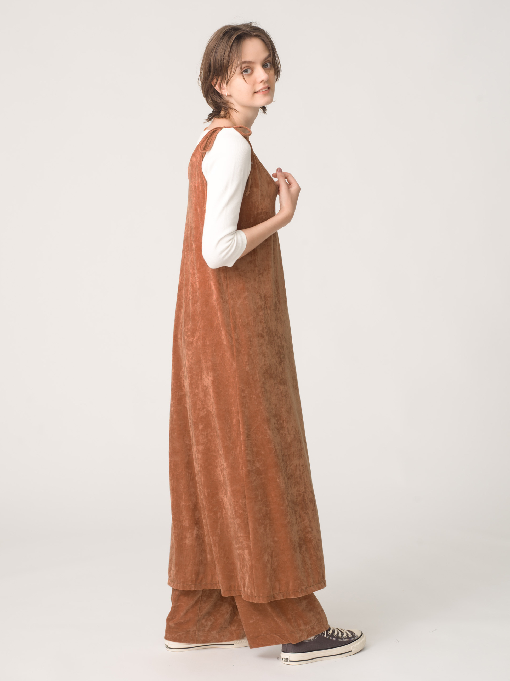 - 通常のベロアよりもカジュアルで、独特の風合いが特徴のクラッシュベロアを使用したキャミソールワンピースです。プリントのロングスリーブTシャツ+デニムなど、ルーズにレイヤードしていただくのもおすすめです。寒い時期はロングスカートとして、ワンピースの上からざっくりトップスを被せて着用したりなど、さまざまなスタイリングをお楽しみいただけ、華やかさをプラスする1着です。同素材のイージーパンツもございます。