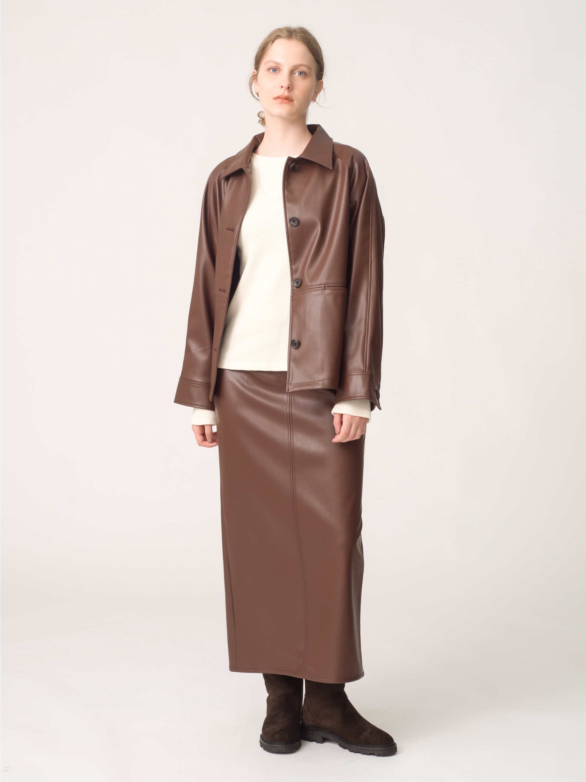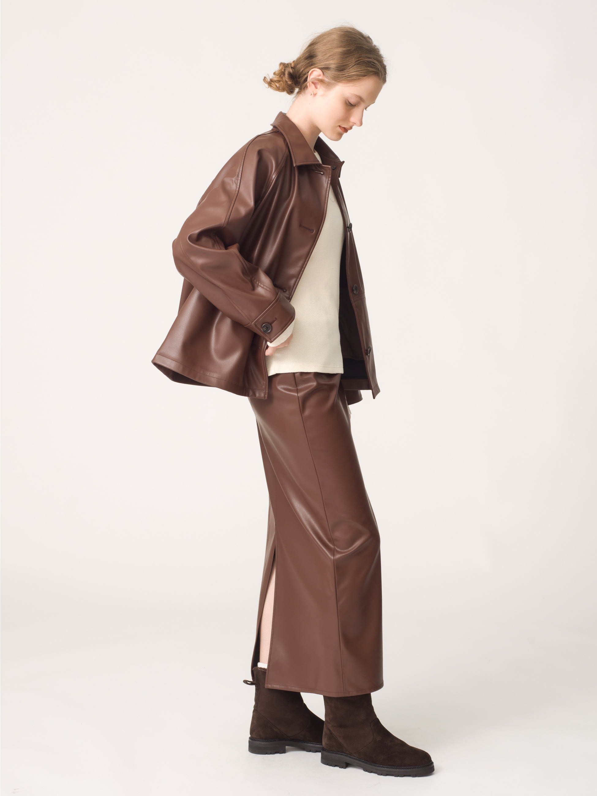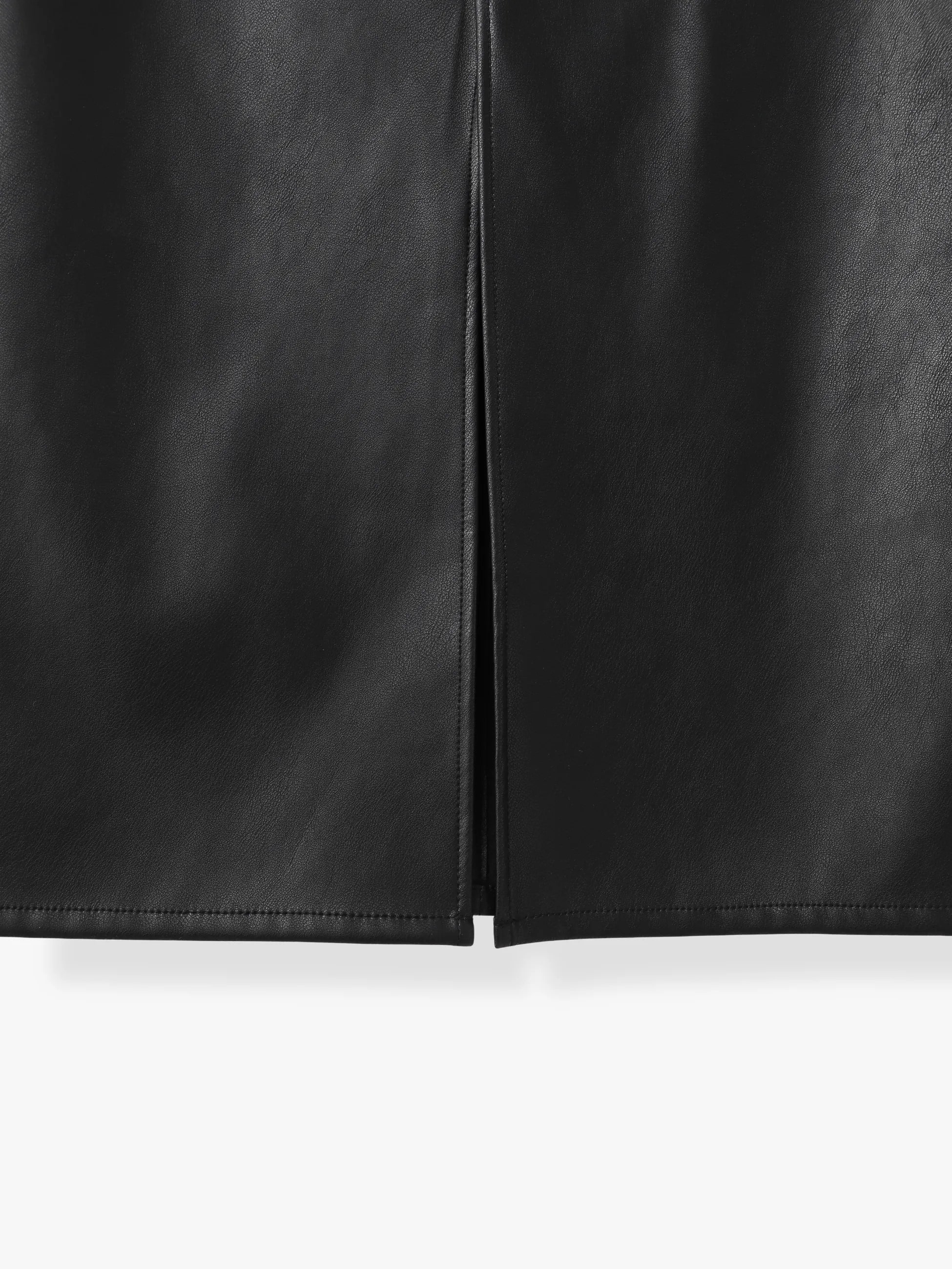 フェイクレザーのタイトスカートは、女性らしいIラインシルエットが、カジュアルなスウェットやニットとも好相性で、スタイリングを引き締めます。ストレッチの入った柔らかな素材に、バックスリット入りで足捌きも良く、ストレスフリーな穿き心地です。同シリーズのボクシージャケットとセットアップでも着用していただけます。