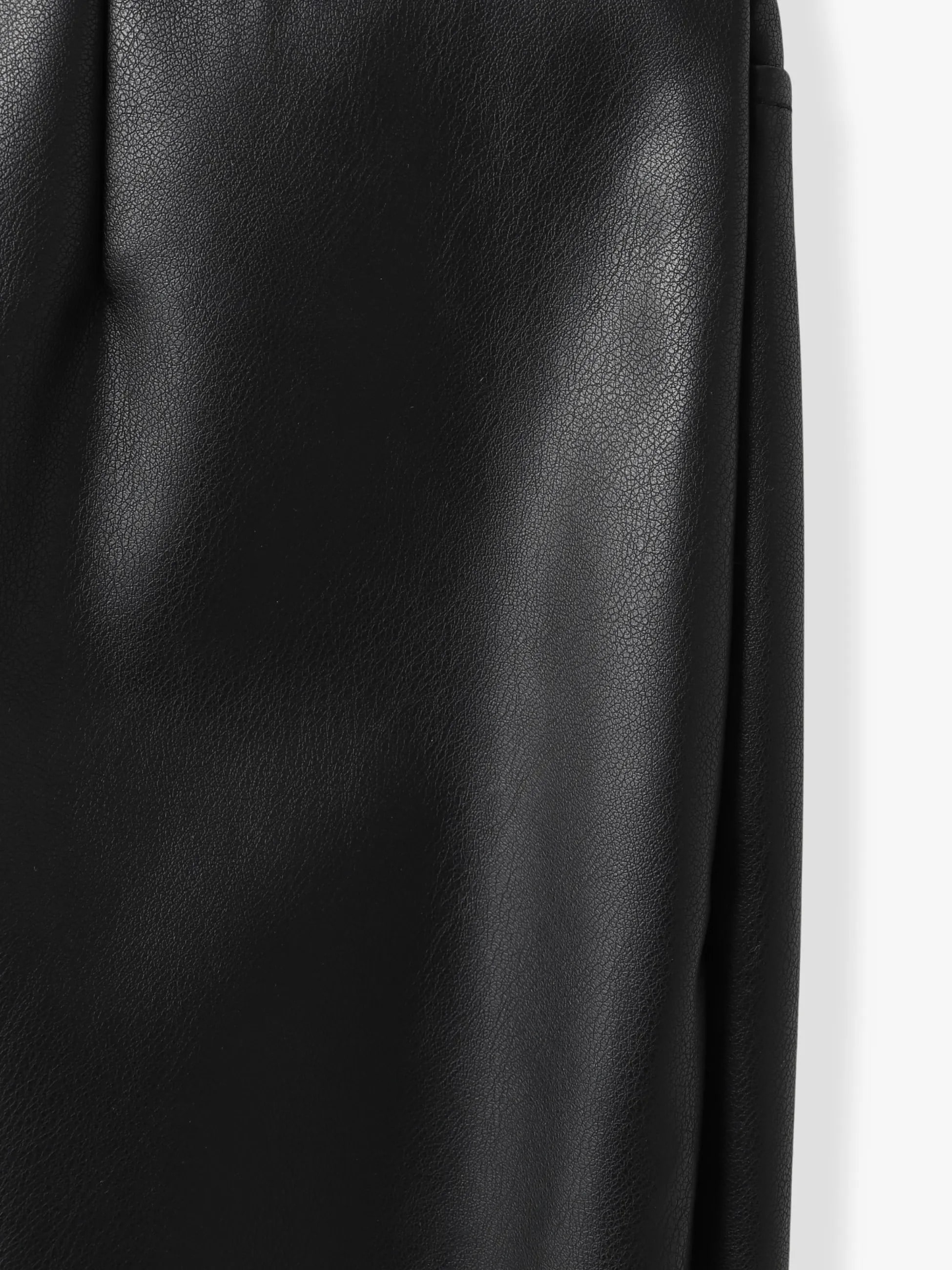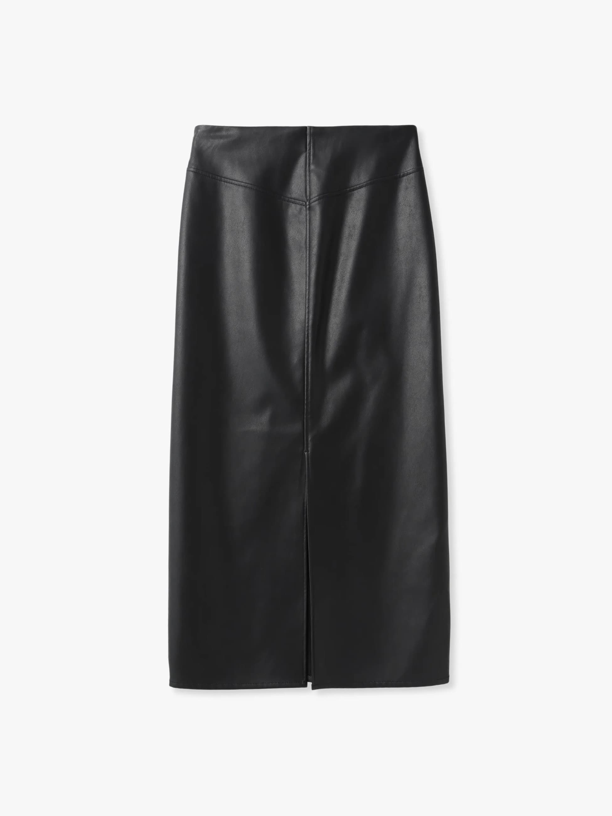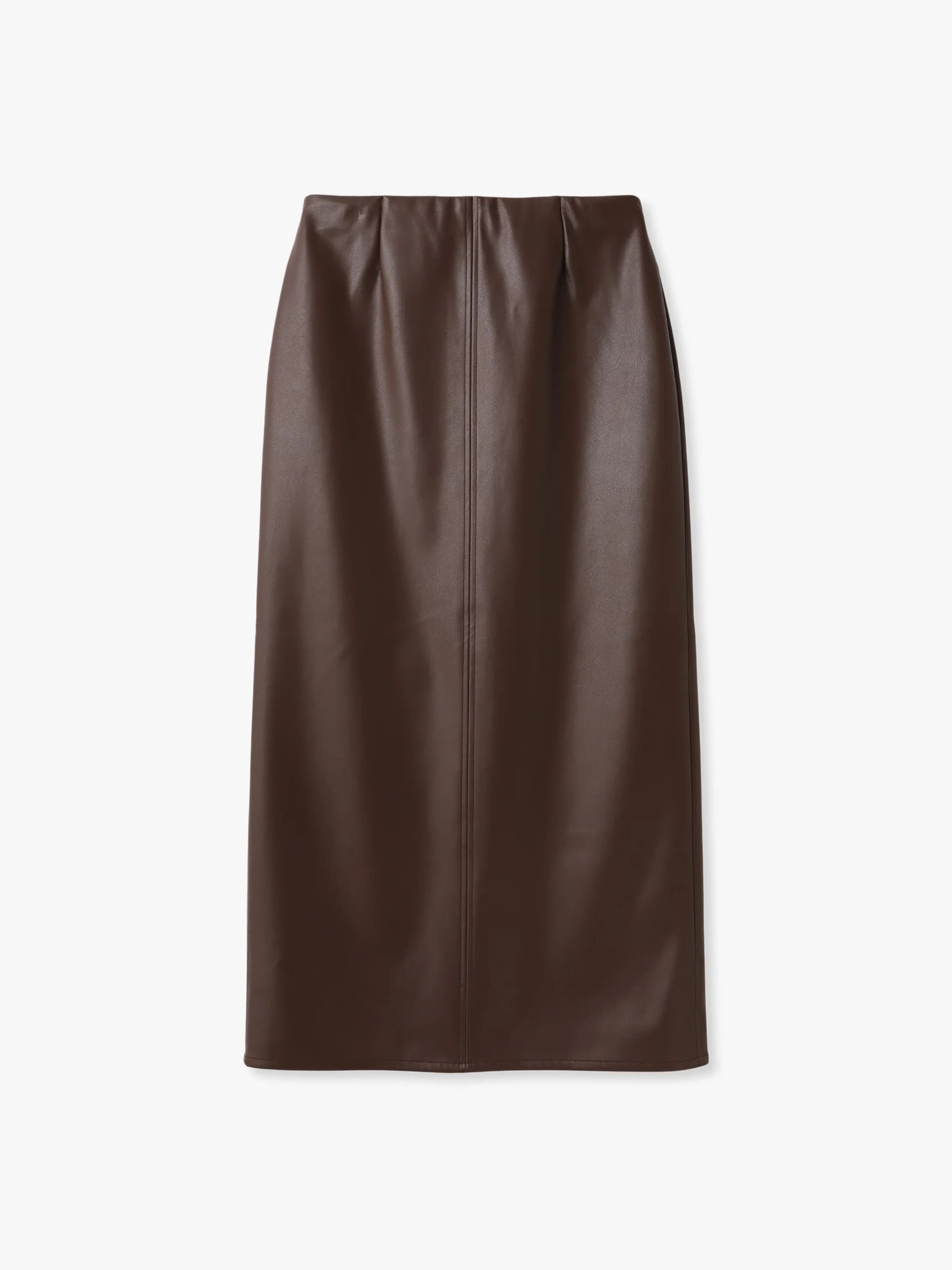 フェイクレザーのタイトスカートは、女性らしいIラインシルエットが、カジュアルなスウェットやニットとも好相性で、スタイリングを引き締めます。ストレッチの入った柔らかな素材に、バックスリット入りで足捌きも良く、ストレスフリーな穿き心地です。同シリーズのボクシージャケットとセットアップでも着用していただけます。