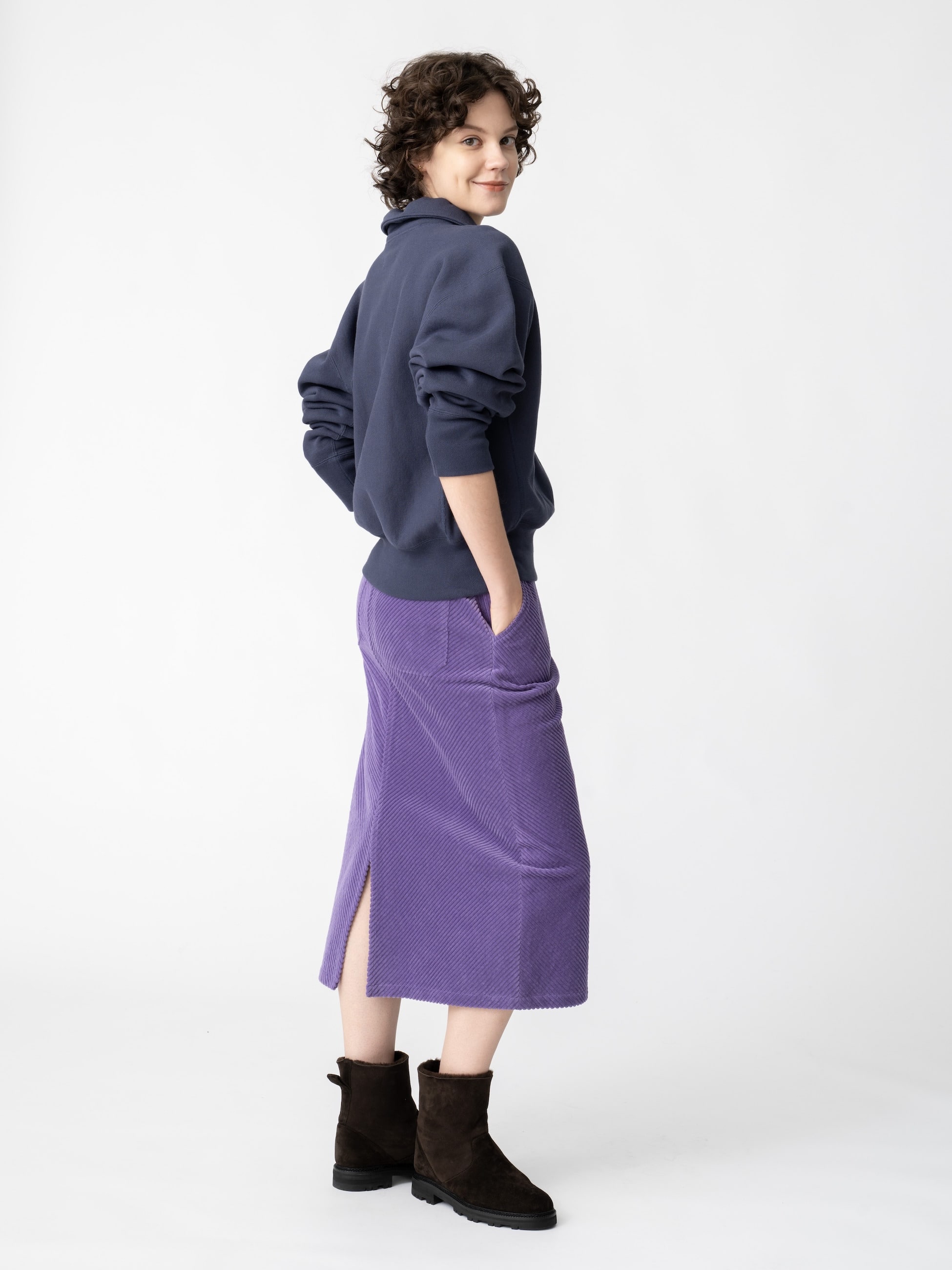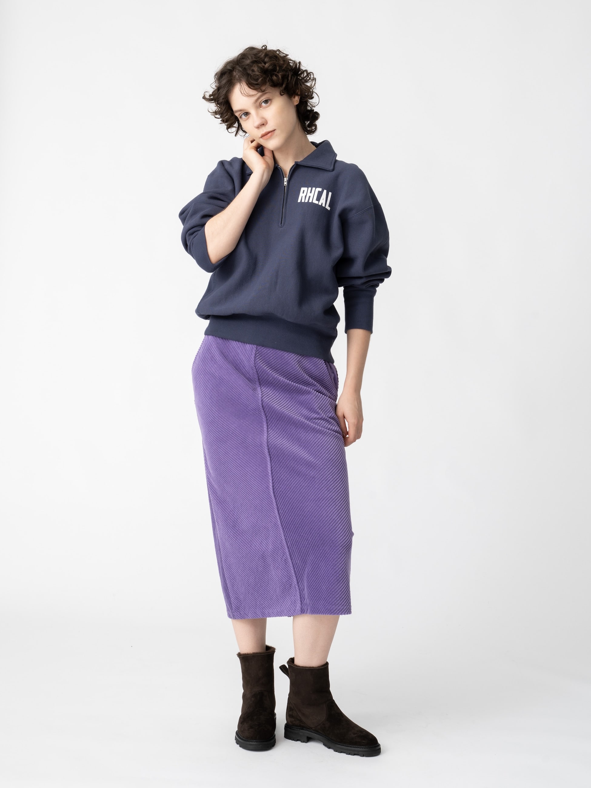 - オーガニックコットンの柔らかく肌触りの良い太畝のコーデュロイ素材を使用したミディ丈のスカートです。すっきりとしたシルエットで、オーバーサイズのニットやスウェットトップスとも好相性です。RHCらしい鮮やかなパープルは、ダークトンになりがちな冬の装いに遊び心をプラスします。同シリーズのワイドパンツもございます。