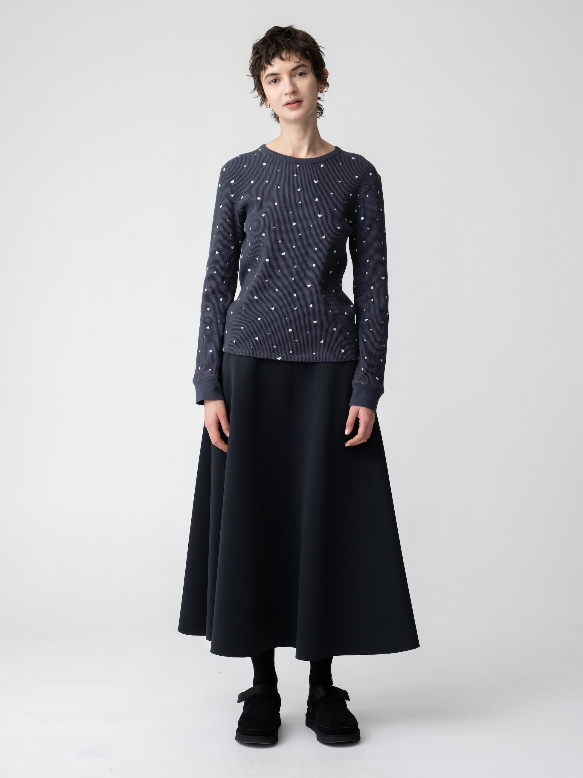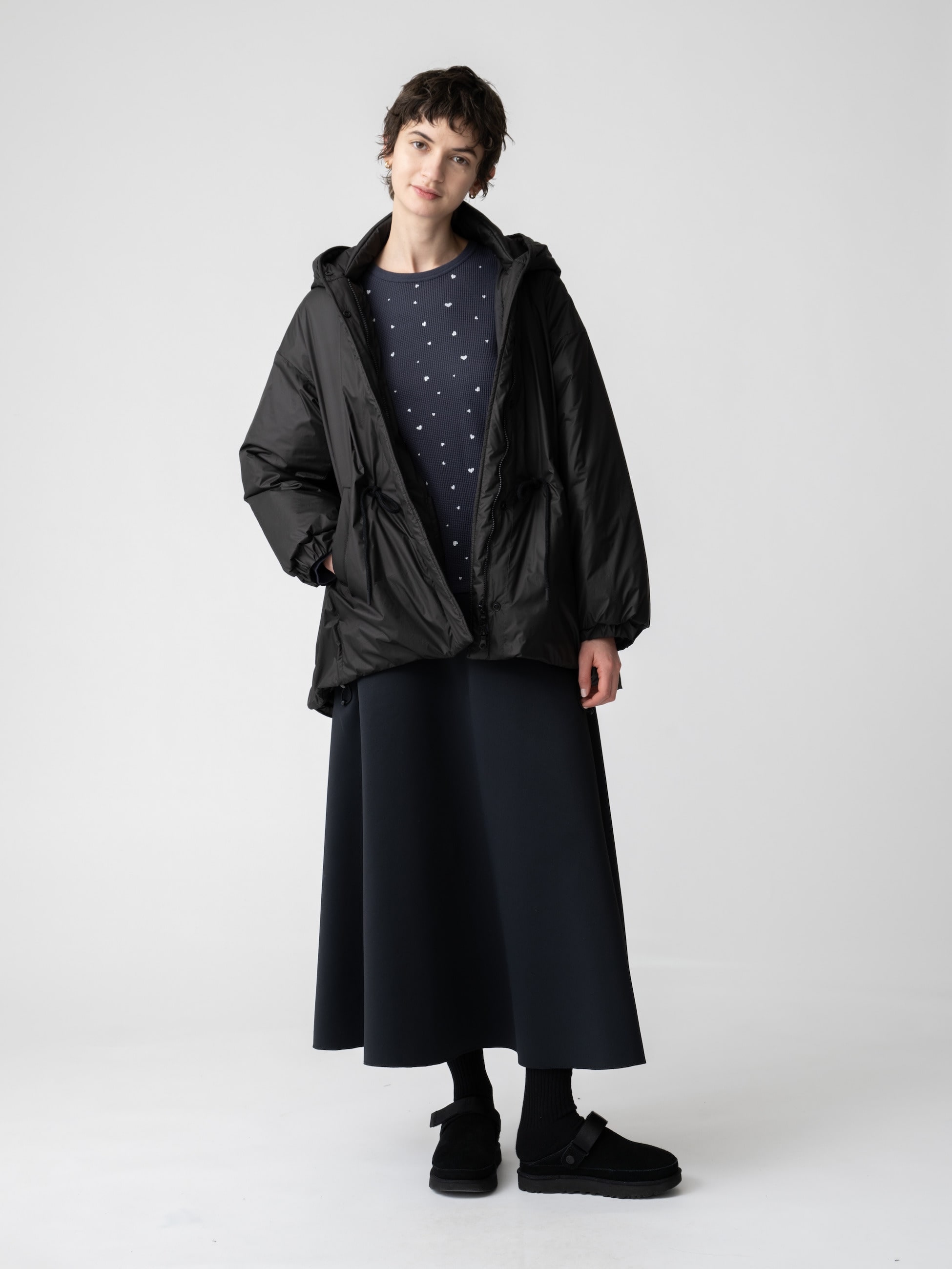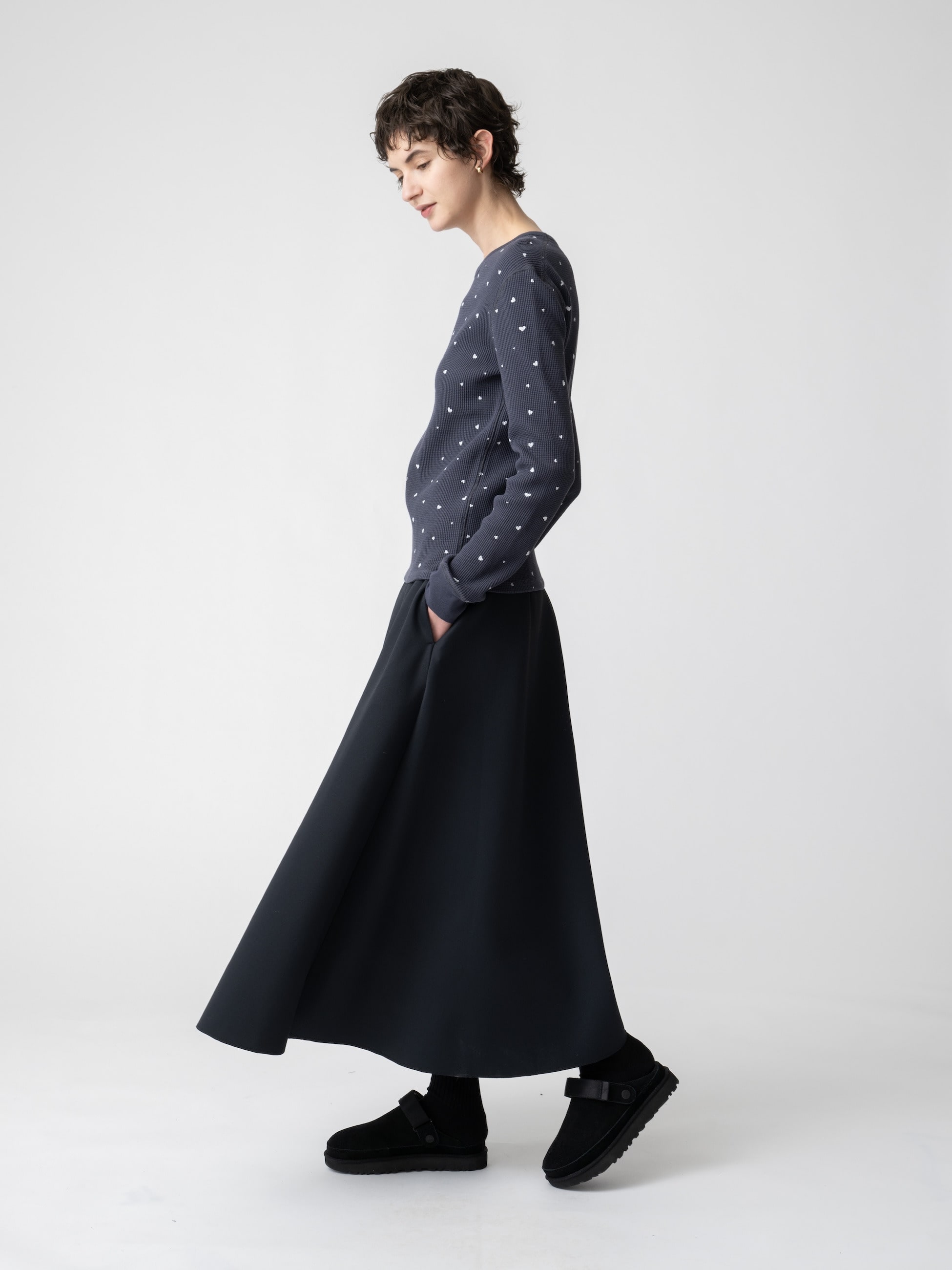 程よくハリのあるキレイ目な印象のロングスカートは、リサイクルポリエステルを使用したベアダンボール素材で仕立て、美しいフレアシルエットを演出します。ベーシックなアイボリーとブラックの2色展開で、合わせるトップスを選ばず、スタイリングに女性らしい上品さを添える一枚です。
