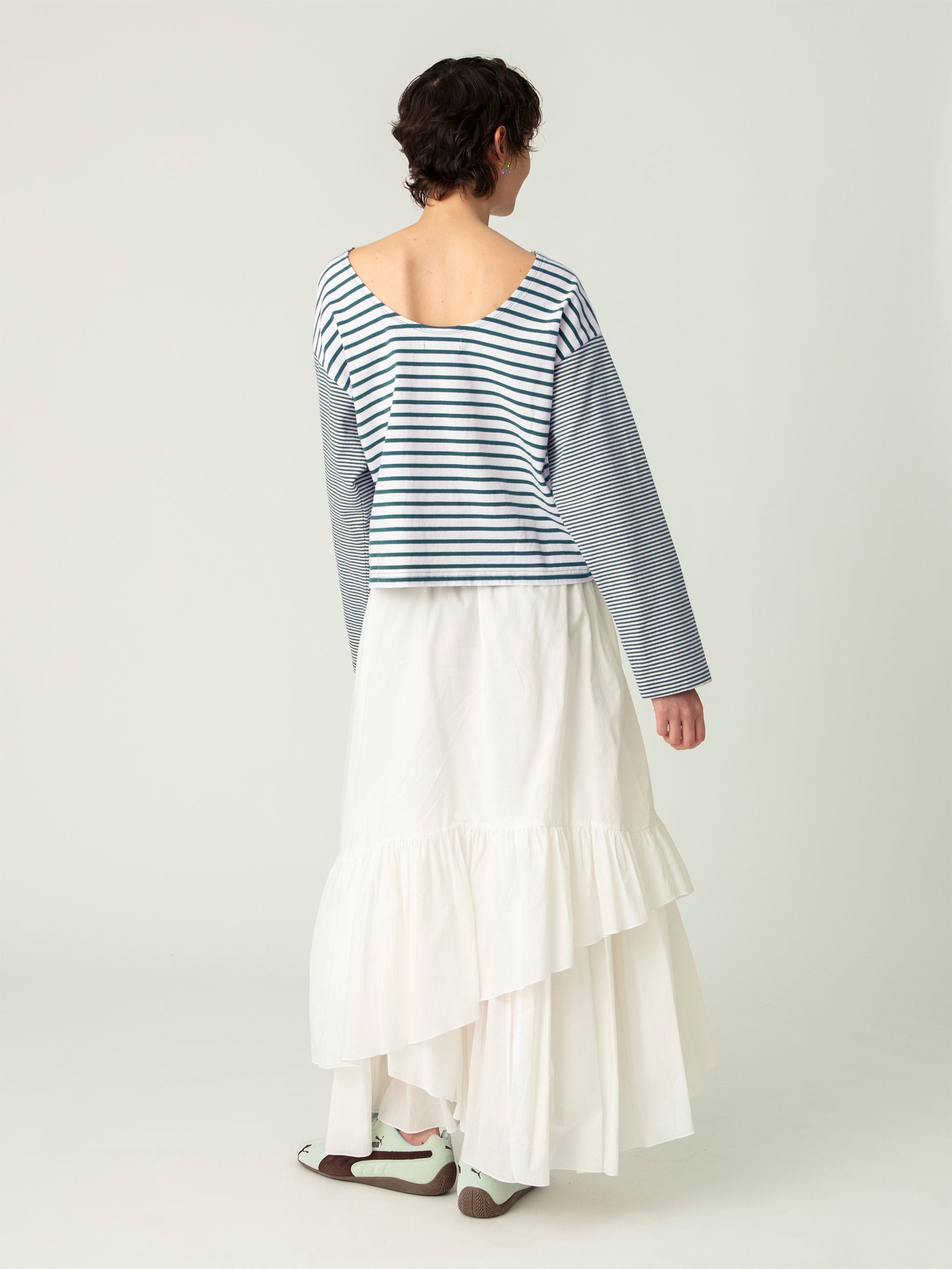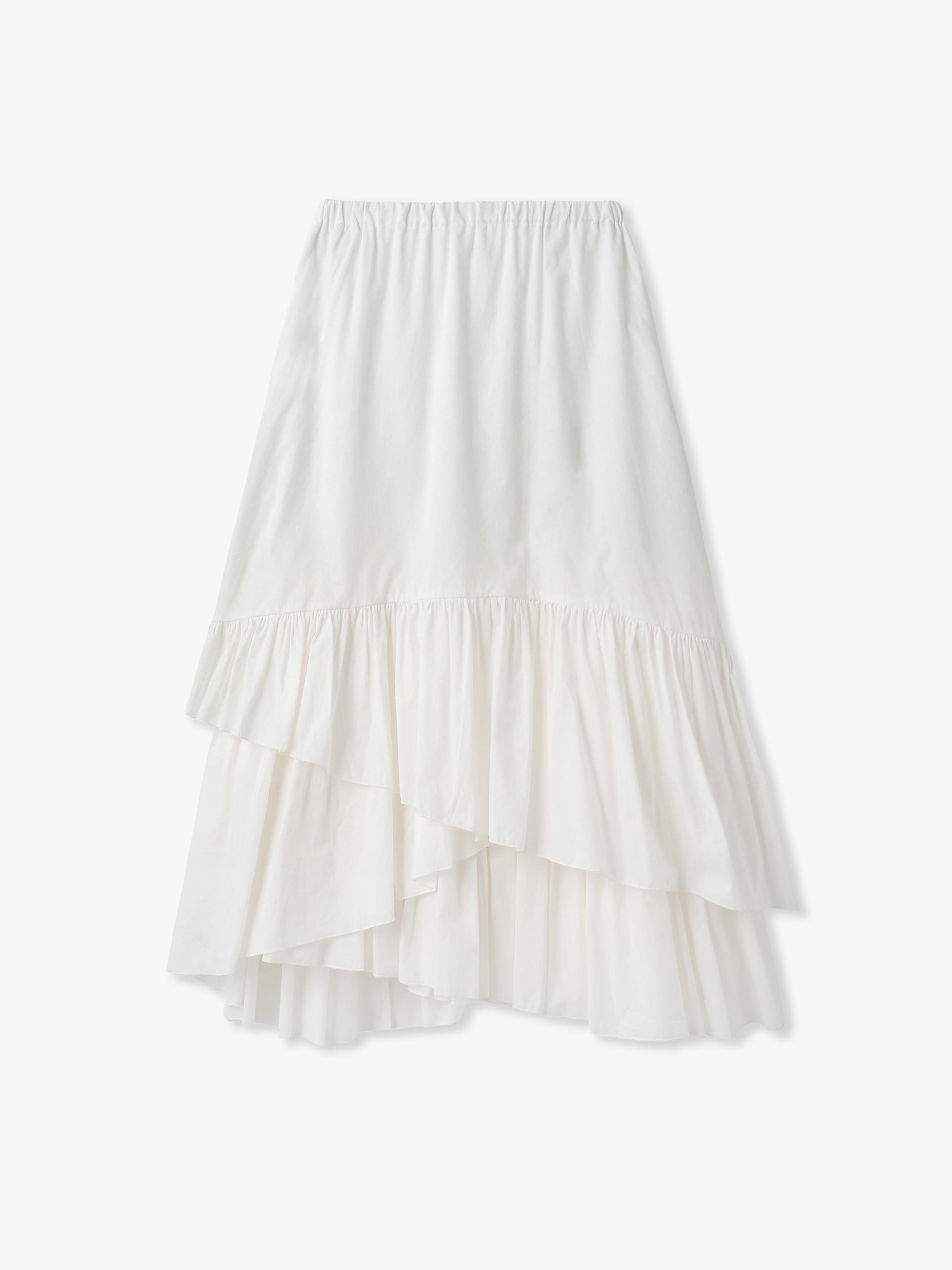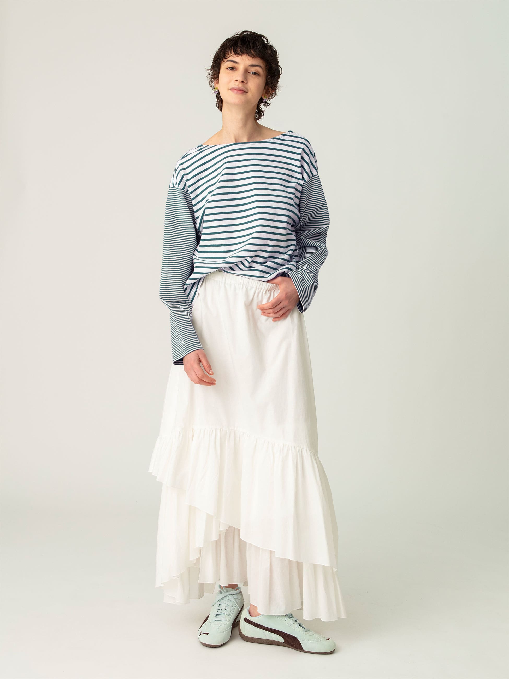 歩くたびにふわりと揺れるティアードシルエットが可愛らしいロングスカートは、春らしく爽やかなホワイトとブルーの2色展開で、花びらを重ねたような華やかなギャザーデザインが存在感抜群です。RHC ロンハーマンらしくオーバーサイズのスウェットやTシャツなど、カジュアルなアイテムと好相性で、季節を問わず着回しのきくアイテムです。