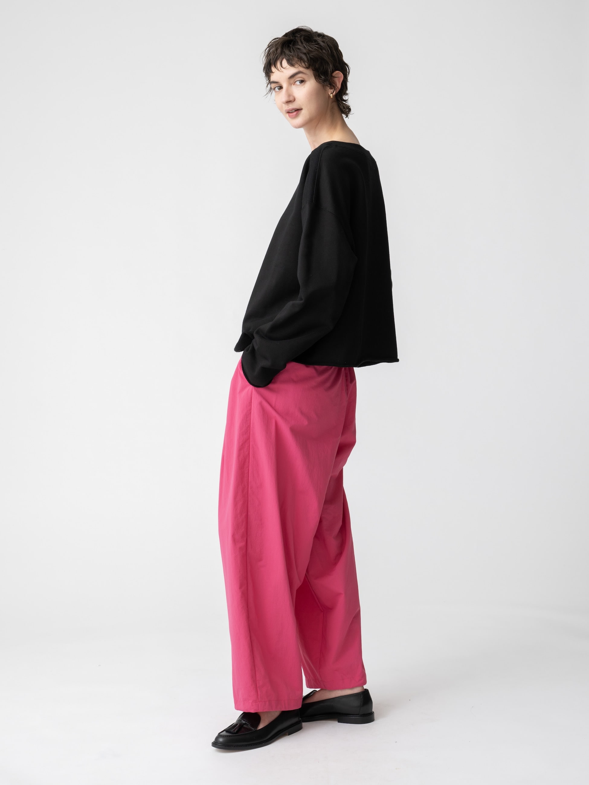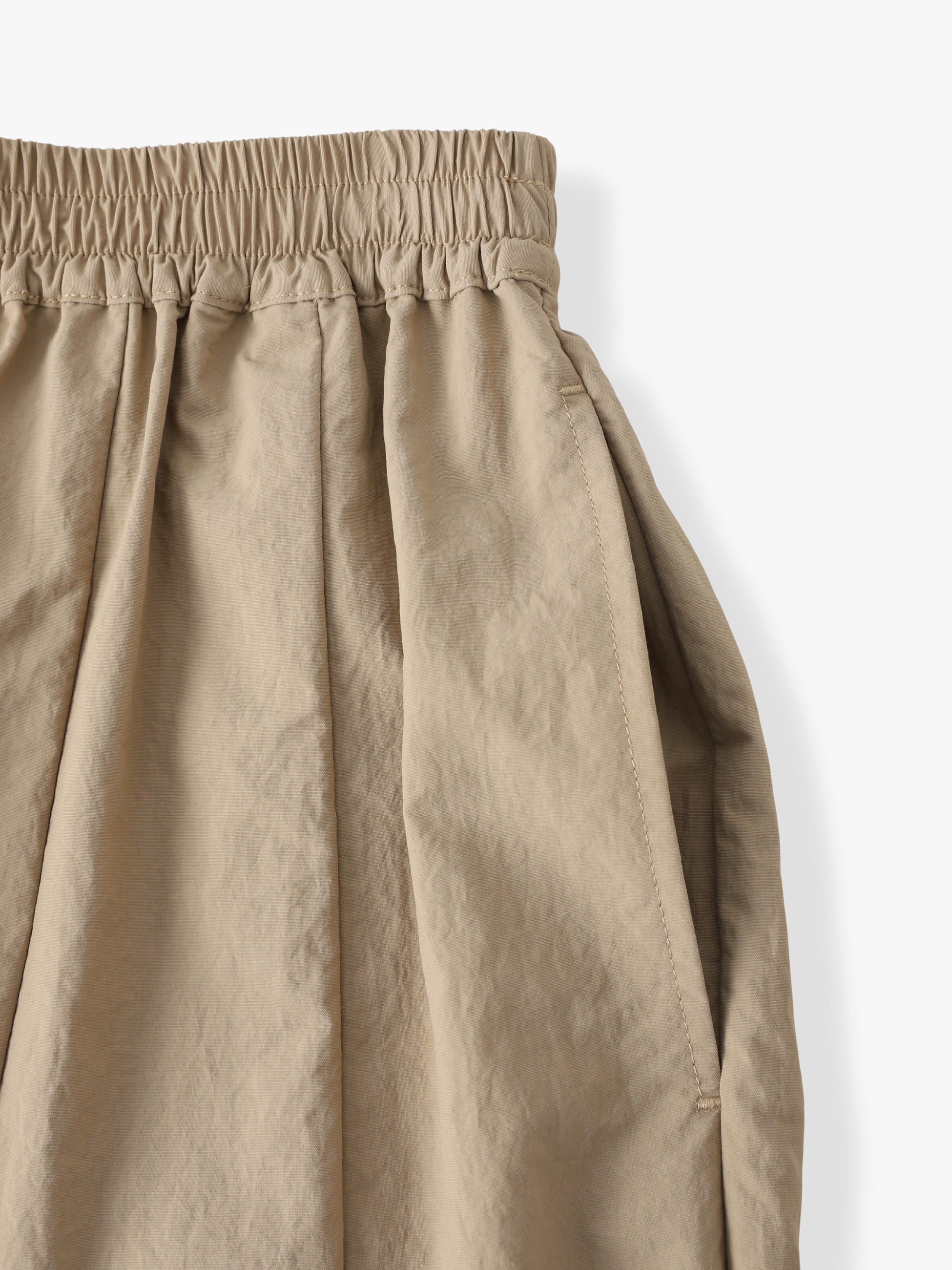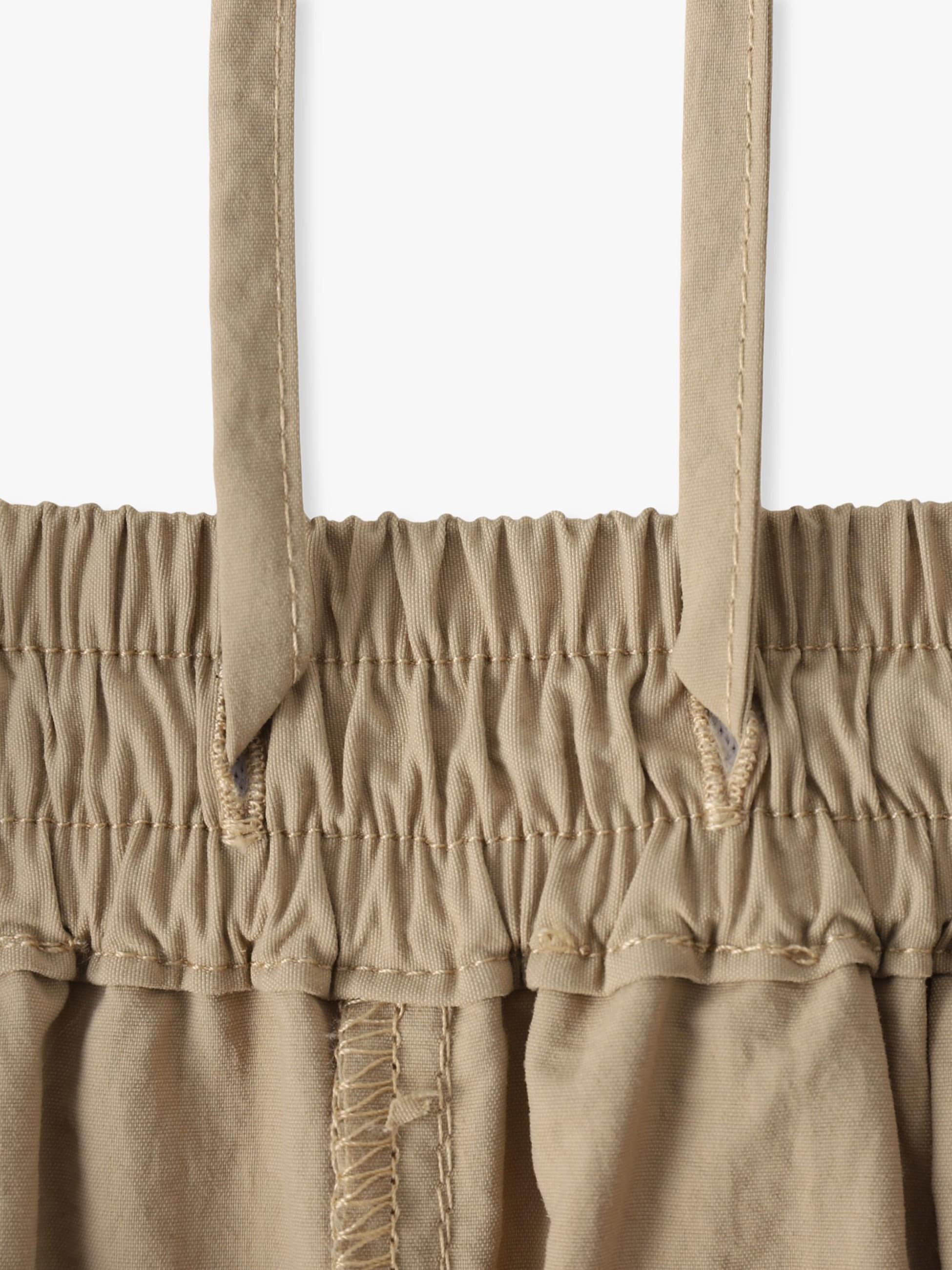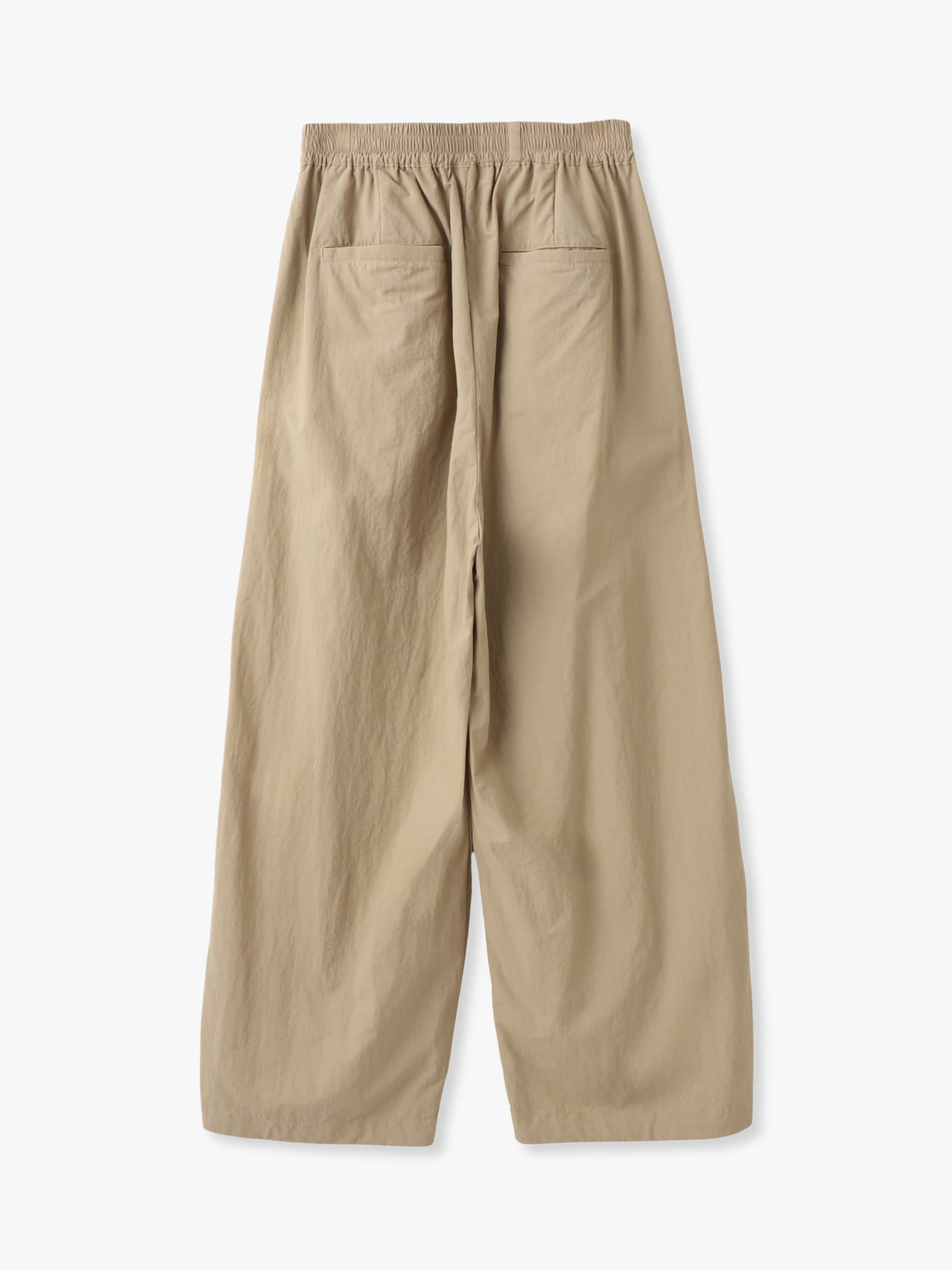 ゆったりとしたリラックスフィットのイージーパンツは、ウエストがゴム仕様でストレスが無く、快適に穿いていただけます。リサイクルナイロンを使用した軽い着心地で、裾部分には紐を通しているため、締めて丈感を変えたり、シルエットのアレンジも可能です。