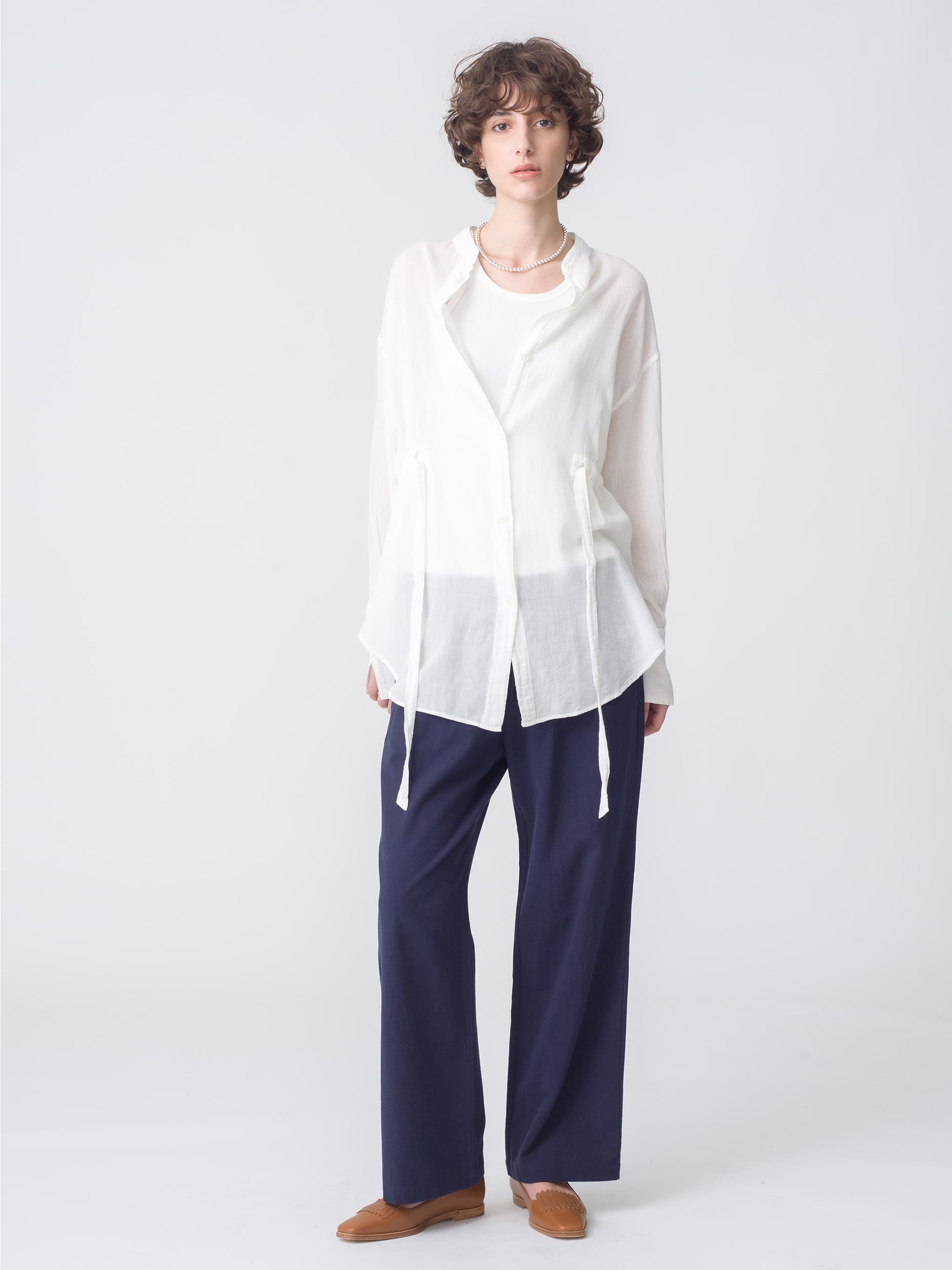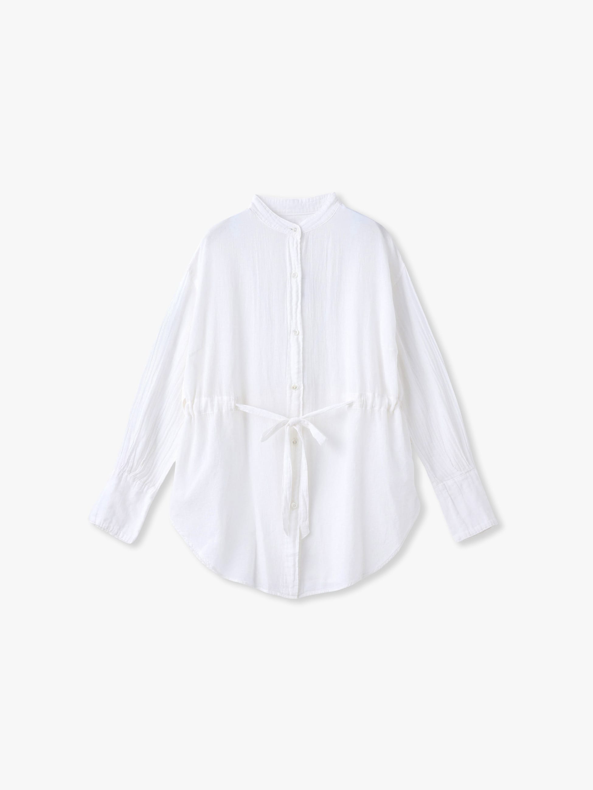 2024FWシーズンに好評だったシアーシャツがブラッシュアップして今季も登場です。襟をなくして羽織りやすくなり、より大きめにつくって抜け感をプラスしました。やわらかな肌触りのコットンを使用した、程よいシアー生地。ドレスシャツのような長めのカフスでエレガントさを加え、ウエストはドローストリング仕様なので絞ってシルエットを調整いただけます。ノースリーブを合わせたときに肩回りをカバーし、日差しや冷房対策にもおすすめです。