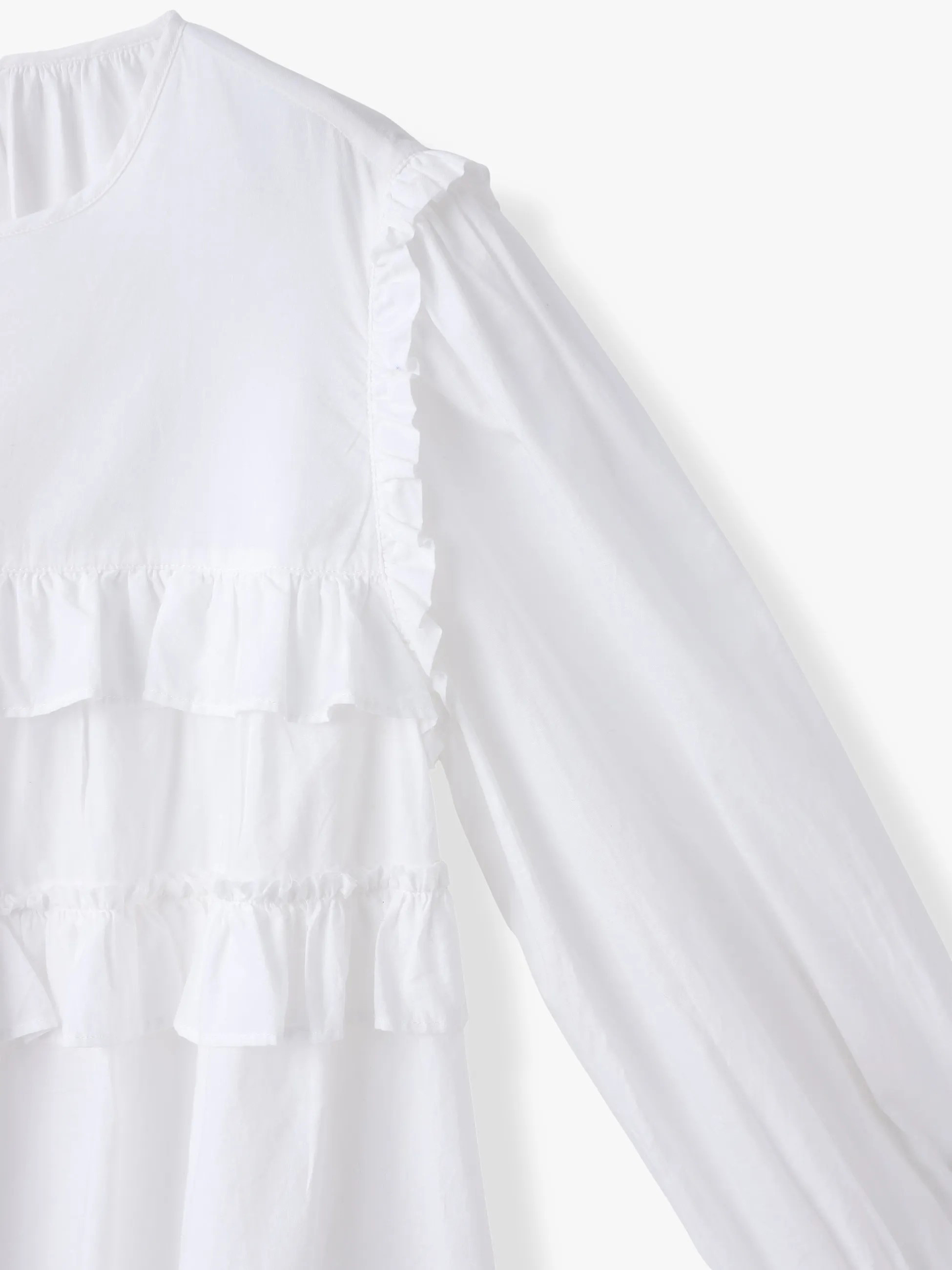 - フリル使いがデザインポイントのブラウスは、程よく甘さがあり、装いを華やかに仕上げてくれる1着です。春や秋はもちろん、少し肌寒い日にも活躍し、レイヤード使いで、袖先を見せるスタイリングもおすすめです。