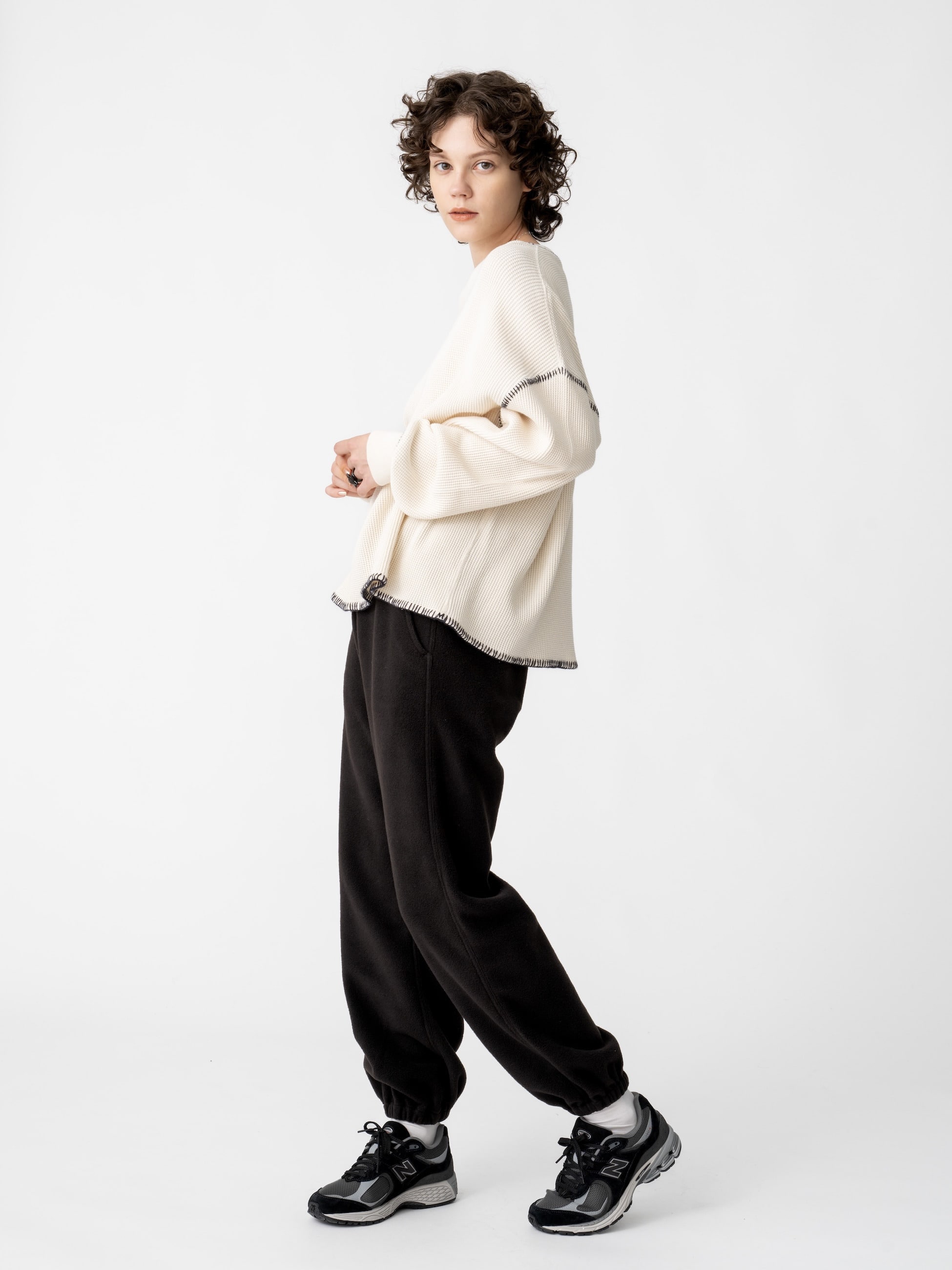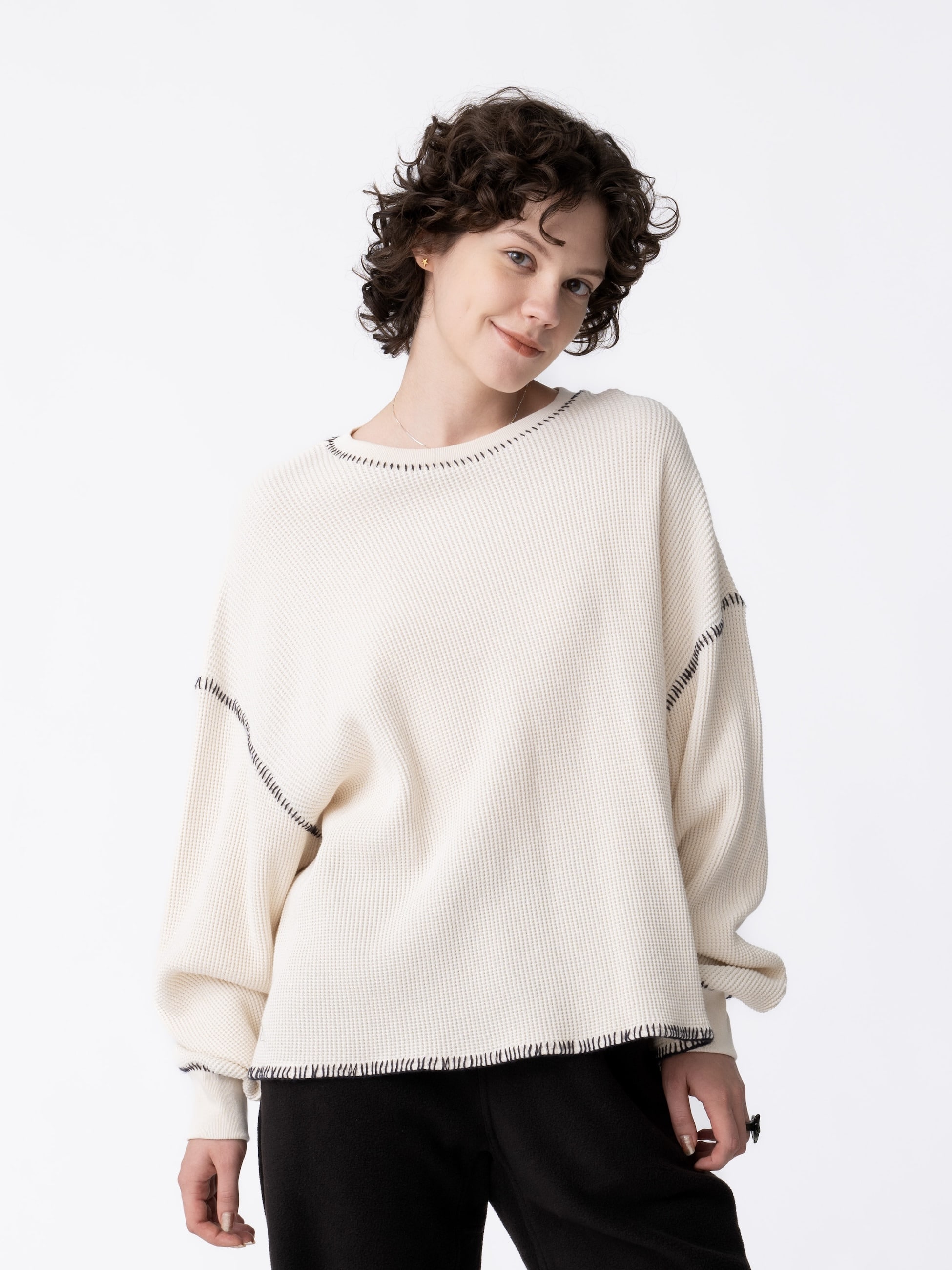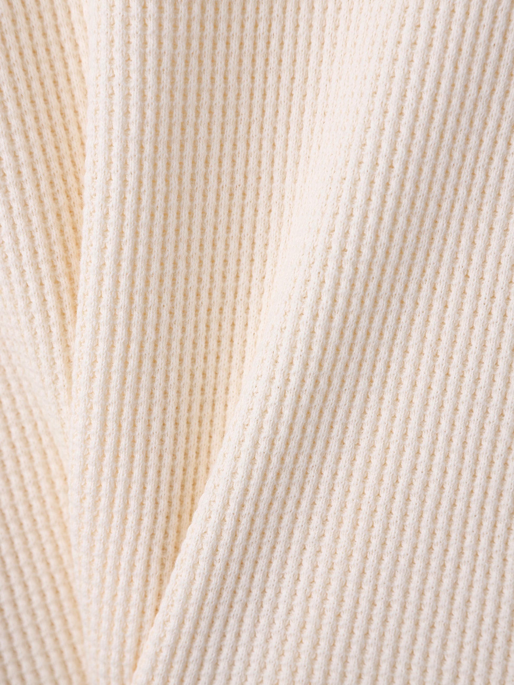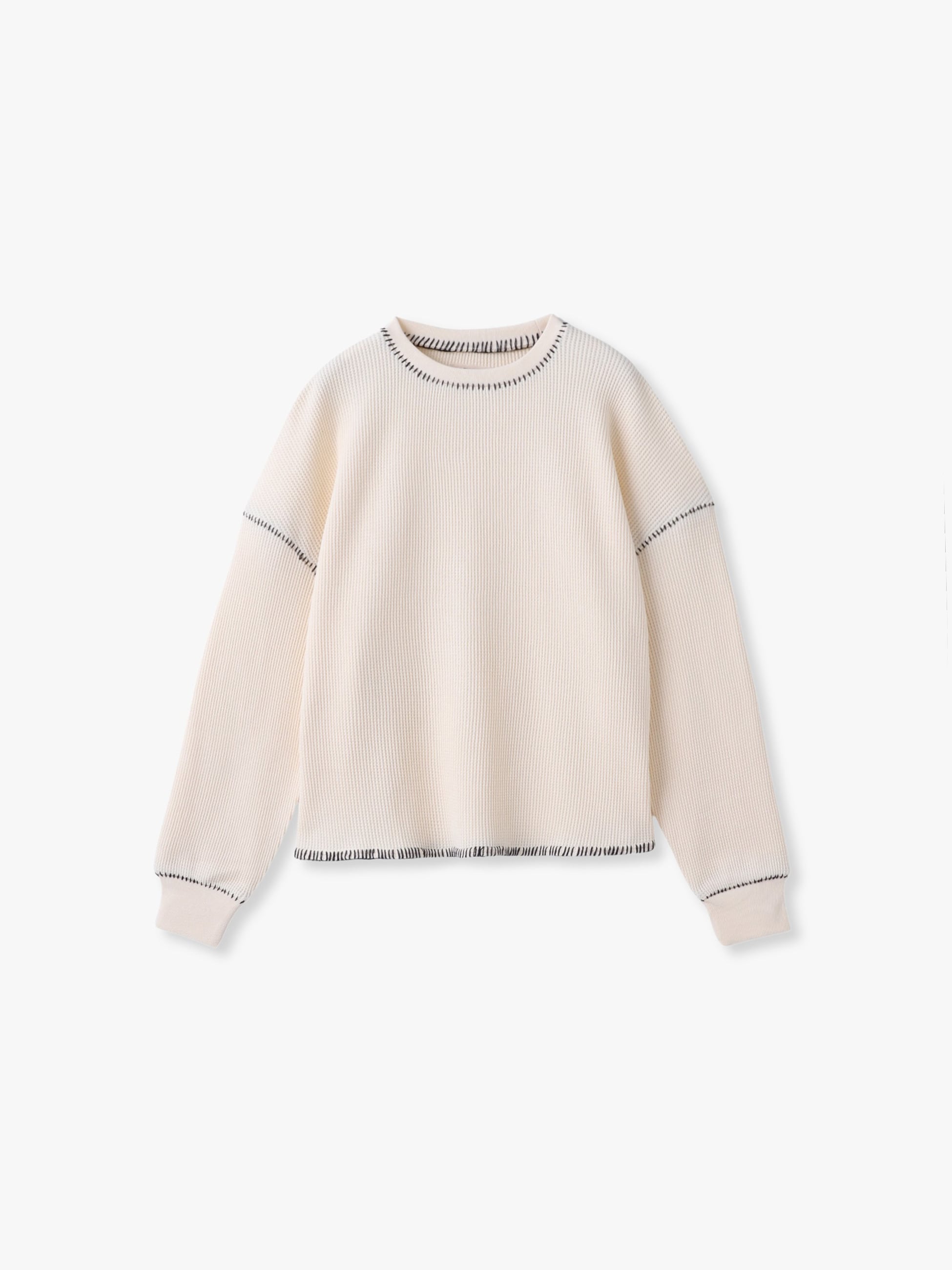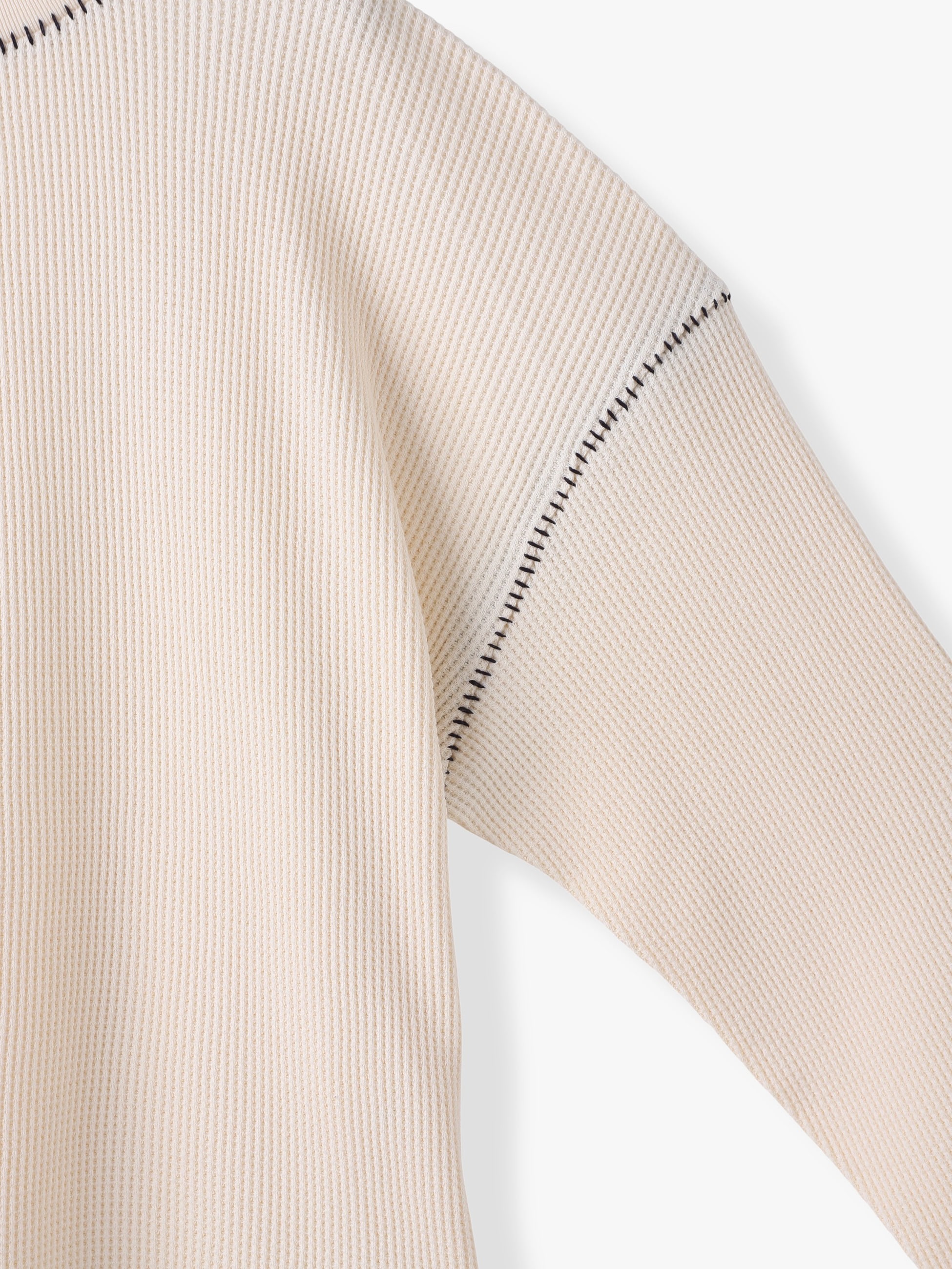- さらっとしたドライな肌触りと、ふっくらとした風合いが特徴のオープンエンド糸を使用したワッフル素材のプルオーバーは、ラフなシルエットでストレスフリーな着心地です。季節の変わり目にも活躍し、存在感のあるブランケットステッチが、スタイリングにアクセントを添える一枚です。
